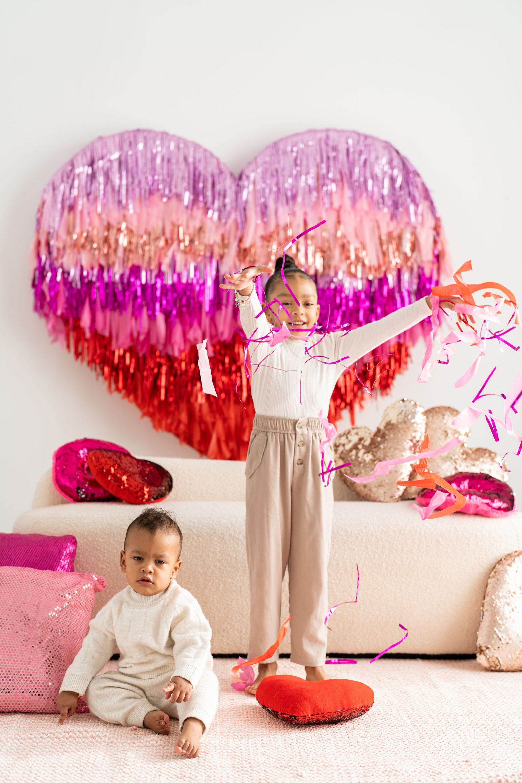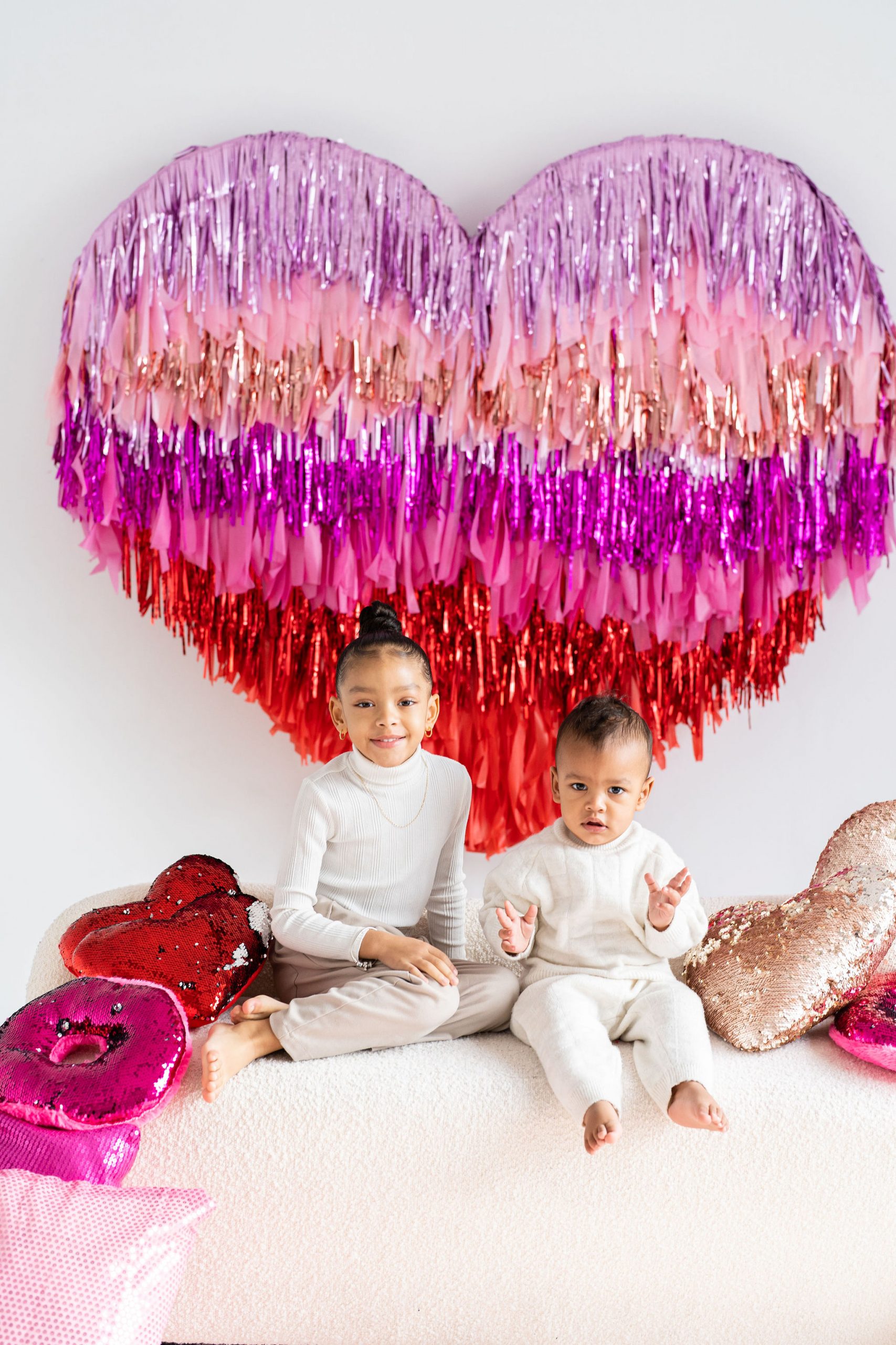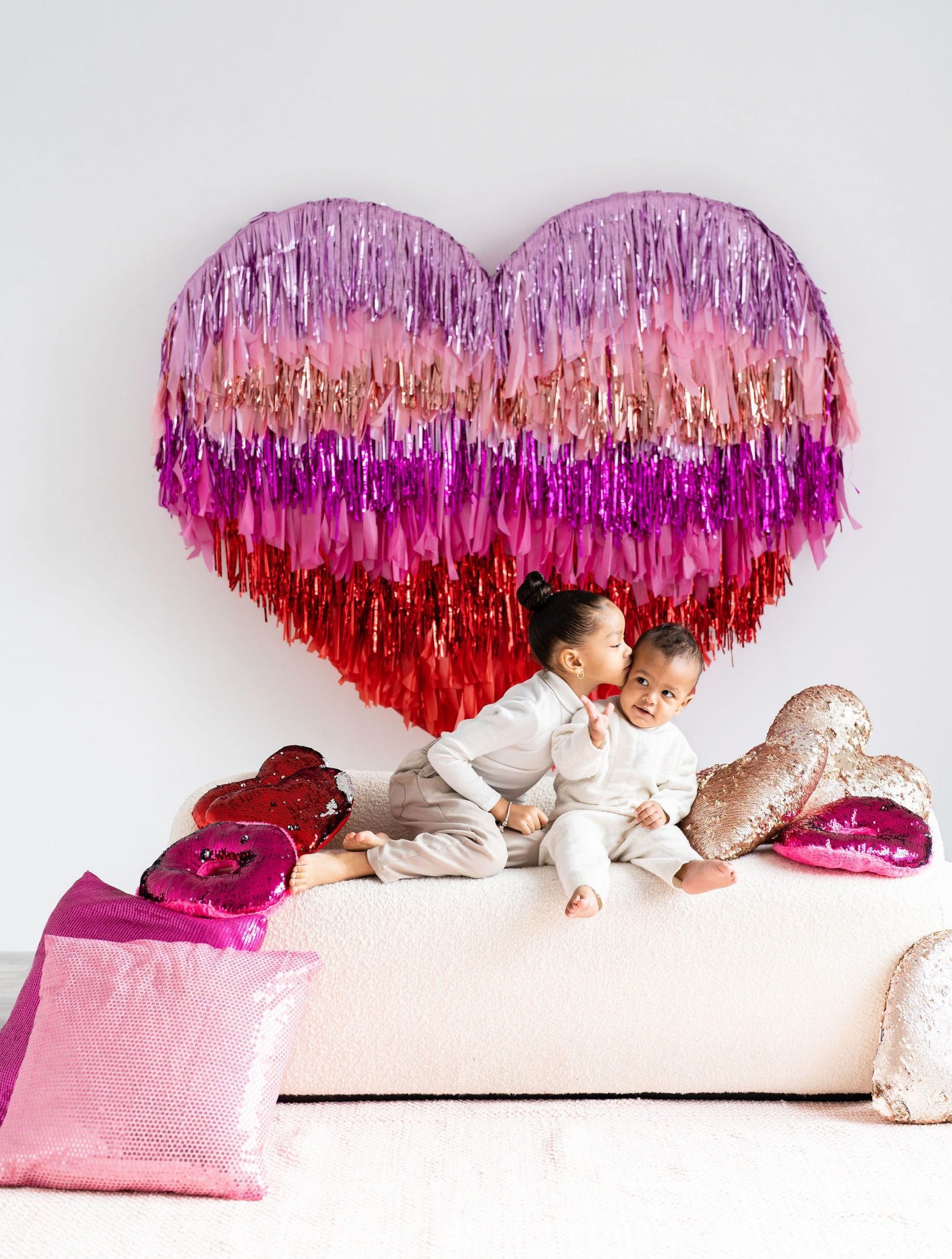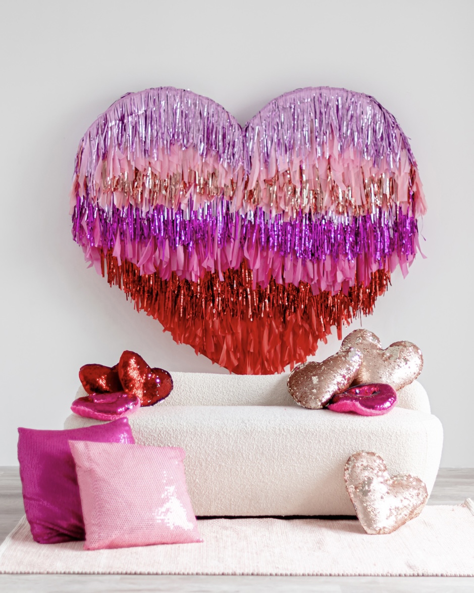 With two tasselled heart setups, our love for the space speaks volumes! The Nest is wearing its heart(s) on its’ walls with two different sized red and pink tasselled hearts to celebrate Mint Room’s love season. Amor Amor is made complete with bright and sequinned throw pillows that tie the place together. The room’s bright yet simple details allow for a beautiful variety of shoots to be done in the space, what will you decide?