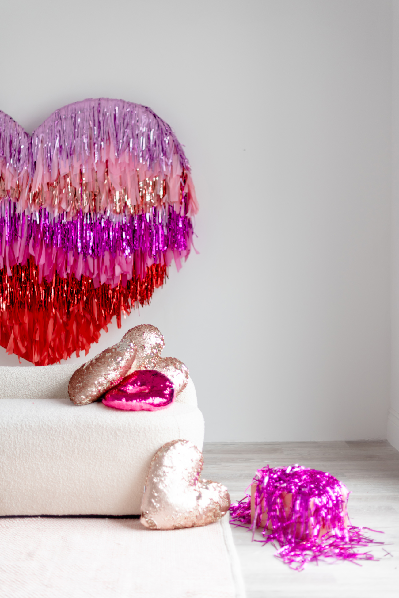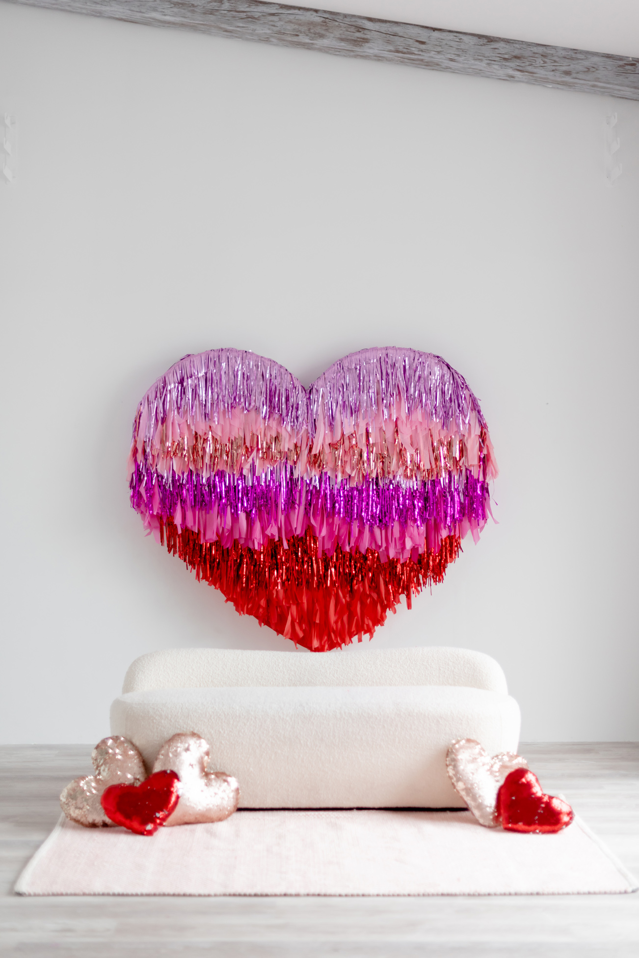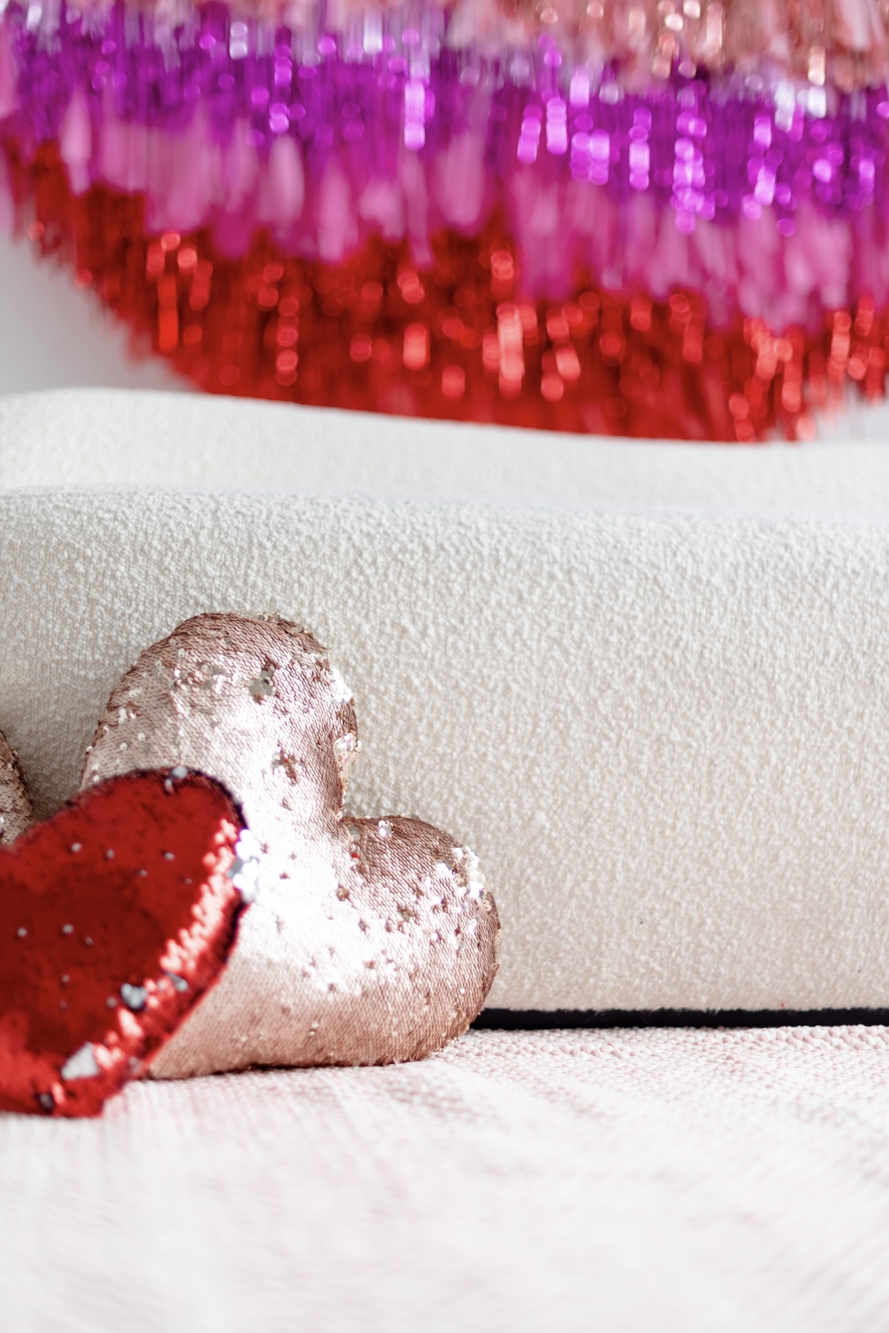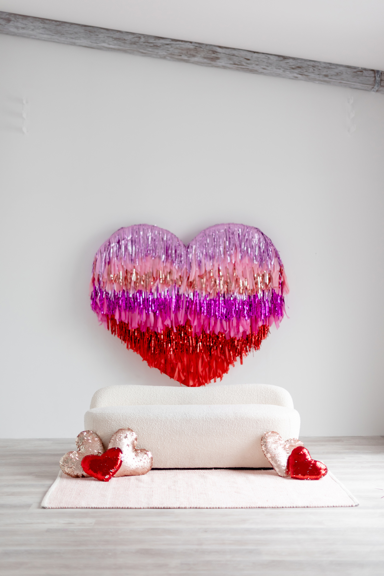 With two tasselled heart setups, our love for the space speaks volumes! The Nest is wearing its heart(s) on its’ walls with two different sized red and pink tasselled hearts to celebrate Mint Room’s love season. Amor Amor is made complete with bright and sequinned throw pillows that tie the place together. The room’s bright yet simple details allow for a beautiful variety of shoots to be done in the space, what will you decide?