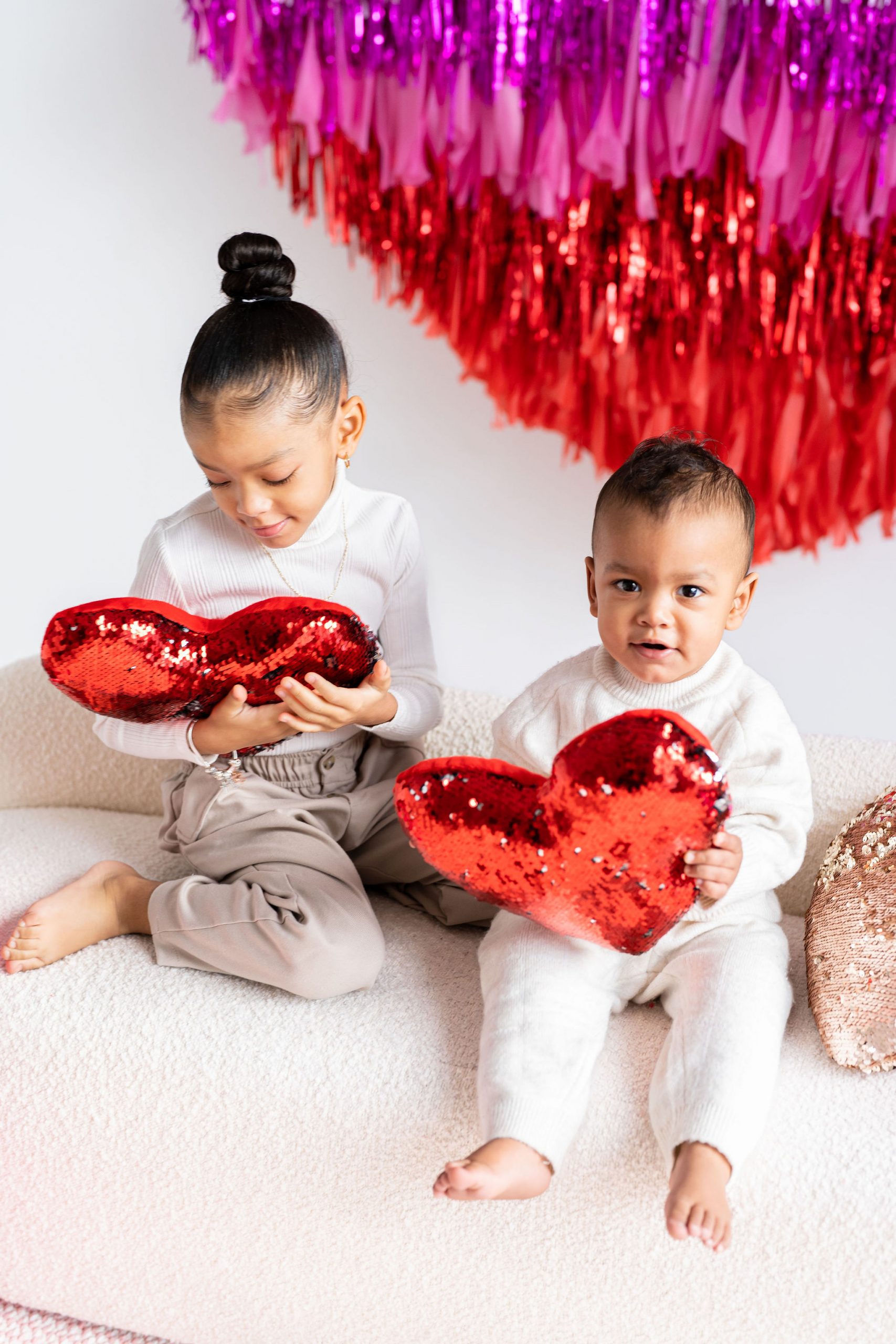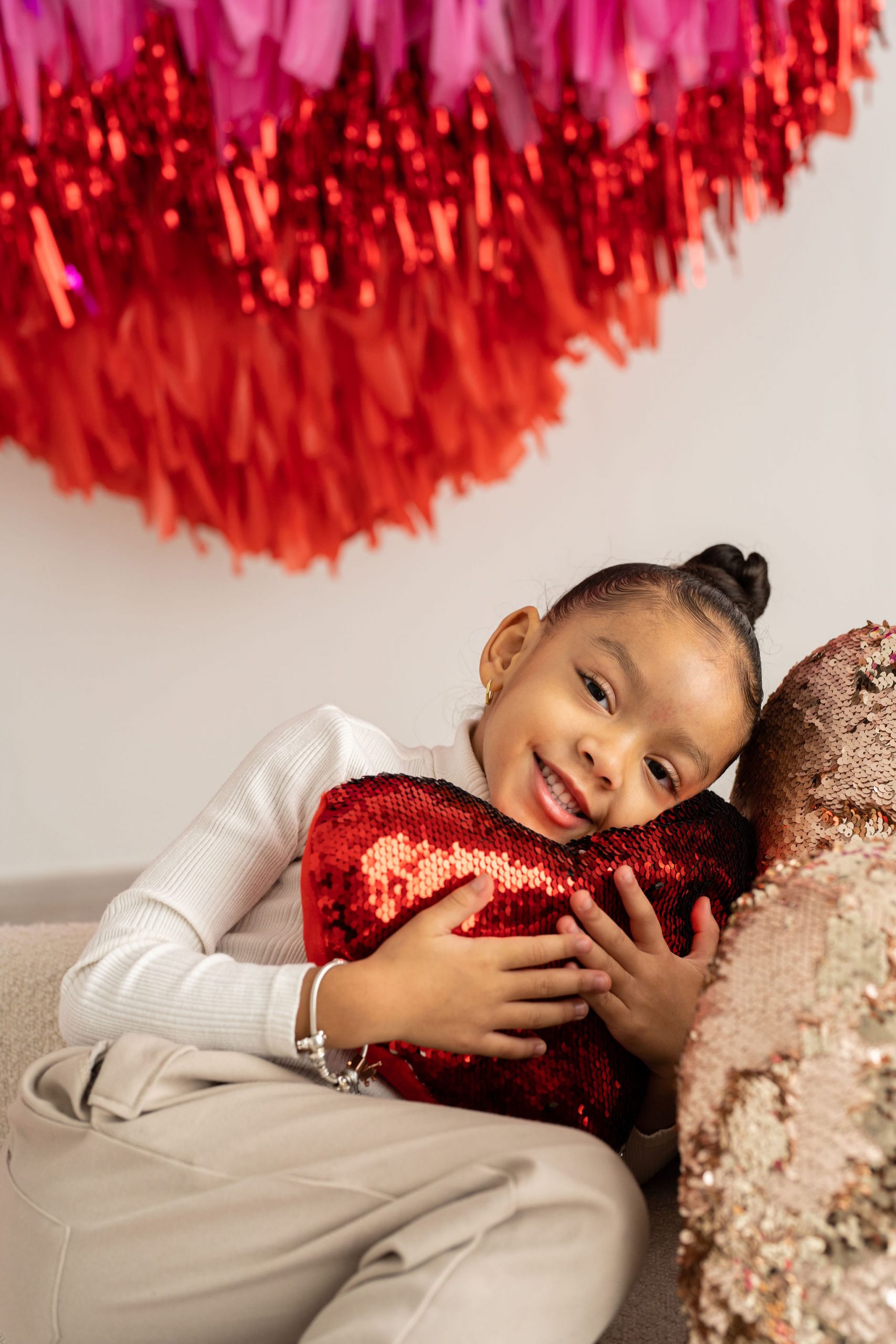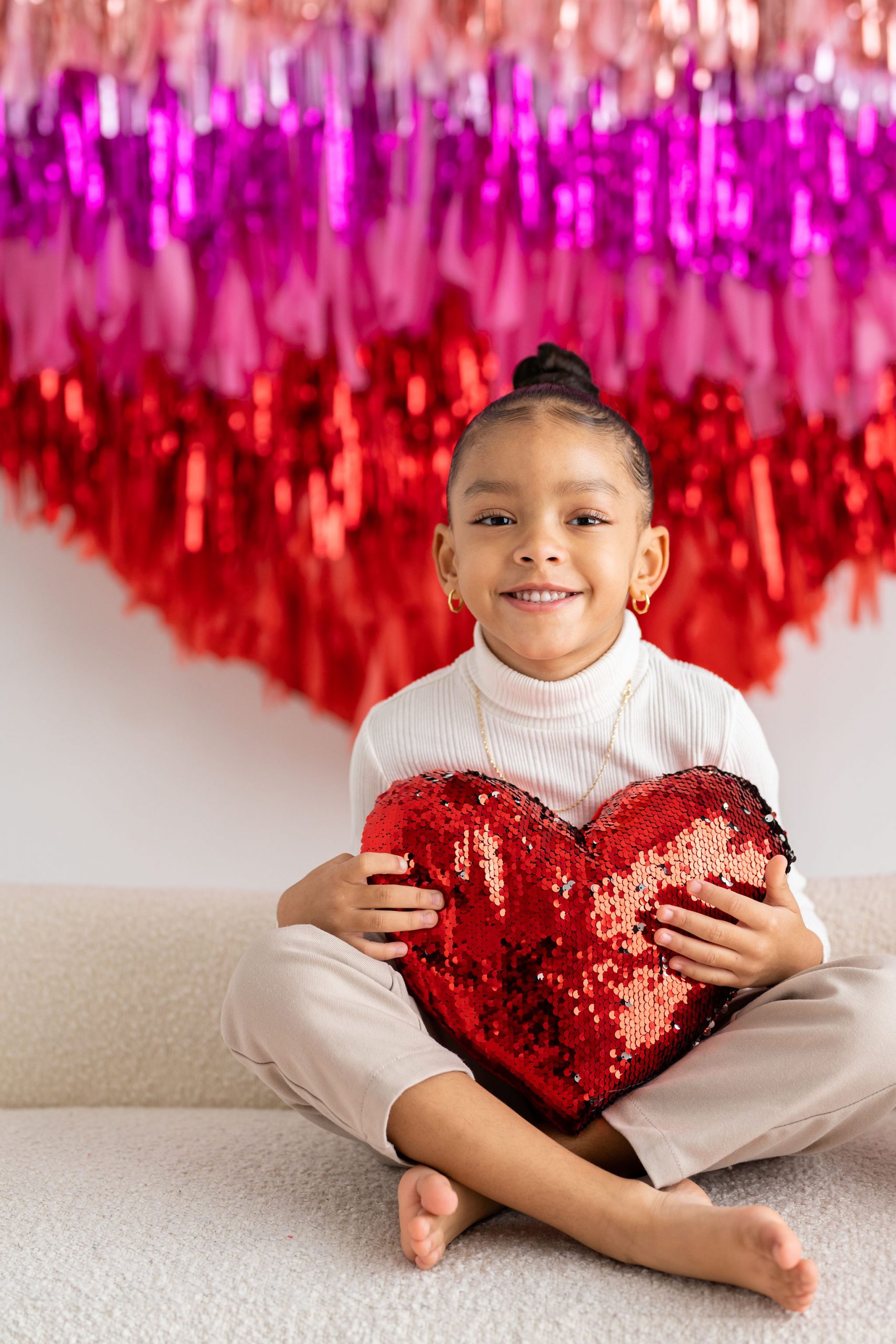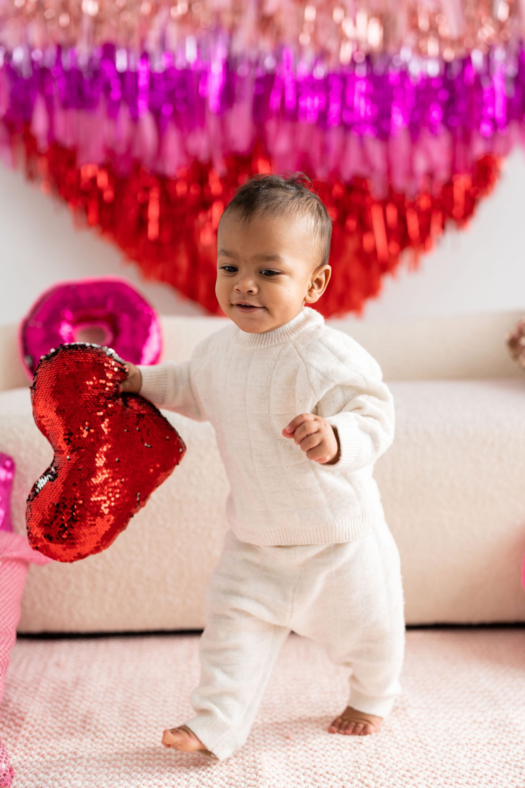 With two tasselled heart setups, our love for the space speaks volumes! The Nest is wearing its heart(s) on its’ walls with two different sized red and pink tasselled hearts to celebrate Mint Room’s love season. Amor Amor is made complete with bright and sequinned throw pillows that tie the place together. The room’s bright yet simple details allow for a beautiful variety of shoots to be done in the space, what will you decide?