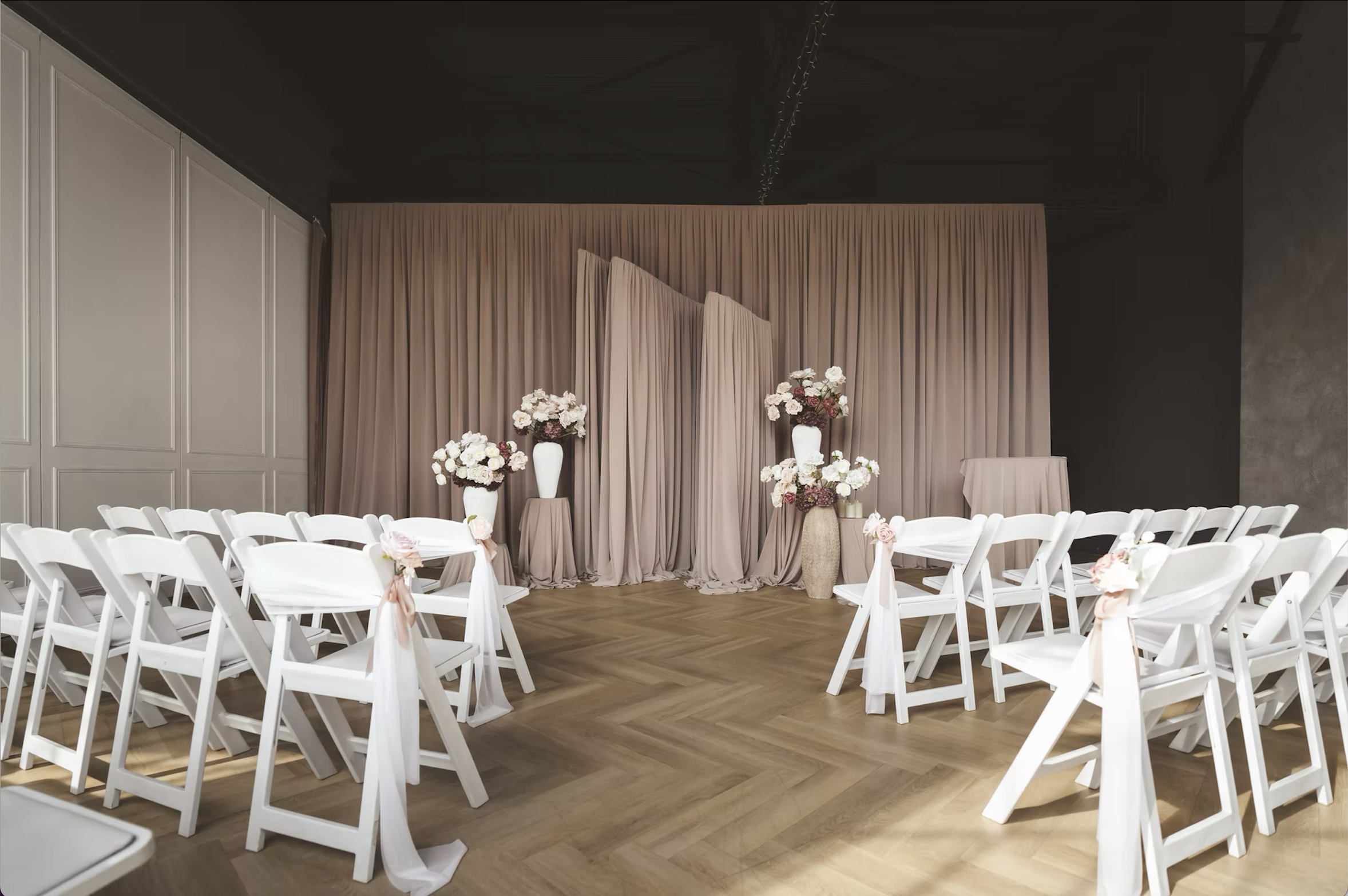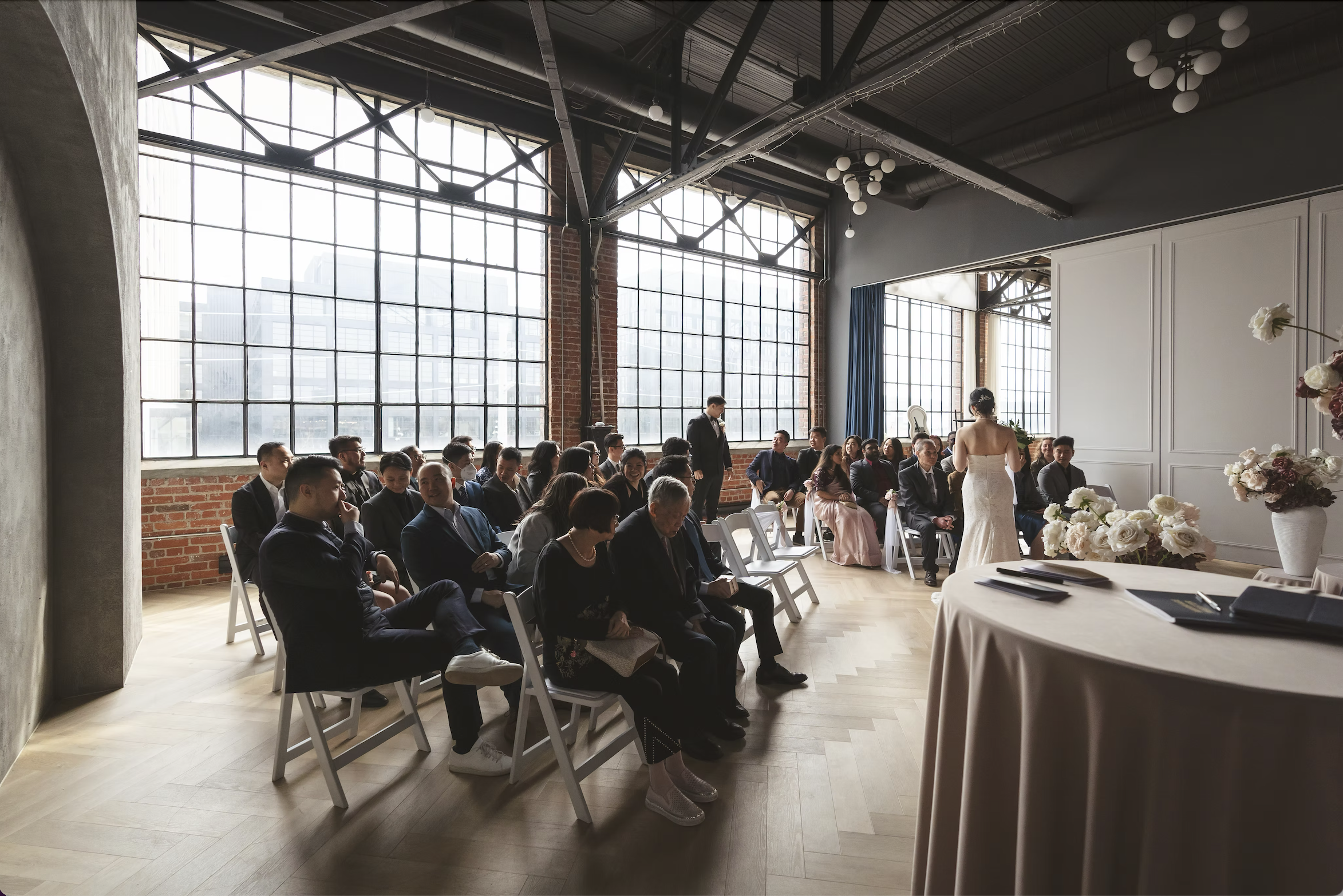 A modern, light-filled venue for intimate weddings, city elopements, and design-forward receptions. The East Side studio features a stunning cement wall and a large standing arch — perfect for floral installations or a statement bar. Couples also love taking advantage of our seasonal decor setups for effortless, built-in styling.