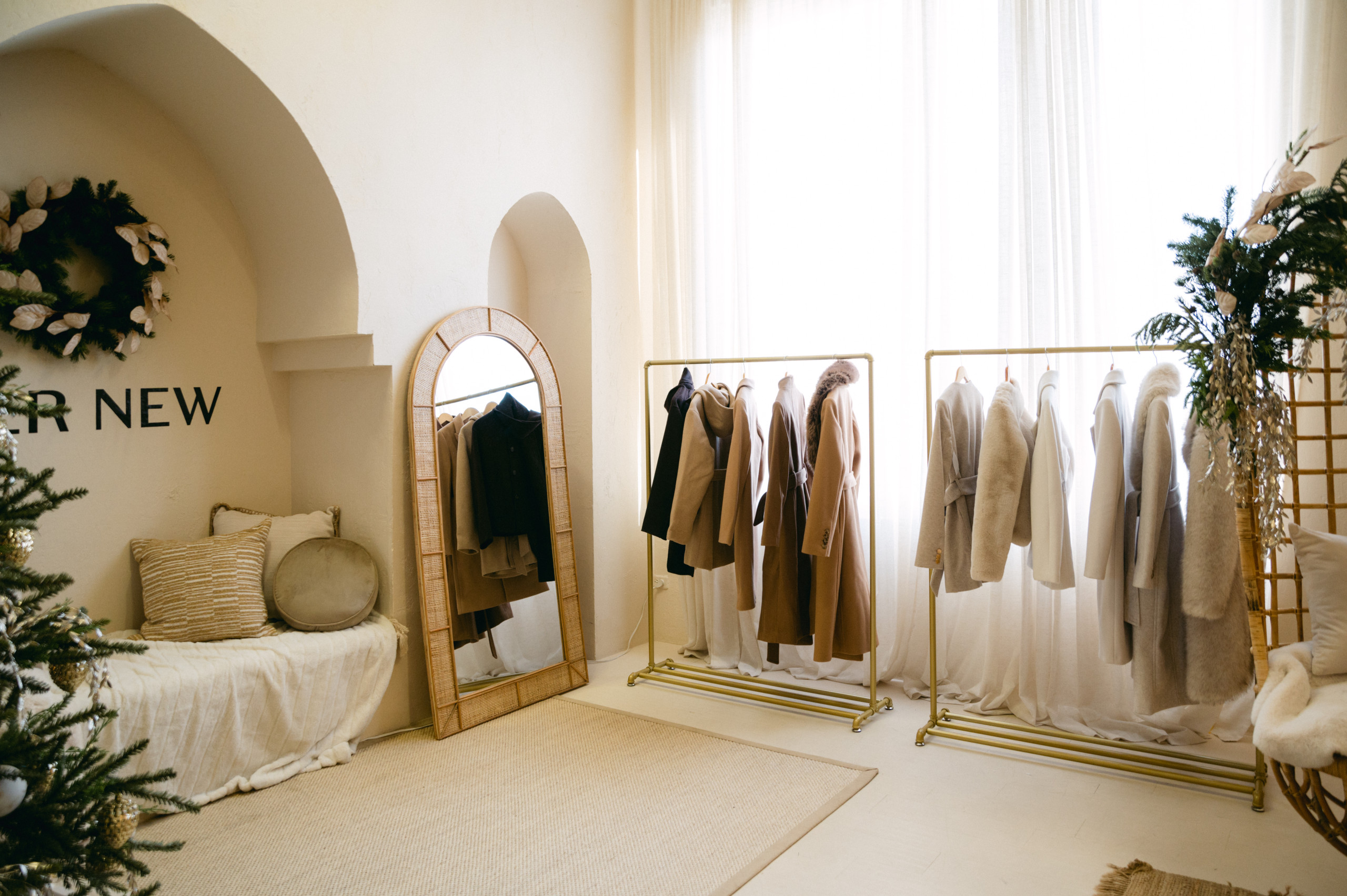 This neutral, cozy room showcased outerwear and winter essentials, using our existing furniture for an inviting, editorial display.