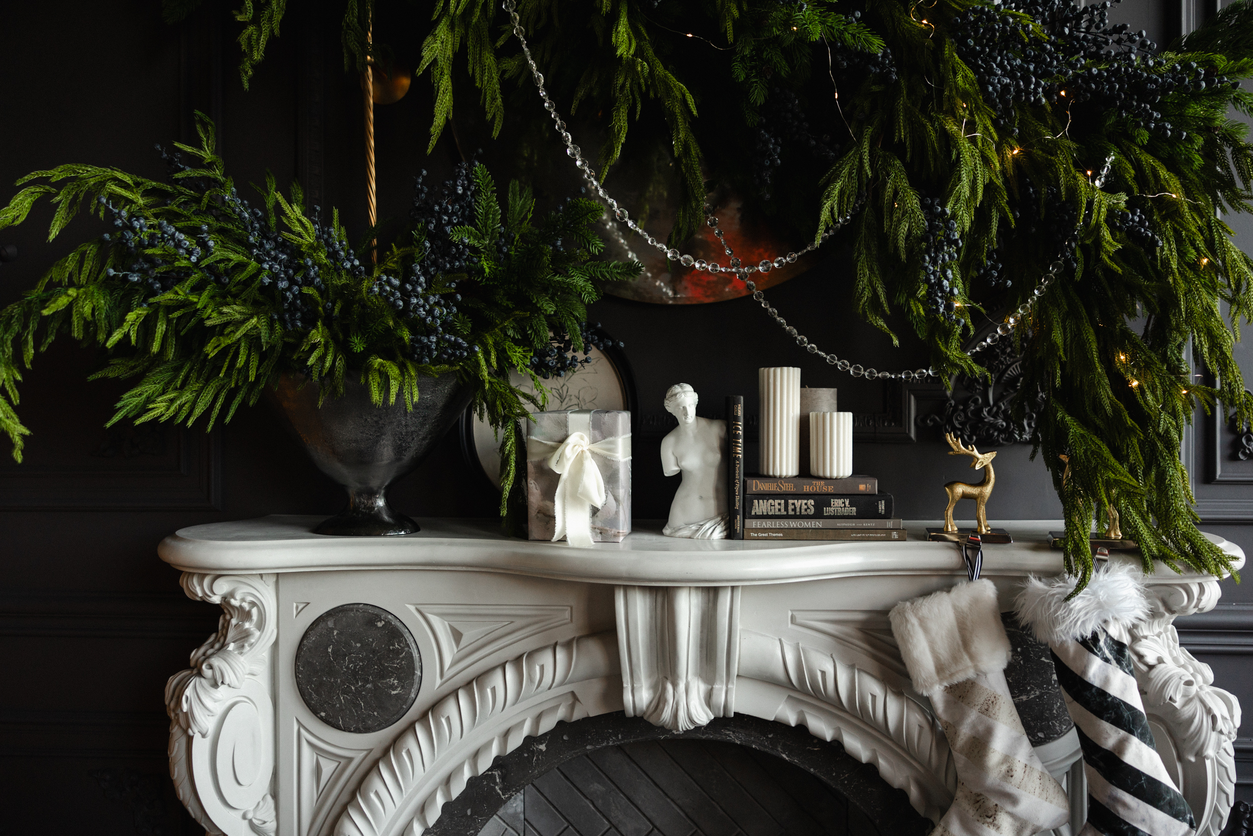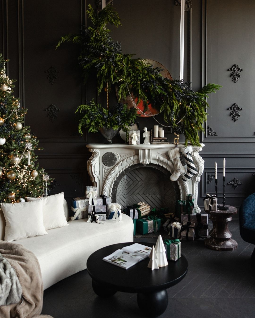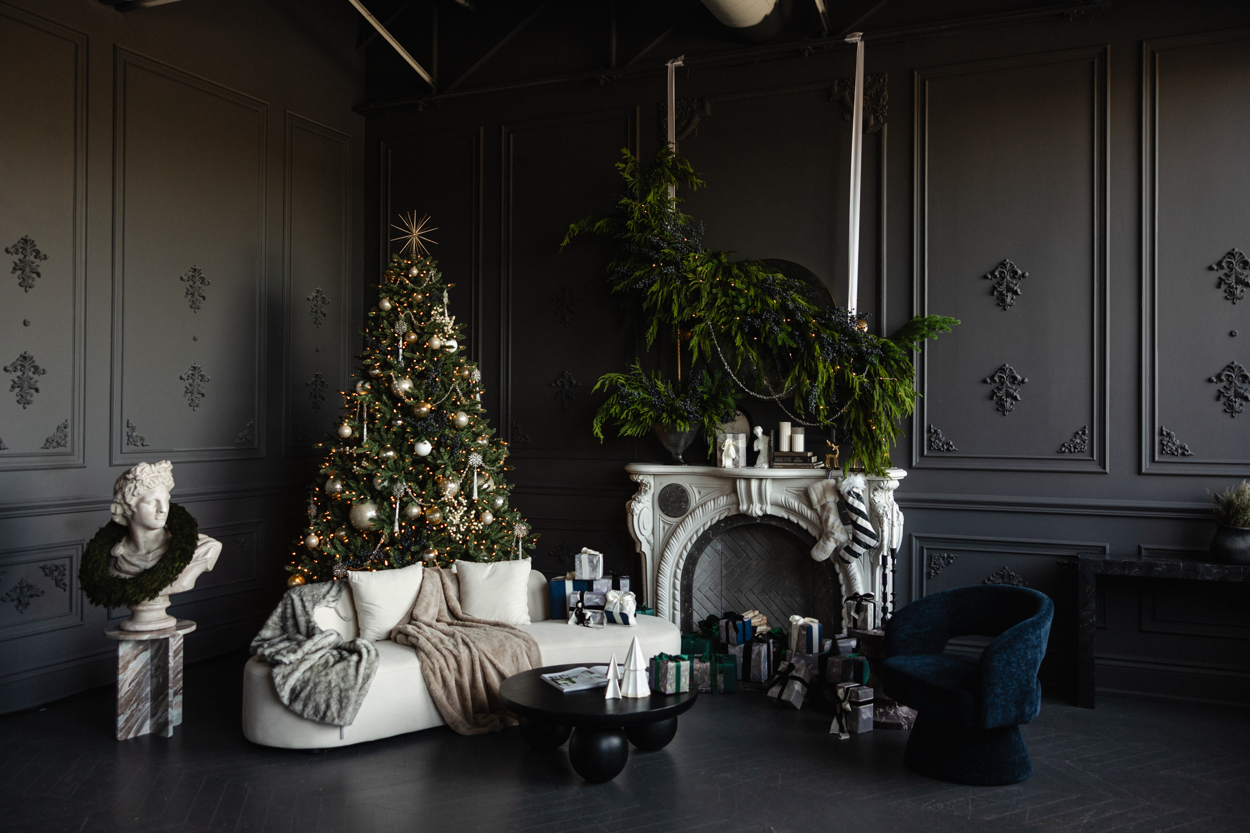 This moodboard channels a quiet luxury holiday aesthetic — timeless, polished, and deeply atmospheric. The space is anchored in elegant contrast, where dark, moody walls meet glowing festive accents. A white statement fireplace and a sculptural white couch act as grounding focal points, brightening the room and creating a sense of balance and refinement. These elements don’t just lighten the visual weight — they elevate the entire space, allowing the darker backdrop to feel curated, not heavy.