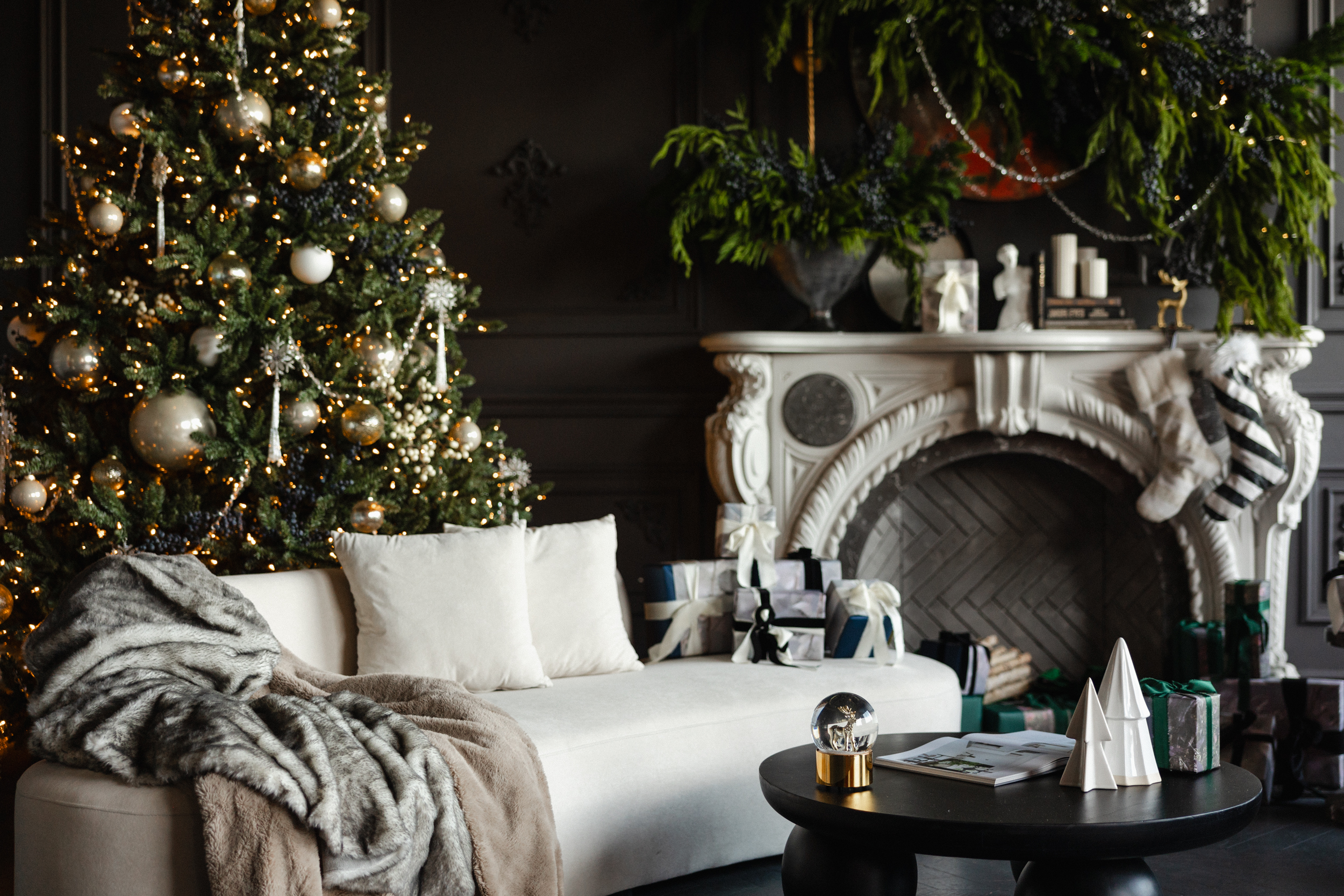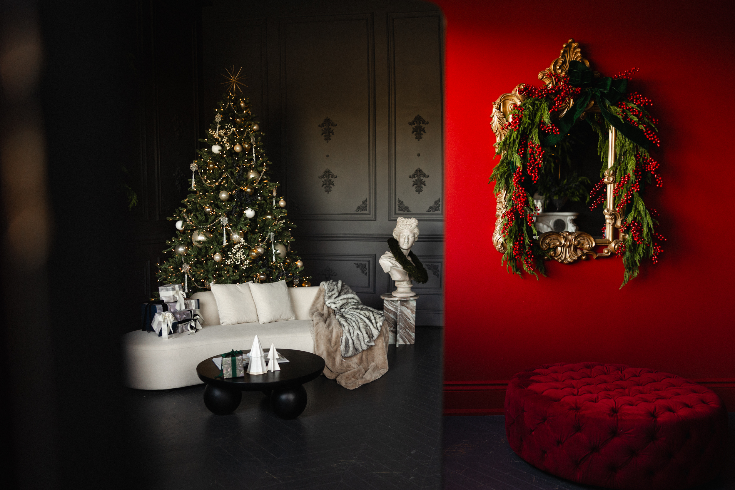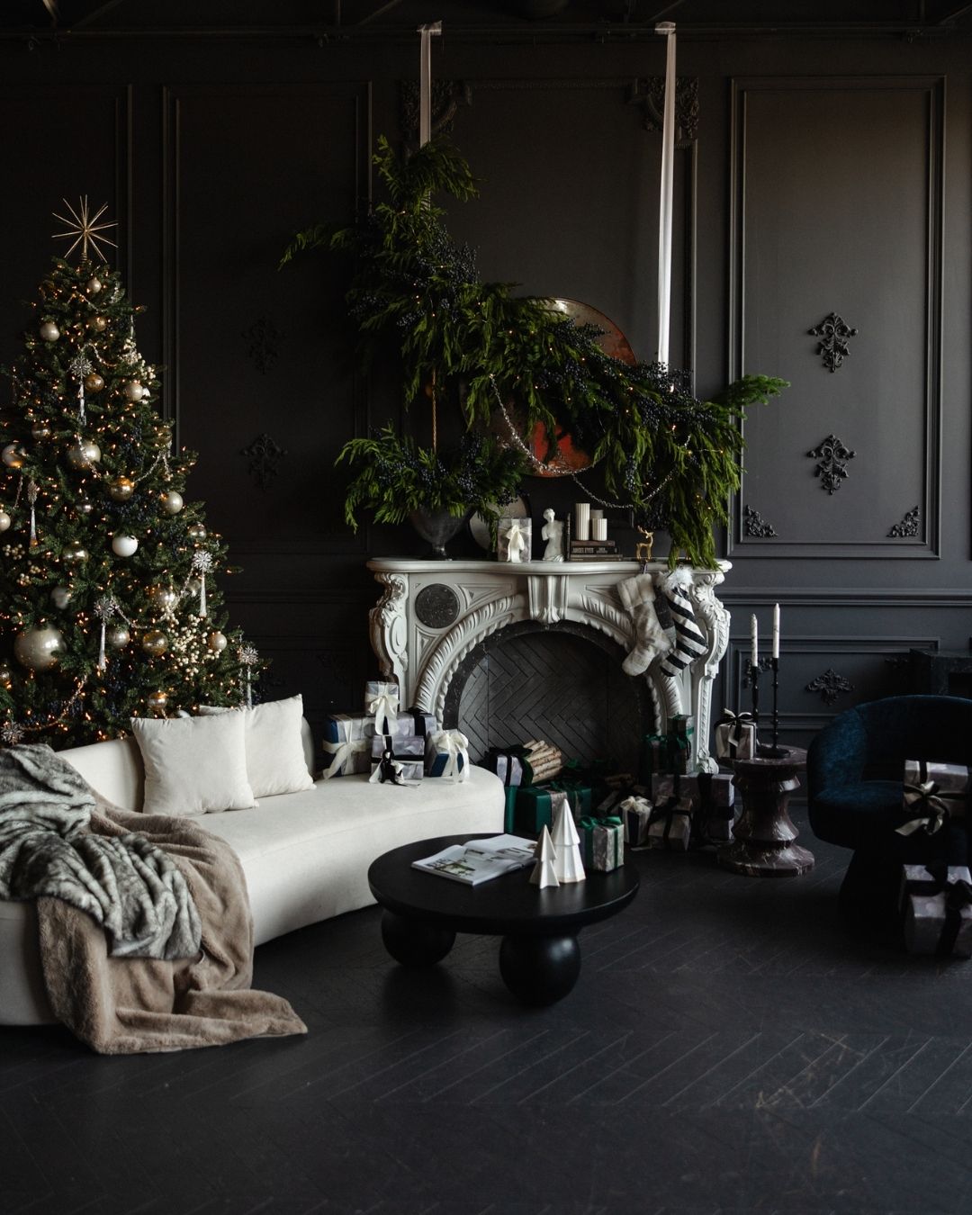 This moodboard channels a quiet luxury holiday aesthetic — timeless, polished, and deeply atmospheric. The space is anchored in elegant contrast, where dark, moody walls meet glowing festive accents. A white statement fireplace and a sculptural white couch act as grounding focal points, brightening the room and creating a sense of balance and refinement. These elements don’t just lighten the visual weight — they elevate the entire space, allowing the darker backdrop to feel curated, not heavy.