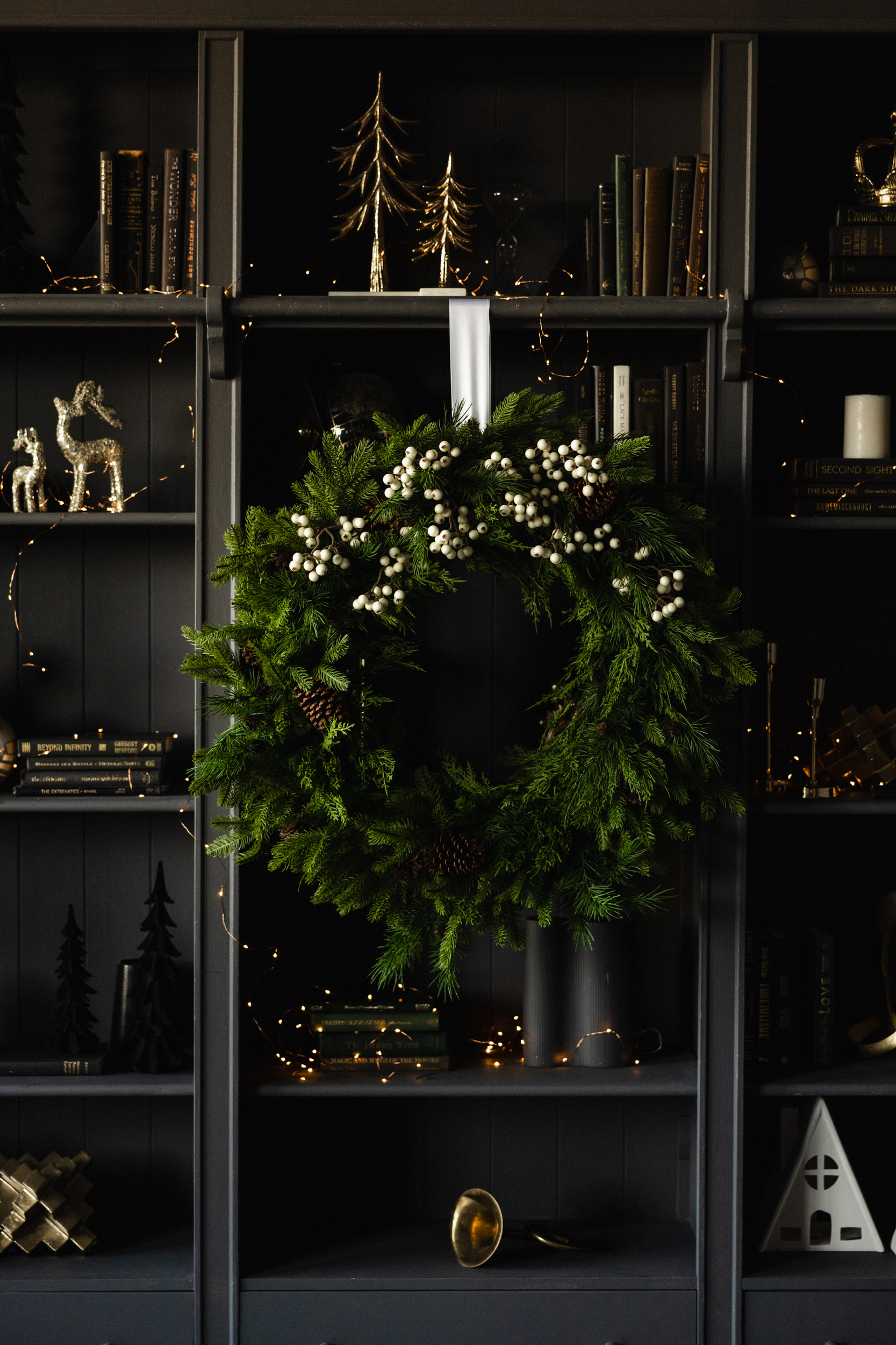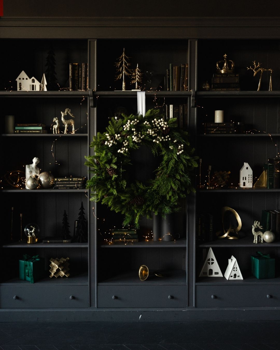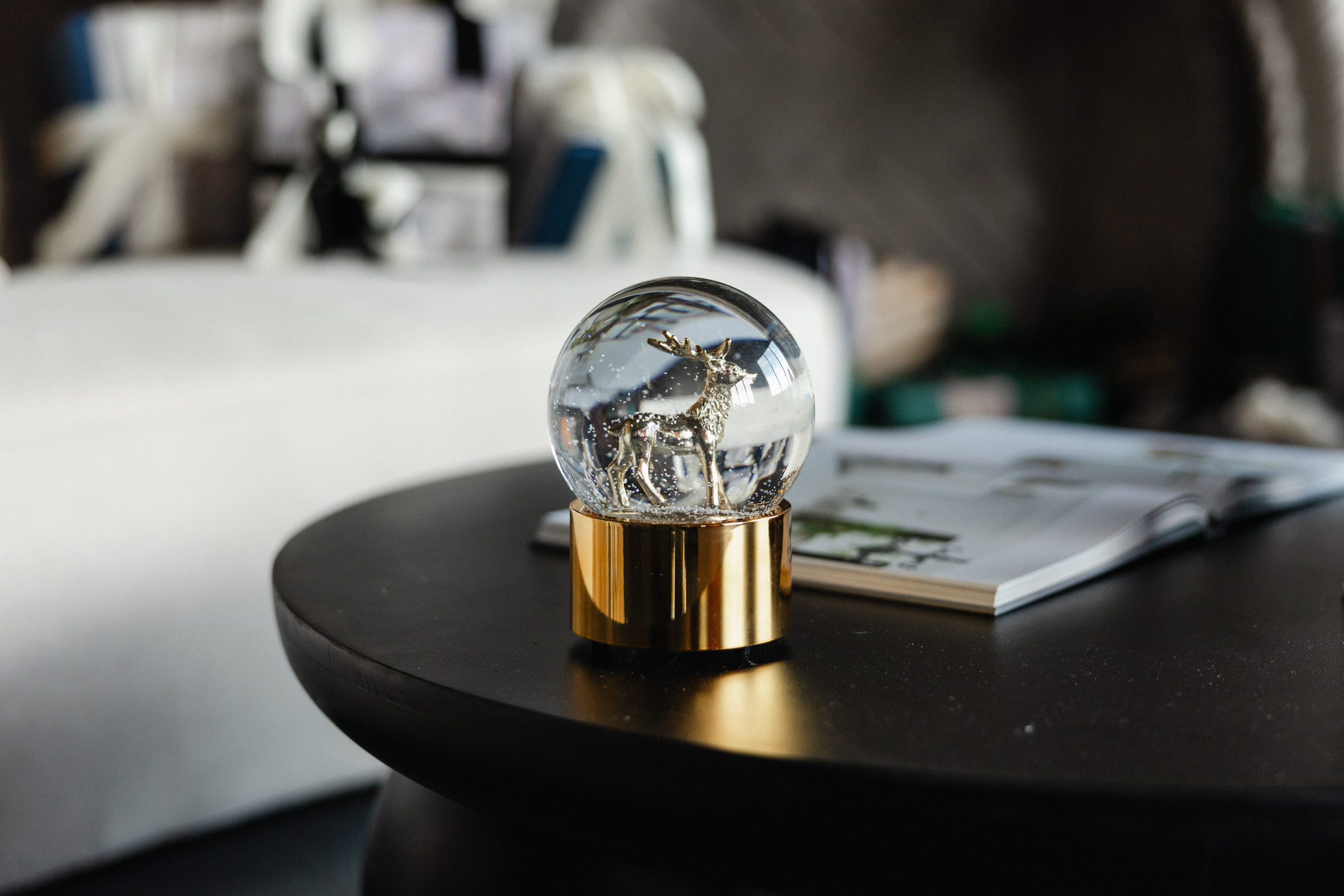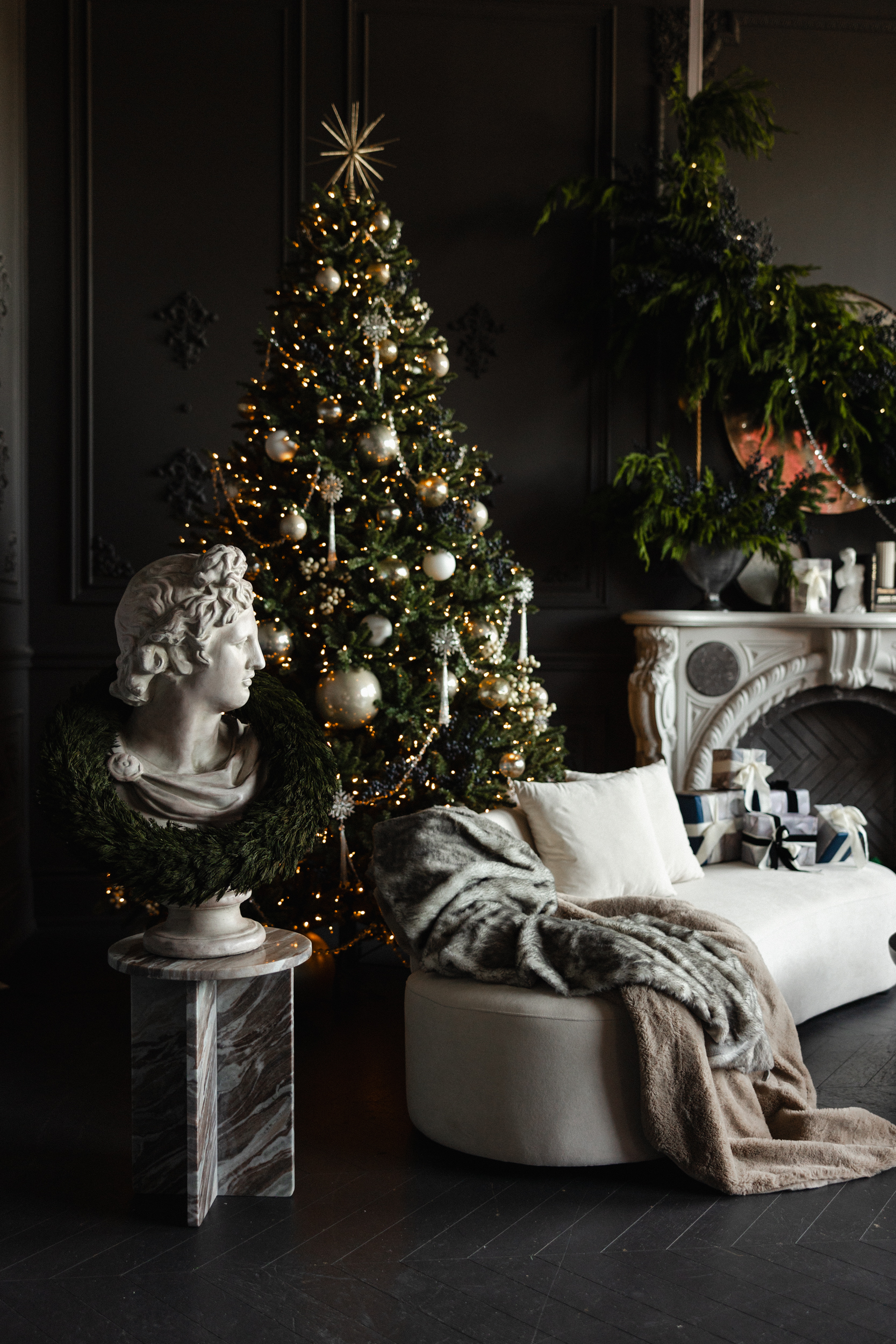 Ornaments in shimmering whites, golds, and luminous metallics are carefully chosen to thread harmony between the rich black walls and the soft white finishes, creating a look that is both festive and restrained. Their subtle shine adds a touch of celebratory sparkle without overwhelming the room’s quiet sophistication.