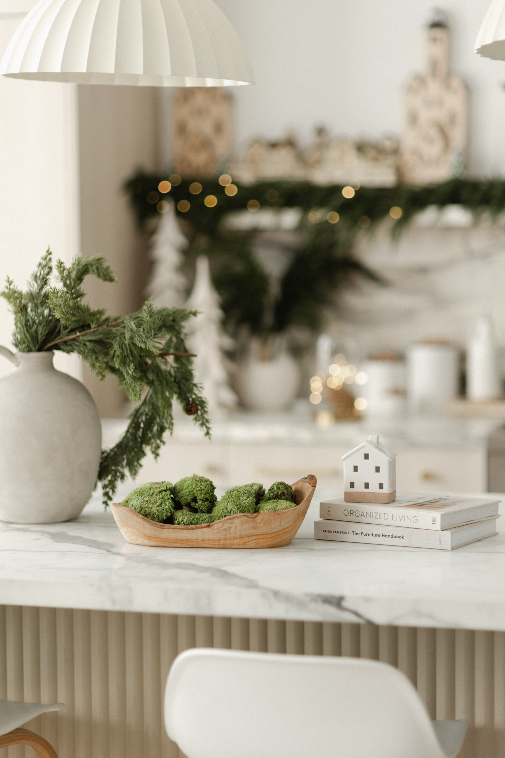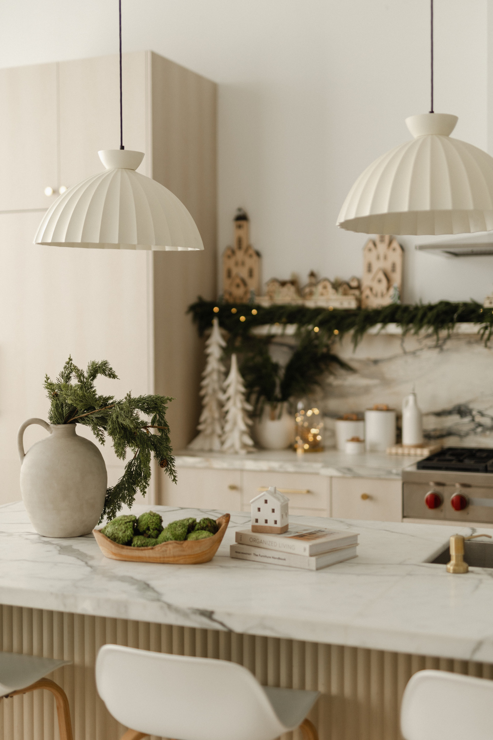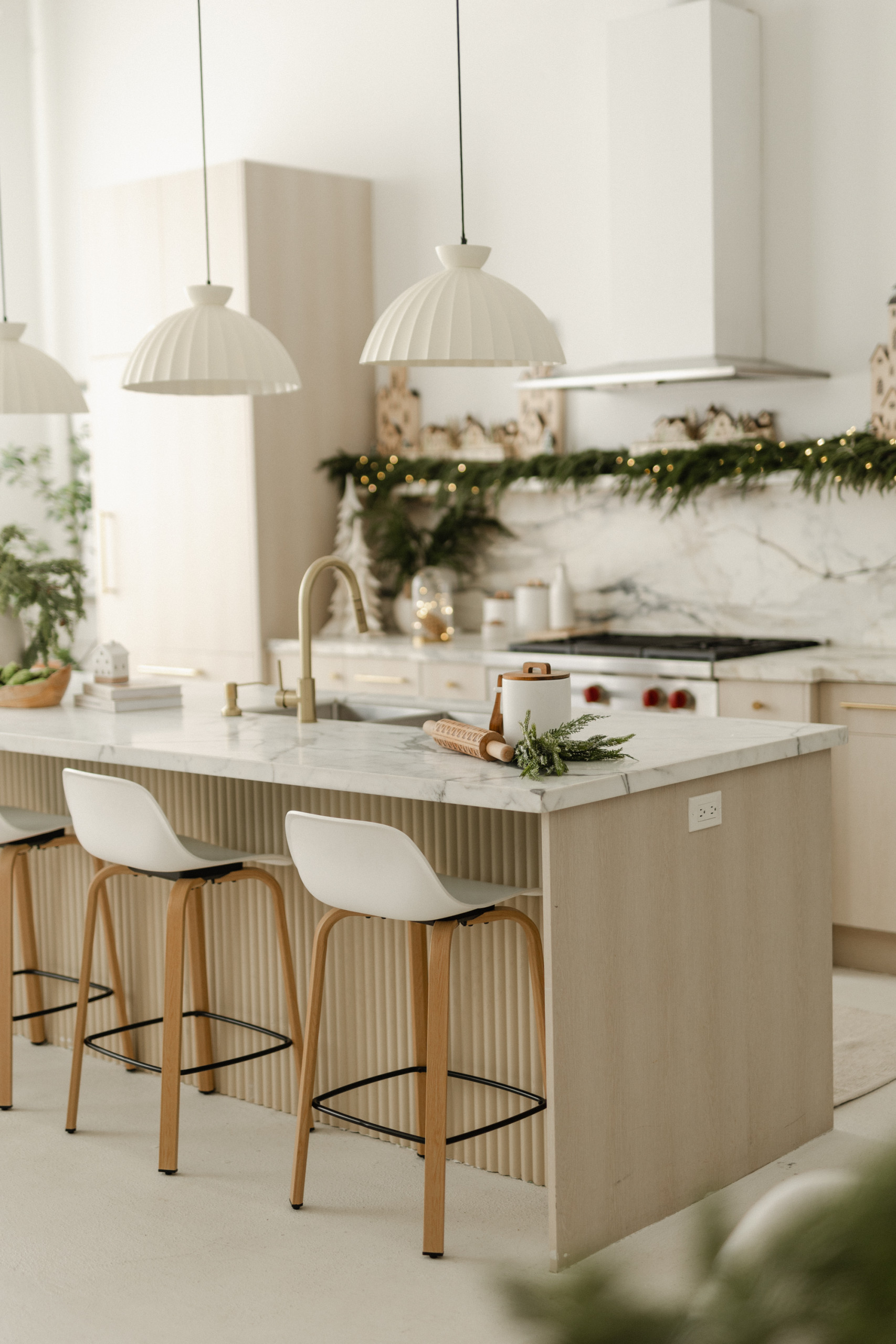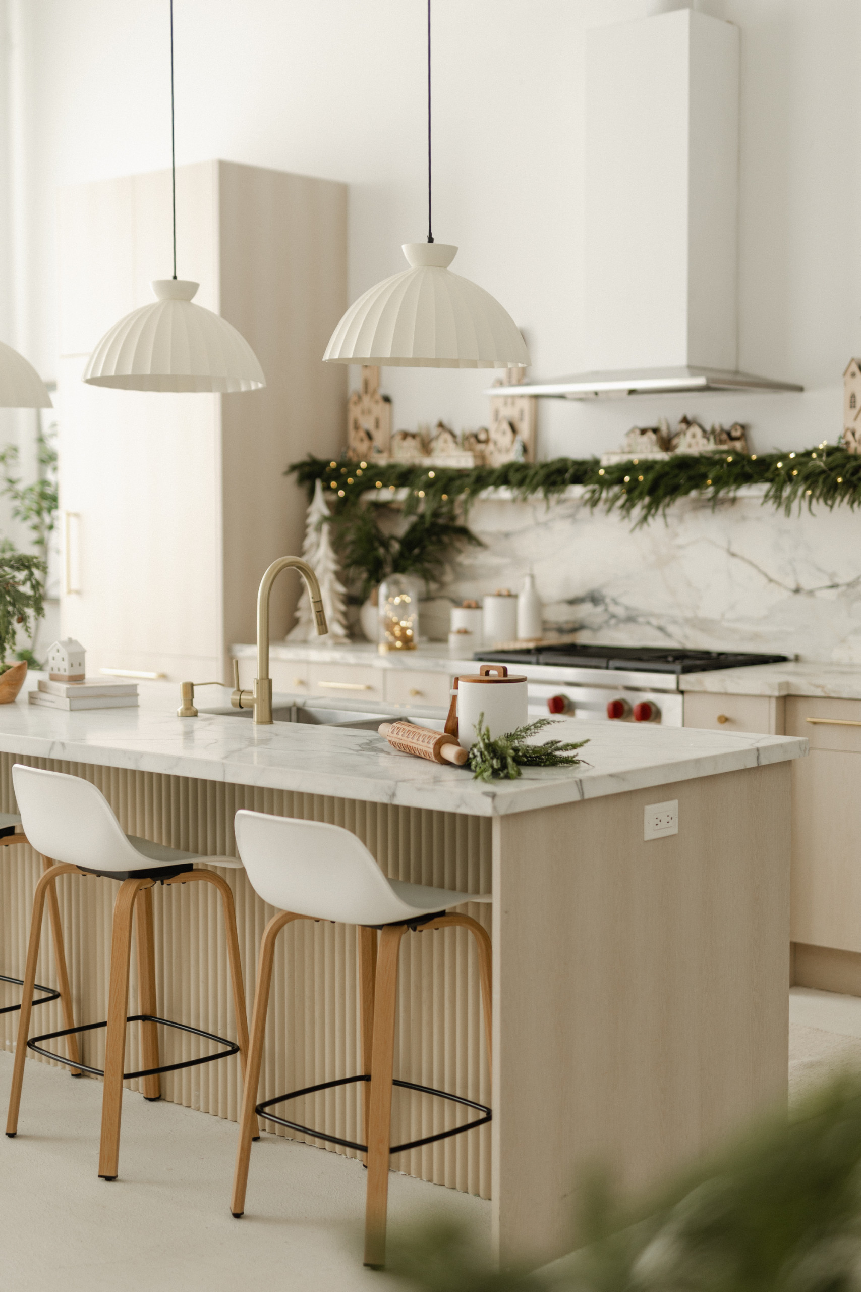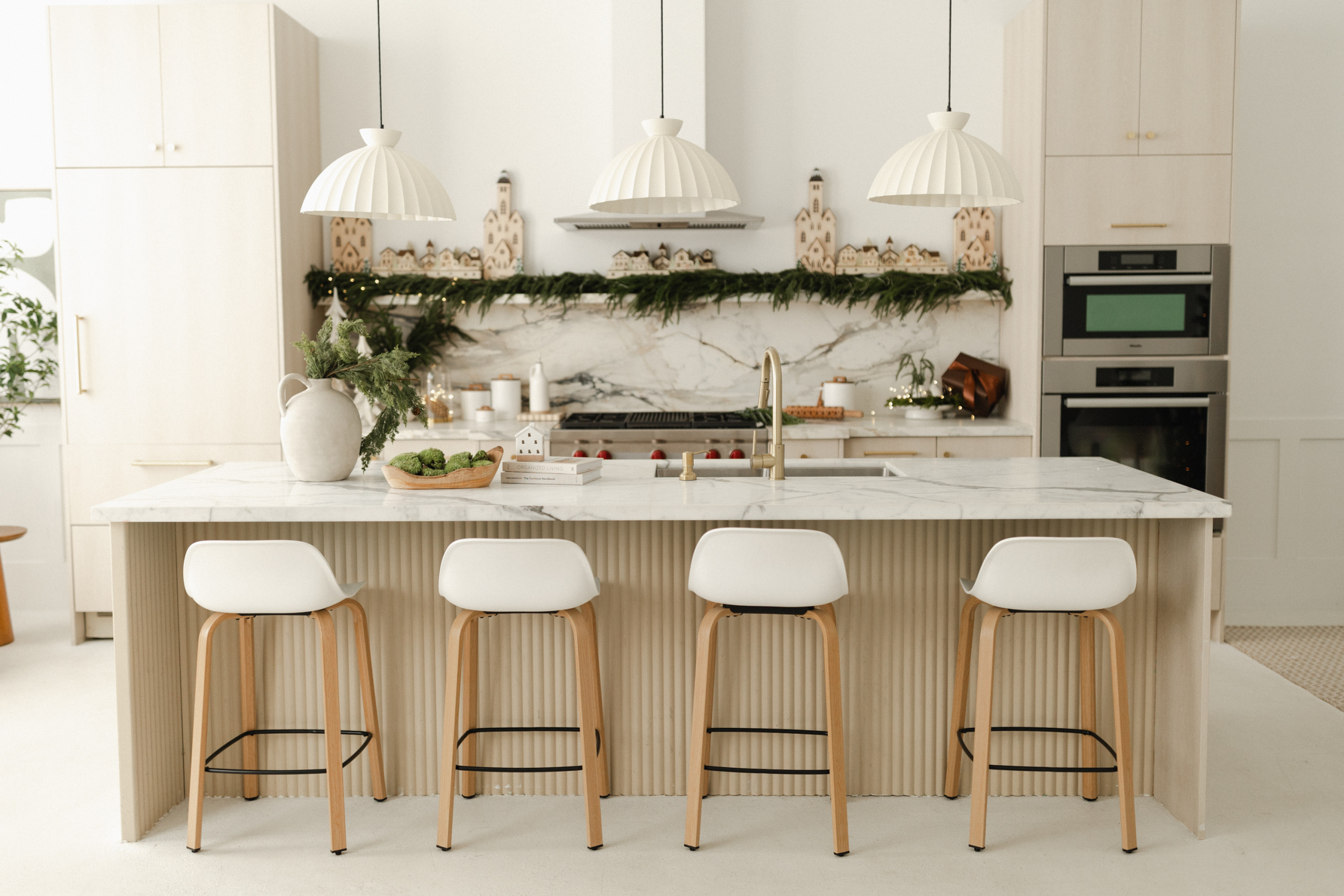 The Kitchen is a bright modern space that features a fully functioning kitchen with trendy open shelves, light oak cabinets, gold hardware, a stunning marble backsplash with beautiful veins, an oversized marble and fluted wood island with bar stools and a dining area.