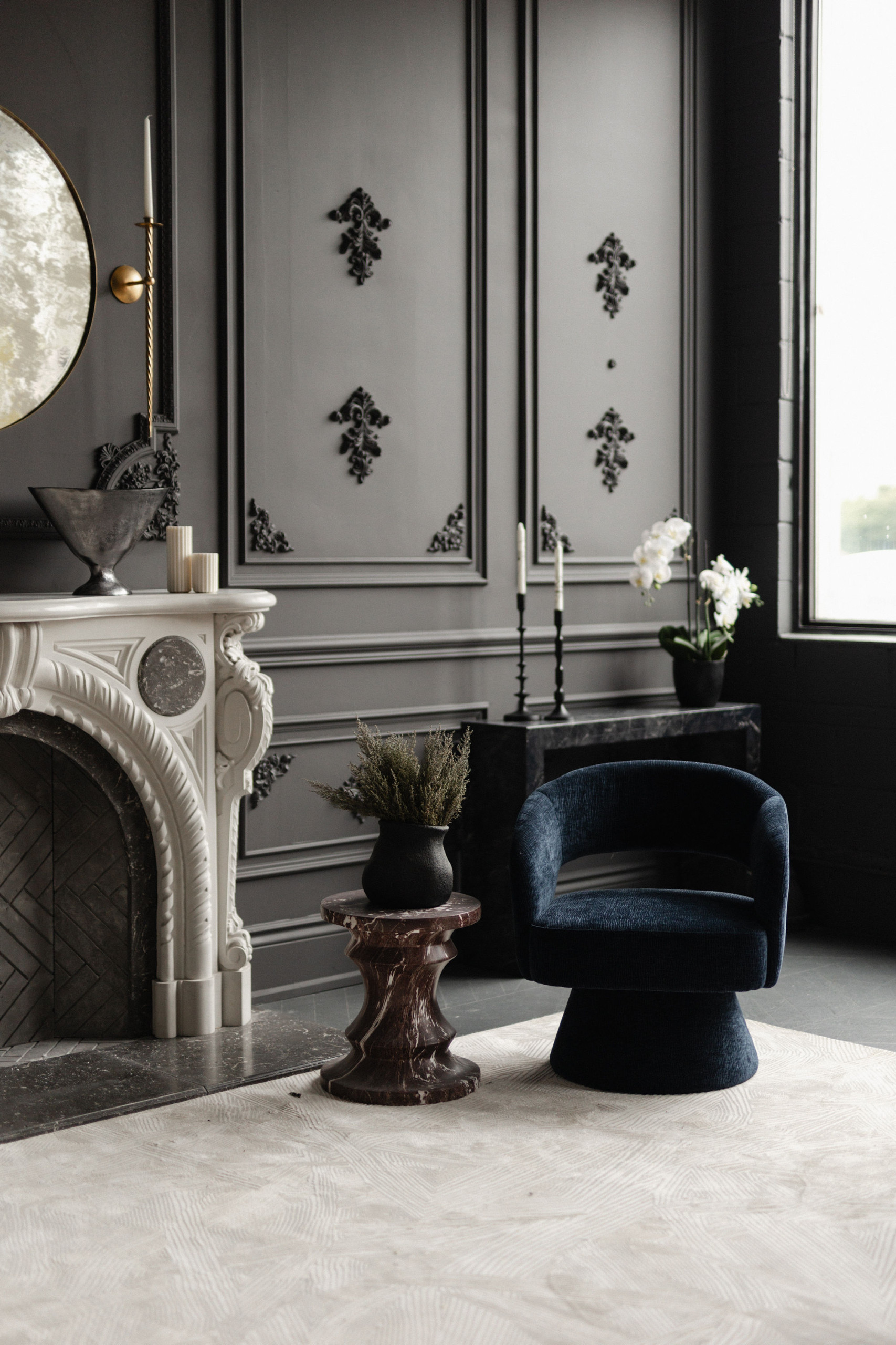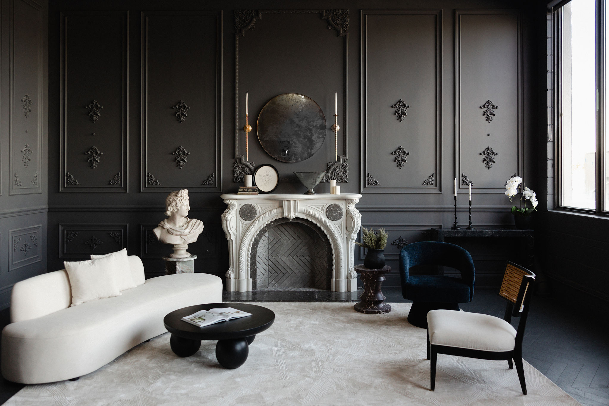 Dramatic 600 sq. ft. Studio room featuring sophisticated matte grey walls adorned with wainscoting and decorative moldings. This space is designed with a grande fireplace, a seating area, and a branding corner showcasing a styled bookshelf.