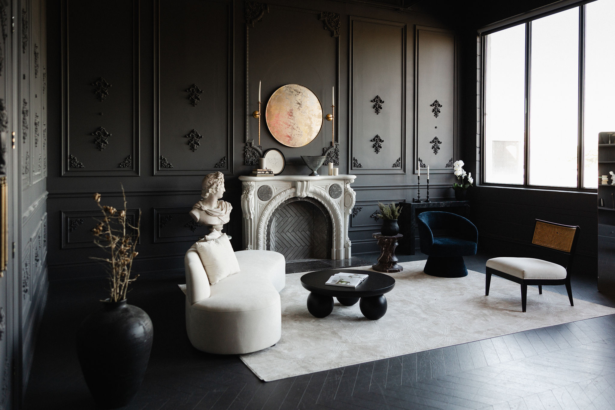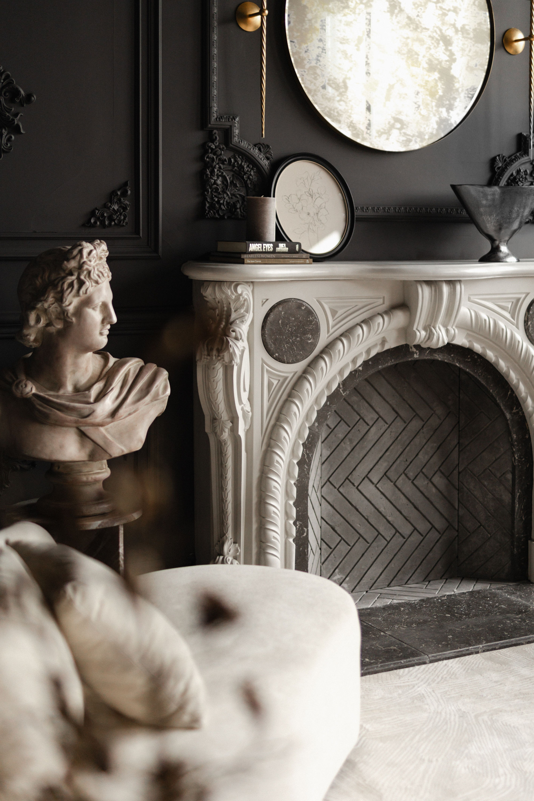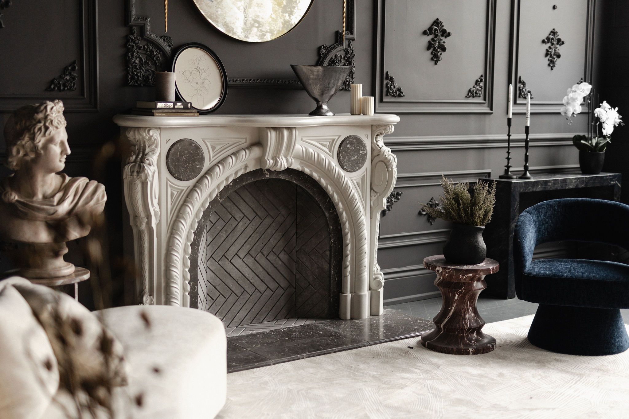 Enter the Library, a unique space boasting dark grey matte walls, brown chevron flooring, and an oversized fireplace surrounded by rich-toned furniture. This grand and cozy ambiance is an ideal setting for moody and dramatic shoots.