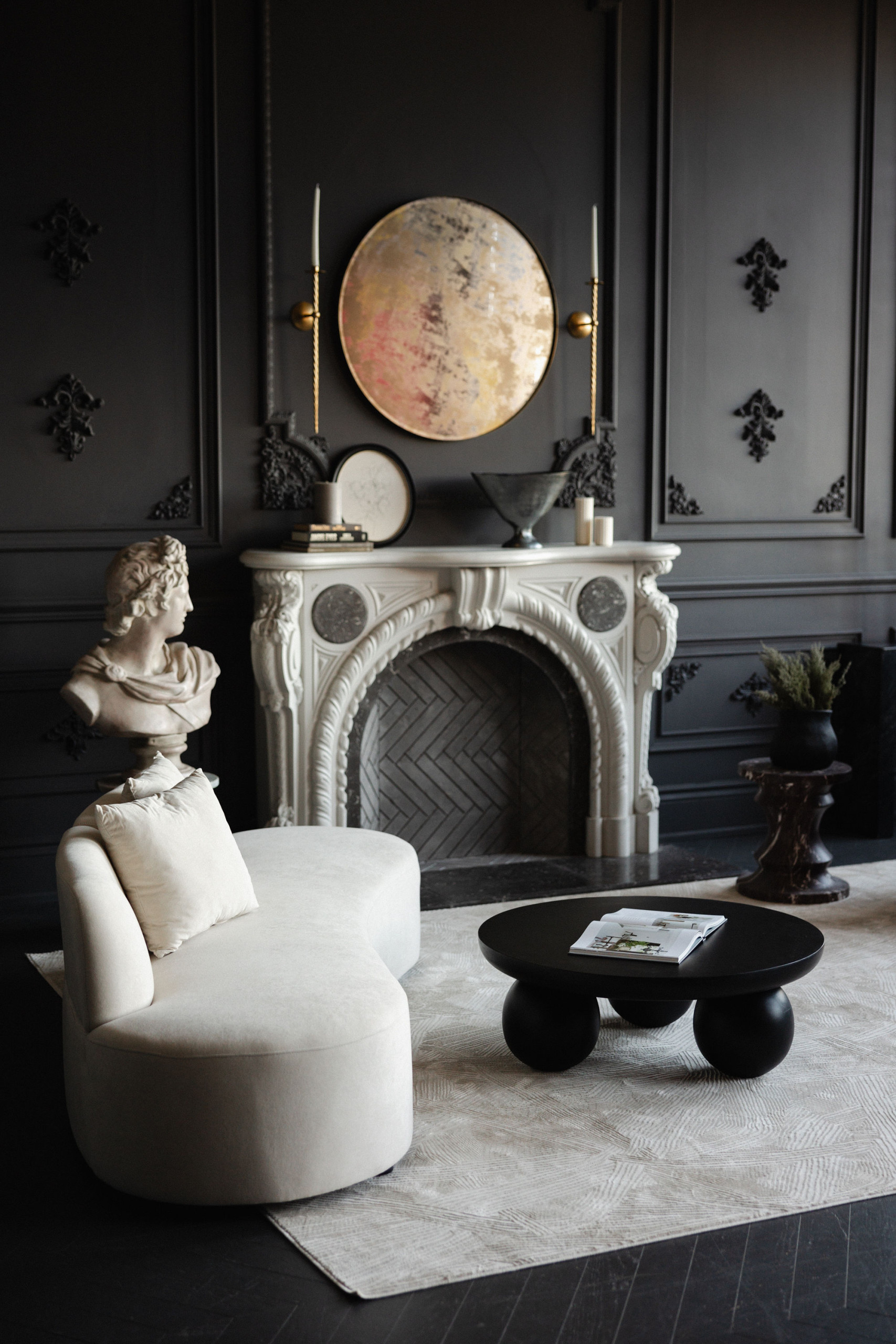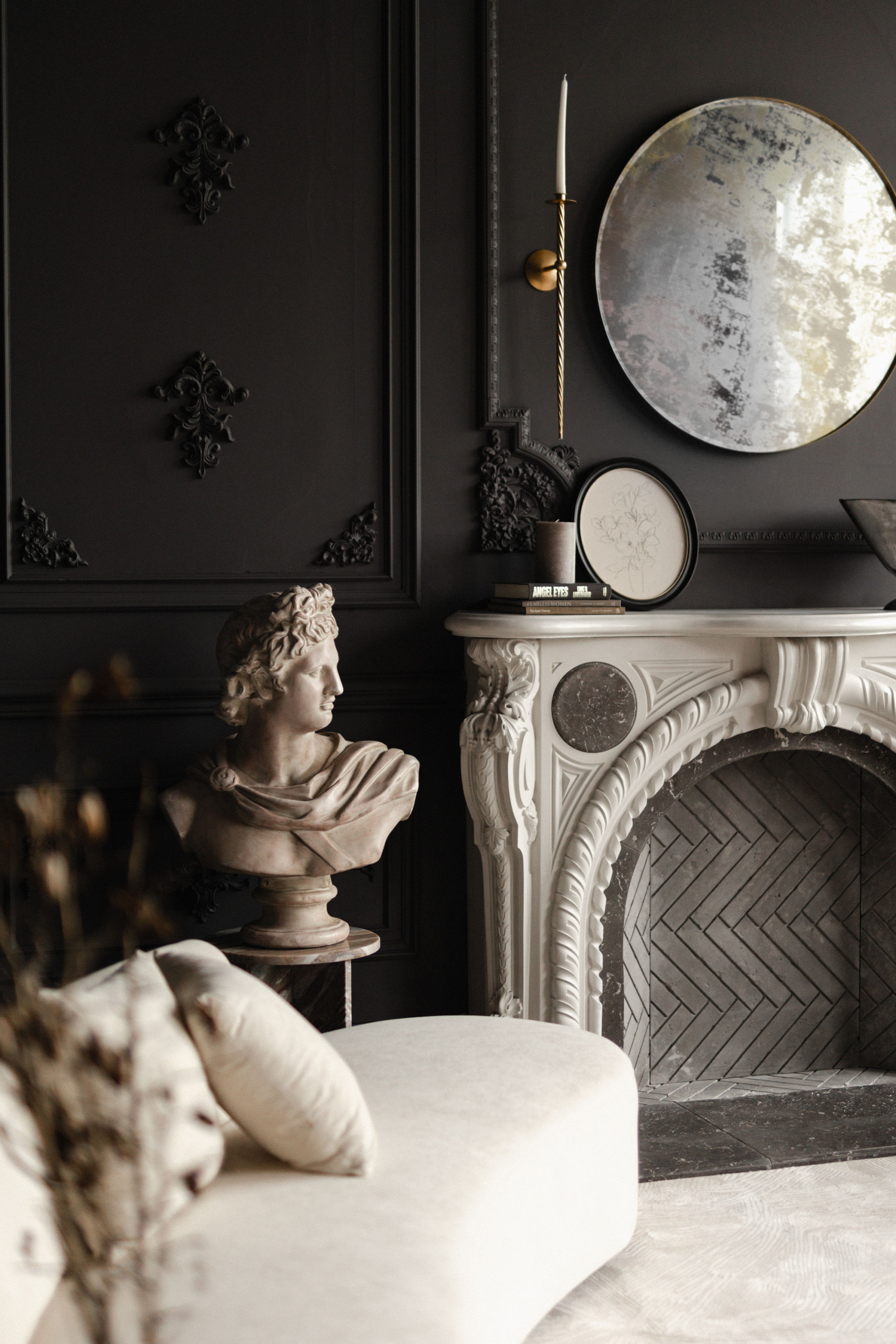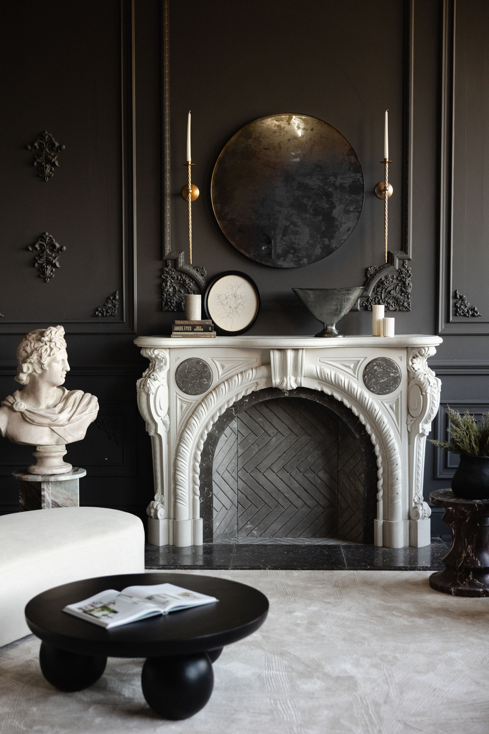 This moodboard channels a quiet luxury holiday aesthetic — timeless, polished, and deeply atmospheric. The space is anchored in elegant contrast, where dark, moody walls meet glowing festive accents. A white statement fireplace and a sculptural white couch act as grounding focal points, brightening the room and creating a sense of balance and refinement. These elements don’t just lighten the visual weight — they elevate the entire space, allowing the darker backdrop to feel curated, not heavy.