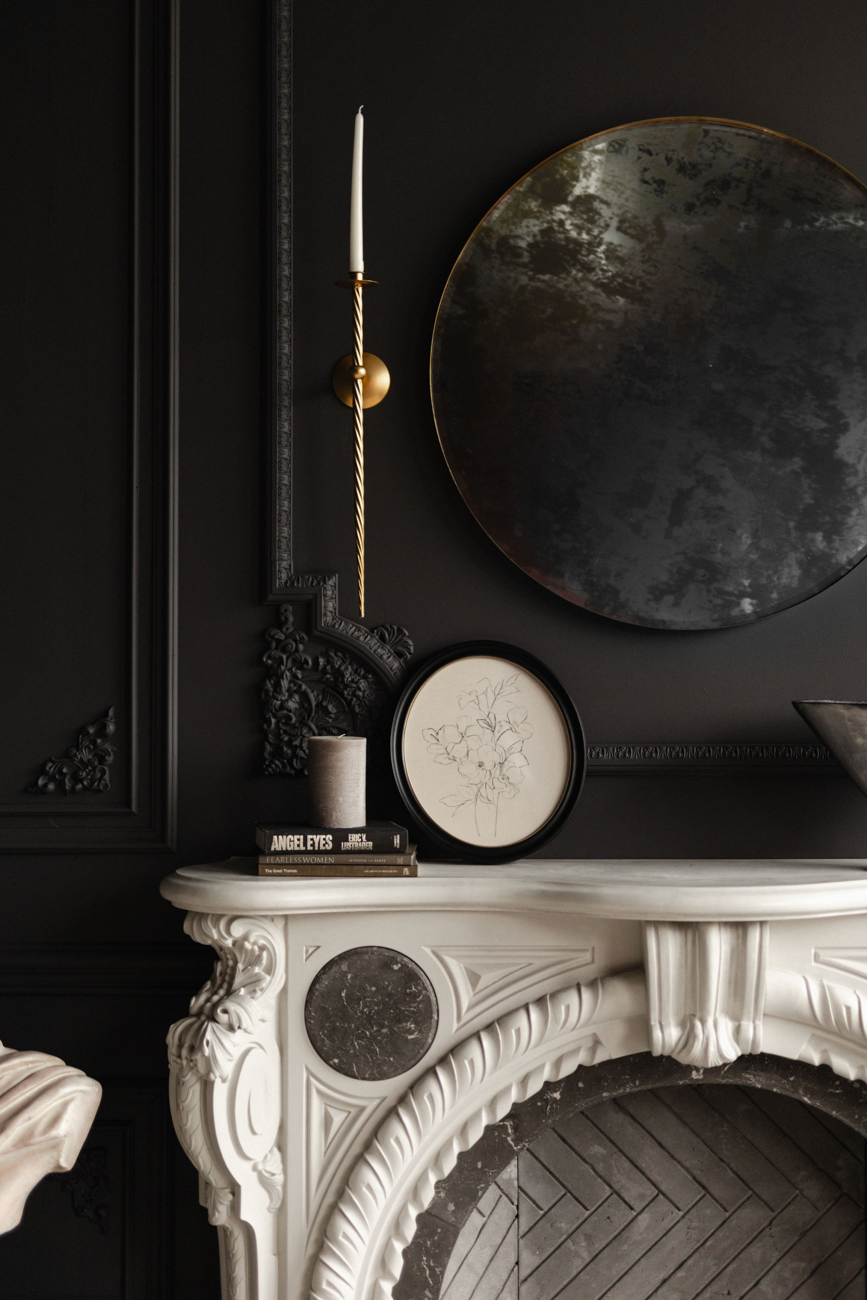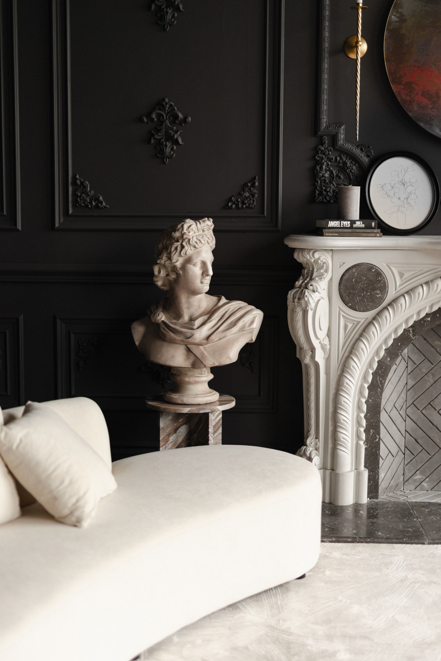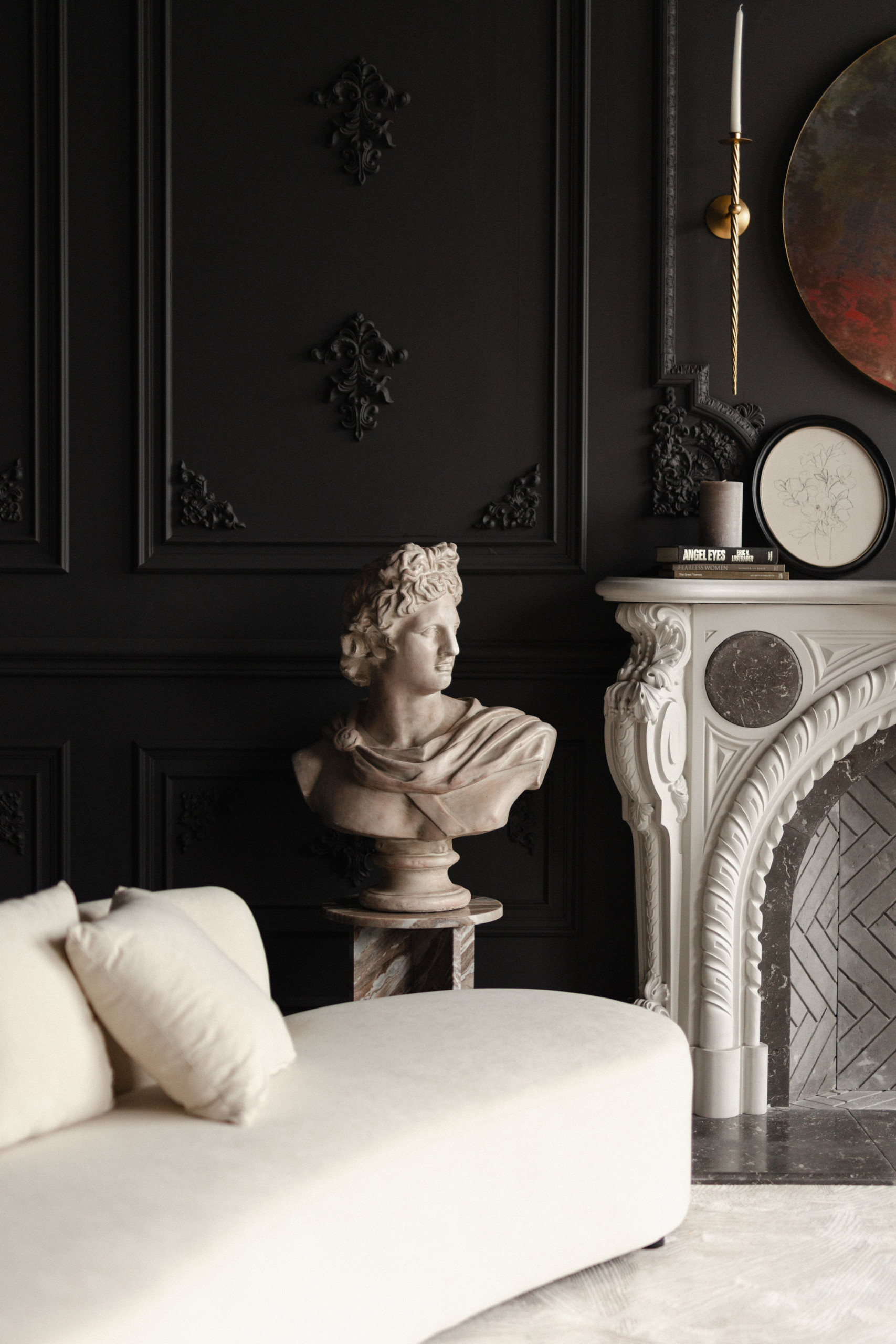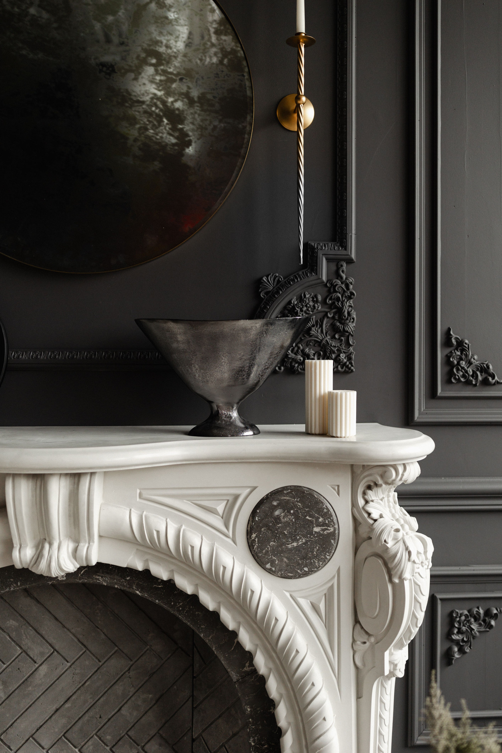 This moodboard channels a quiet luxury holiday aesthetic — timeless, polished, and deeply atmospheric. The space is anchored in elegant contrast, where dark, moody walls meet glowing festive accents. A white statement fireplace and a sculptural white couch act as grounding focal points, brightening the room and creating a sense of balance and refinement. These elements don’t just lighten the visual weight — they elevate the entire space, allowing the darker backdrop to feel curated, not heavy.