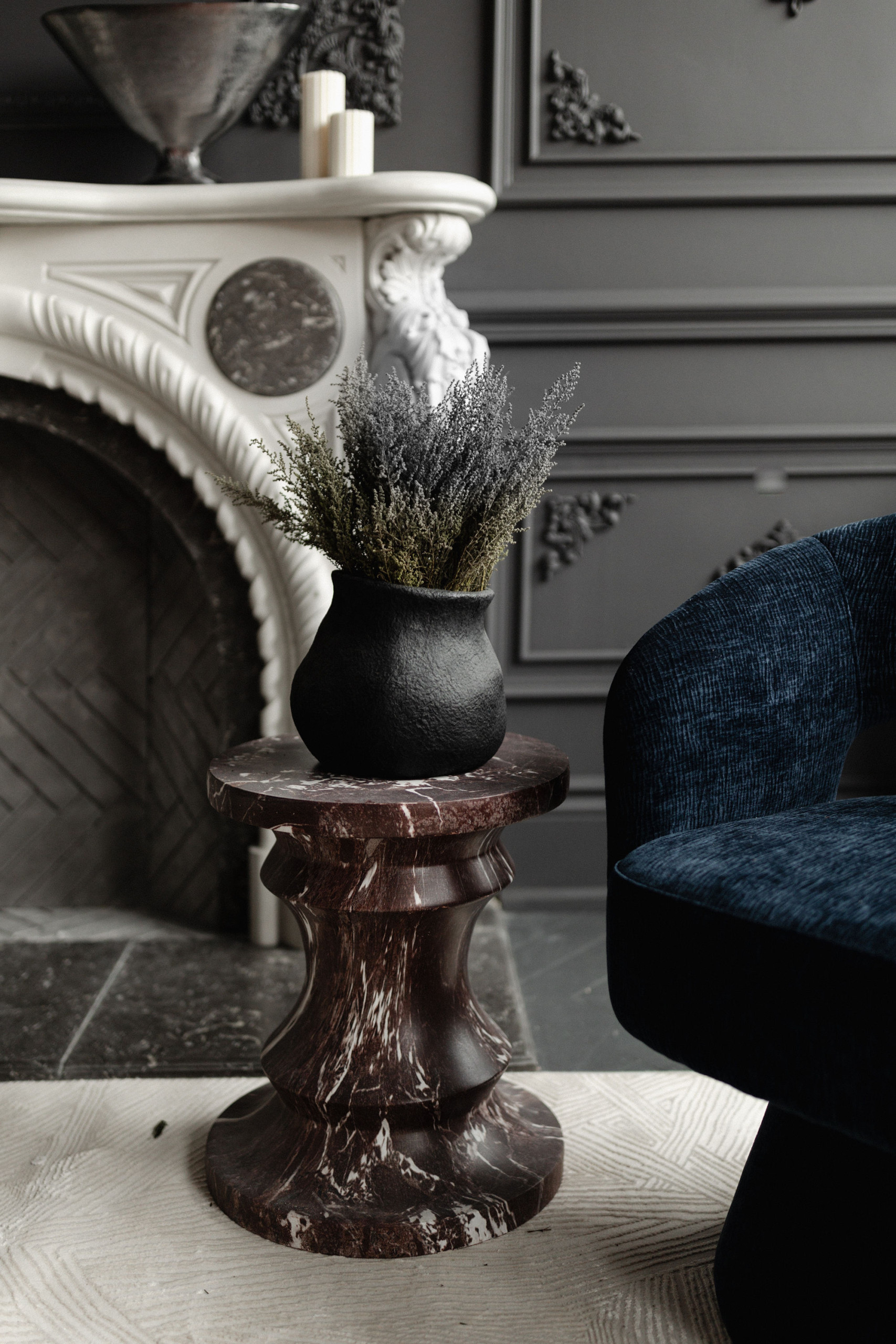 On one side, the bookshelf-adjacent wall will be painted in a deep red, offering a rich, editorial-style accent for photos. This deliberate color addition introduces warmth and visual interest, while remaining true to the overall palette. The result is a space that feels curated and composed, offering variety for imagery — from dark elegance to modern festivity, all within one room.