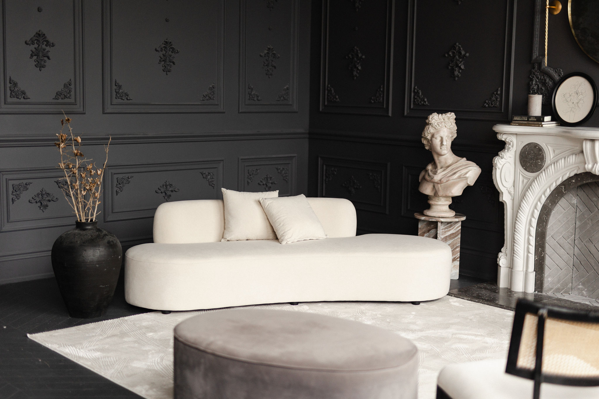 Versatile cyclorama curved white wall with rolling sofa and olive tree accent.