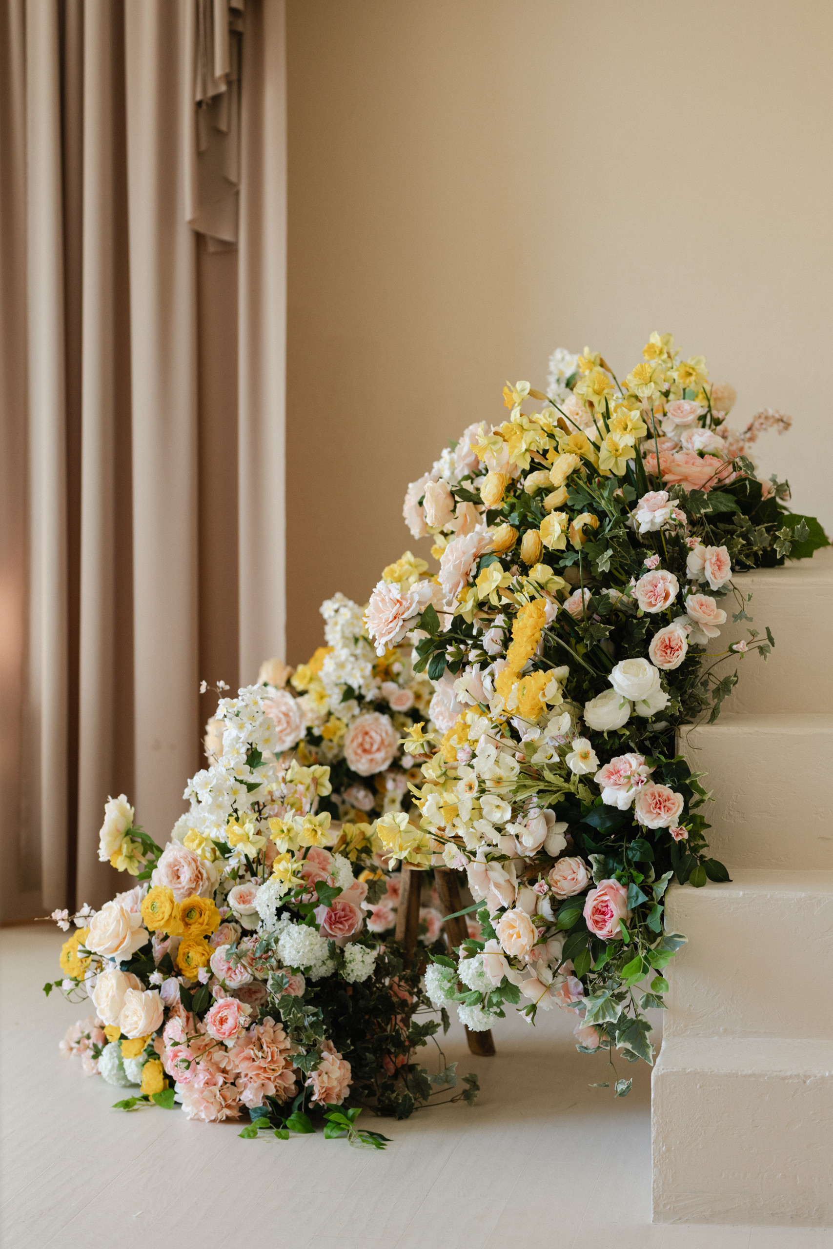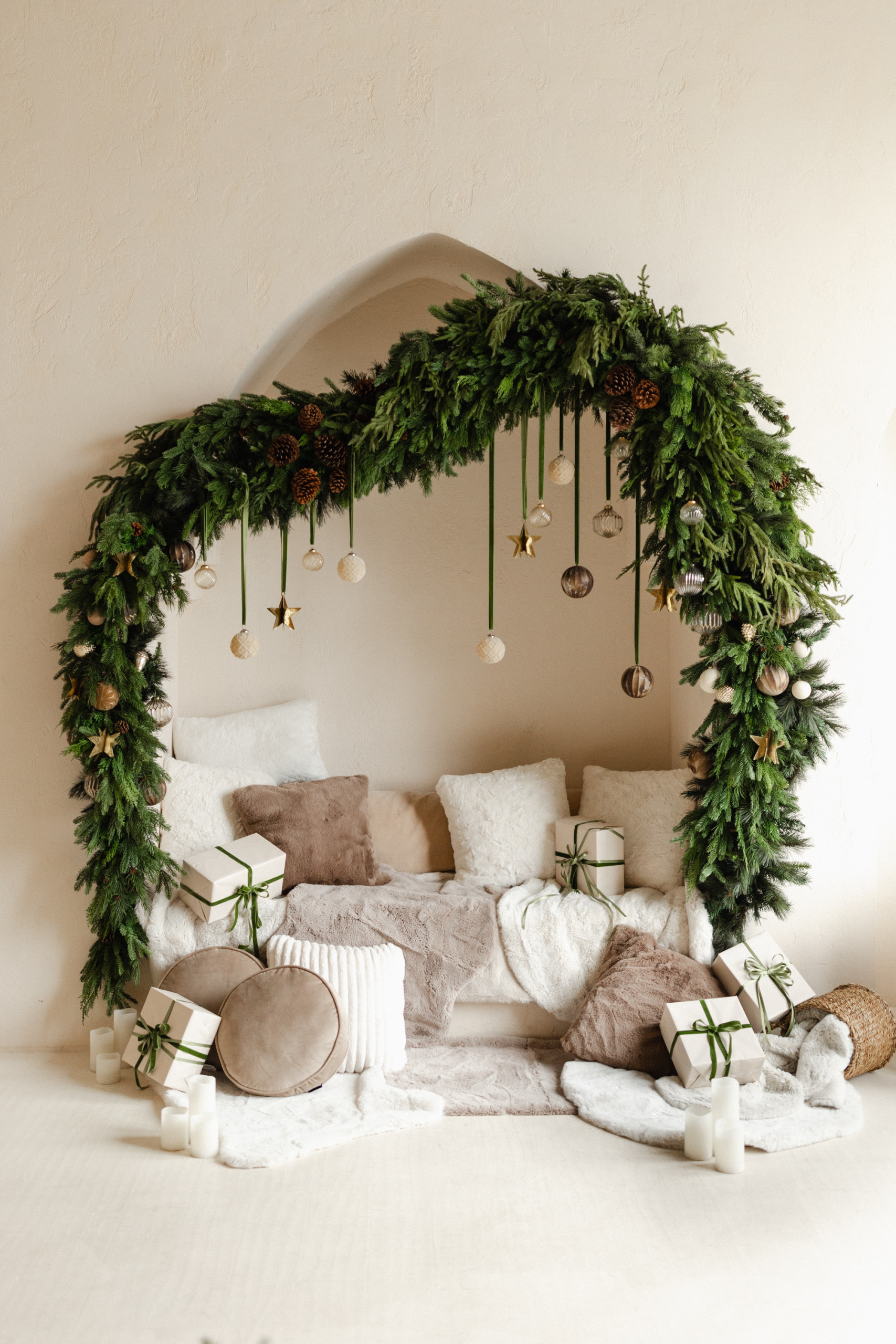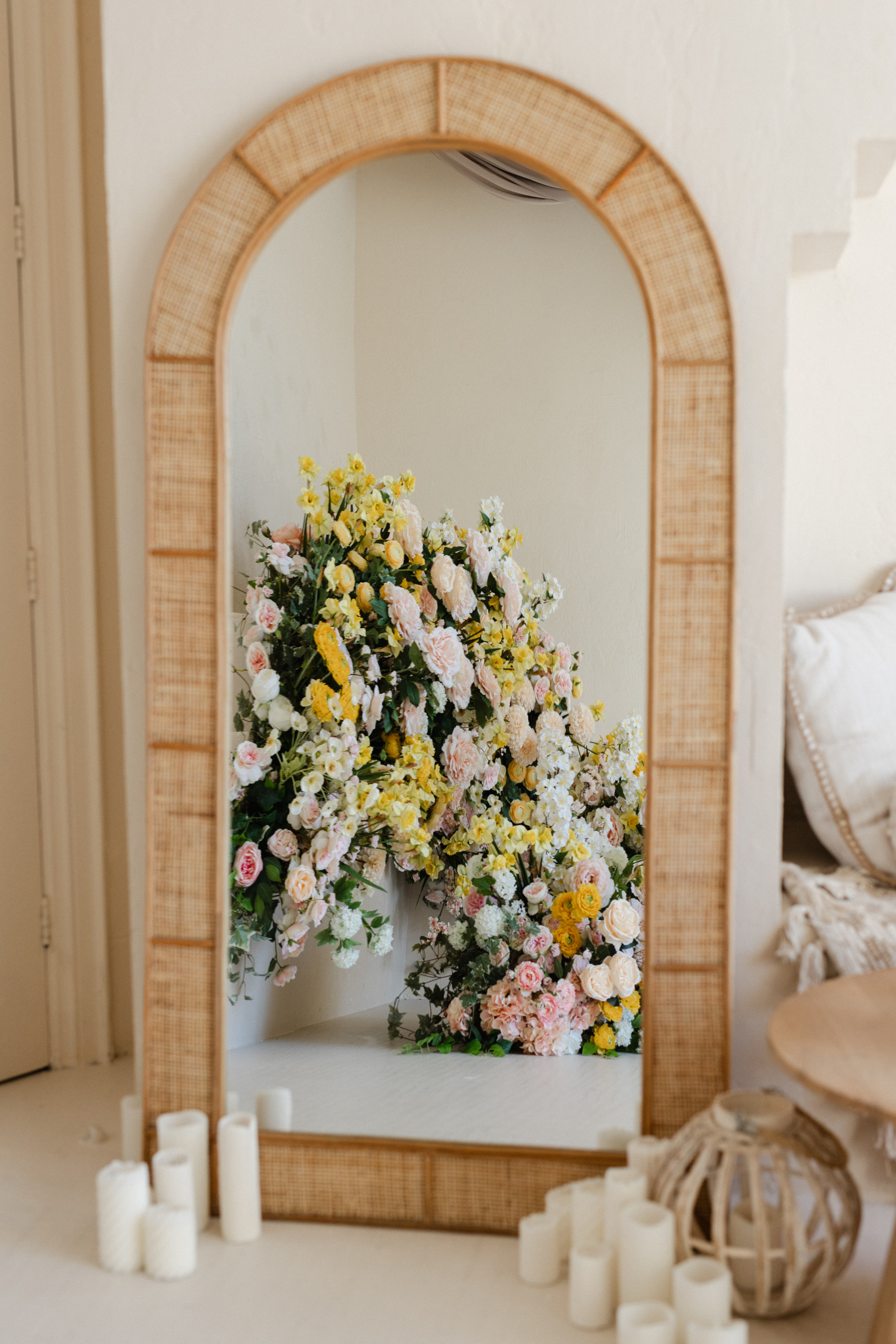 The Lounge is a very versatile 550 square foot room and the most eclectic space of all our studios. This room has textured off-white walls with beautiful Moroccan-themed arches, matching floors and furnished with boho-themed props and eclectic fabrics. The room also has an elevated pedestal with two sets of stairs and is furnished with rattan pieces and a stunning hanging greenery installation. It’s the perfect backdrop for editorials, family portraits, engagement and wedding photography sessions.