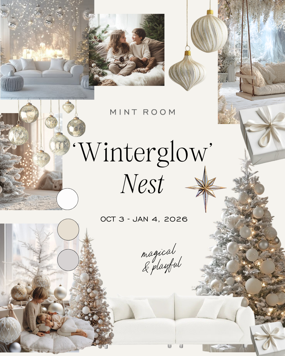 ‘Winterglow’ in the Nest is a winter dreamscape, where snow-dusted trees, shimmering ornaments, and soft neutral tones create a warm, inviting glow that captures the heart of the holidays.