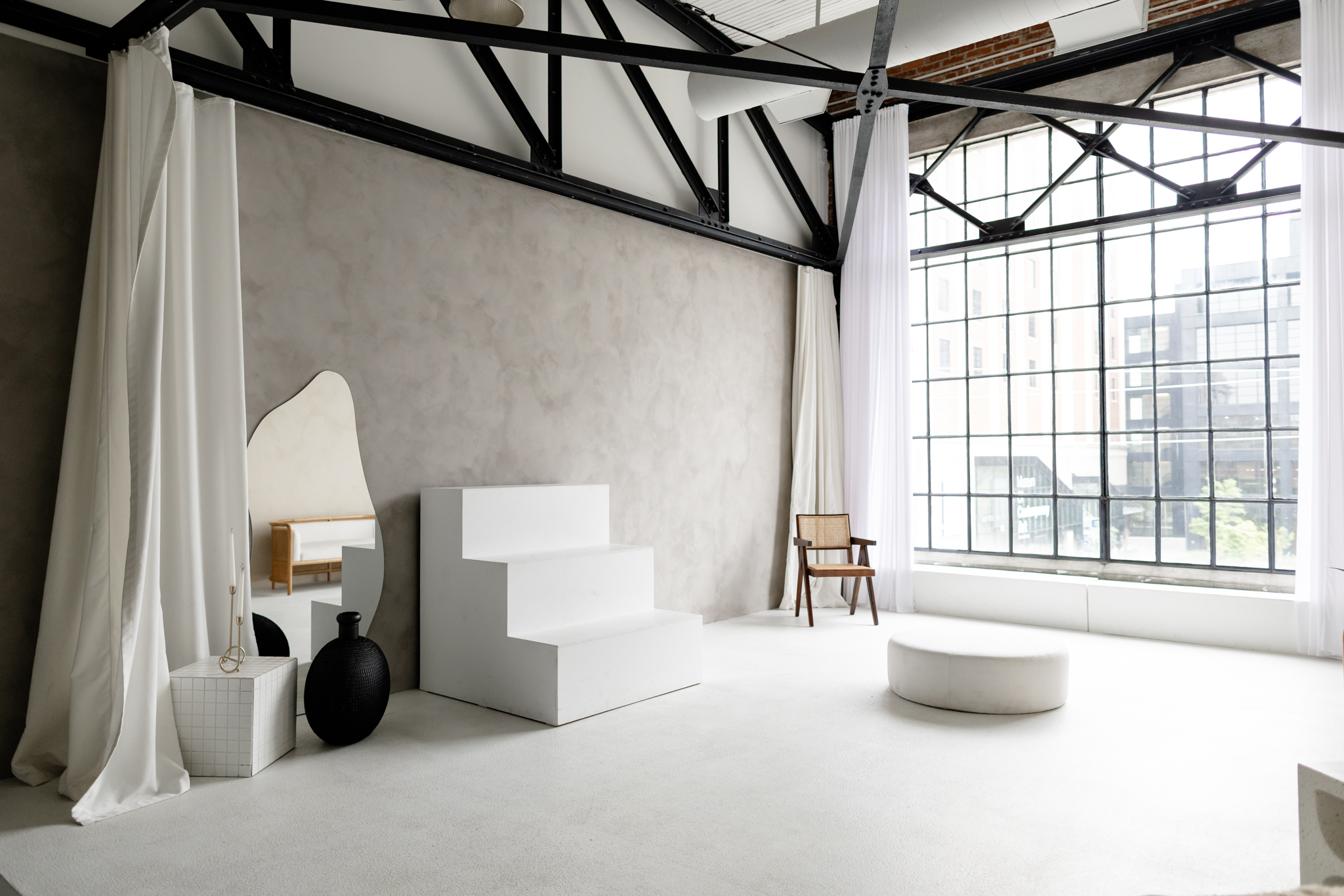 The Solarium is a beautiful studio addition to Preto Loft, inspired by light minimalistic tones, natural textures and soft fabrics. Bright white floors and ceilings create a contrast with black trusses and oversized New York loft-style windows. The room is filled with bright natural light throughout the entire day, from sunrise to sunset due to its South-facing windows. We’ve minimized the floor shadows in the room by raising the floors with a podium, added some greenery and curated unique modern furniture pieces to provide a variety of different vignettes.