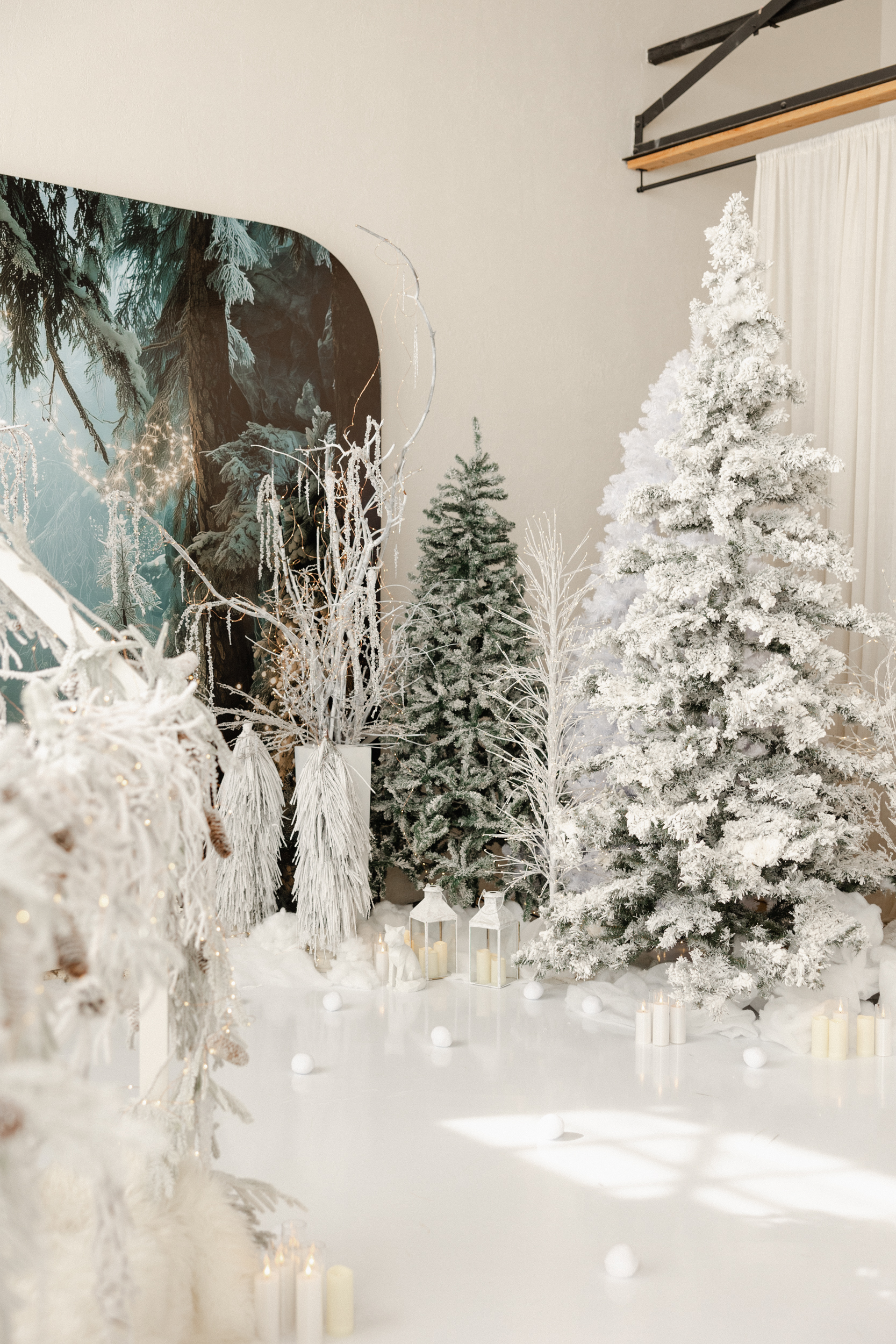 The pristine bright walls and ceilings make the West Side Studio the ultimate canvas for creative projects. The rest of the studio is adorned with modern furniture and timeless decor accents. A light bone lime wash on our large arch, and light oak herringbone style floors complete the rooms New York Style Loft aesthetic. The studio has two oversized 13 foot tall windows, large double doors, and folding doors that join the room together with the East Side. The studio room is south facing and has over 900 square feet of shooting space.