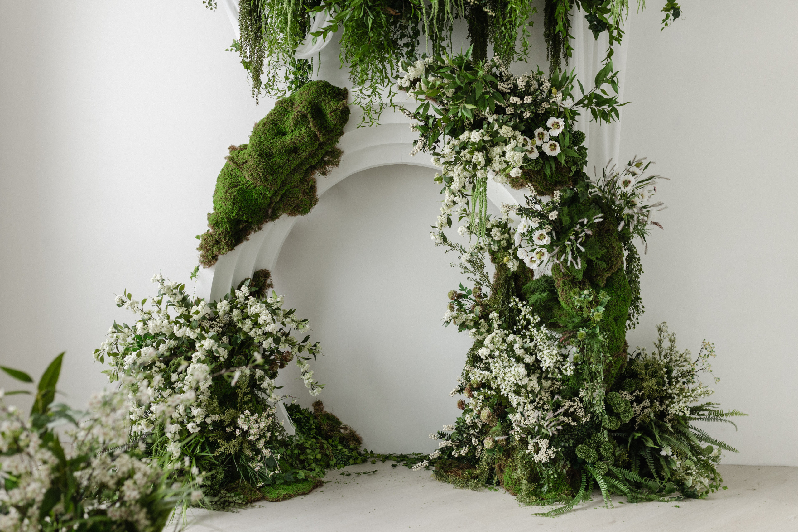 This installation invites visitors into a softened, natural world — one that feels overgrown, untouched, and quietly immersive. At its center stands a round arch, gently reclaimed by moss, its form blurred by organic growth rather than defined by structure. Around it, moss-covered islands emerge across the floor, scattered with delicate white wildflowers, creating a landscape that feels discovered rather than designed.