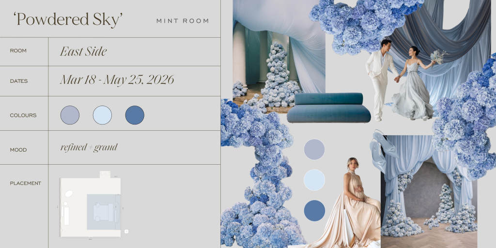 An airy, sculptural set inspired by the softness of a spring sky just before dusk. Powdered Sky transforms the East Side into a grand yet weightless environment, layered in flowing powder-blue drapery that cascades from ceiling to floor. The fabric moves like air — creating depth, dimension, and an elegant sense of motion in every frame.