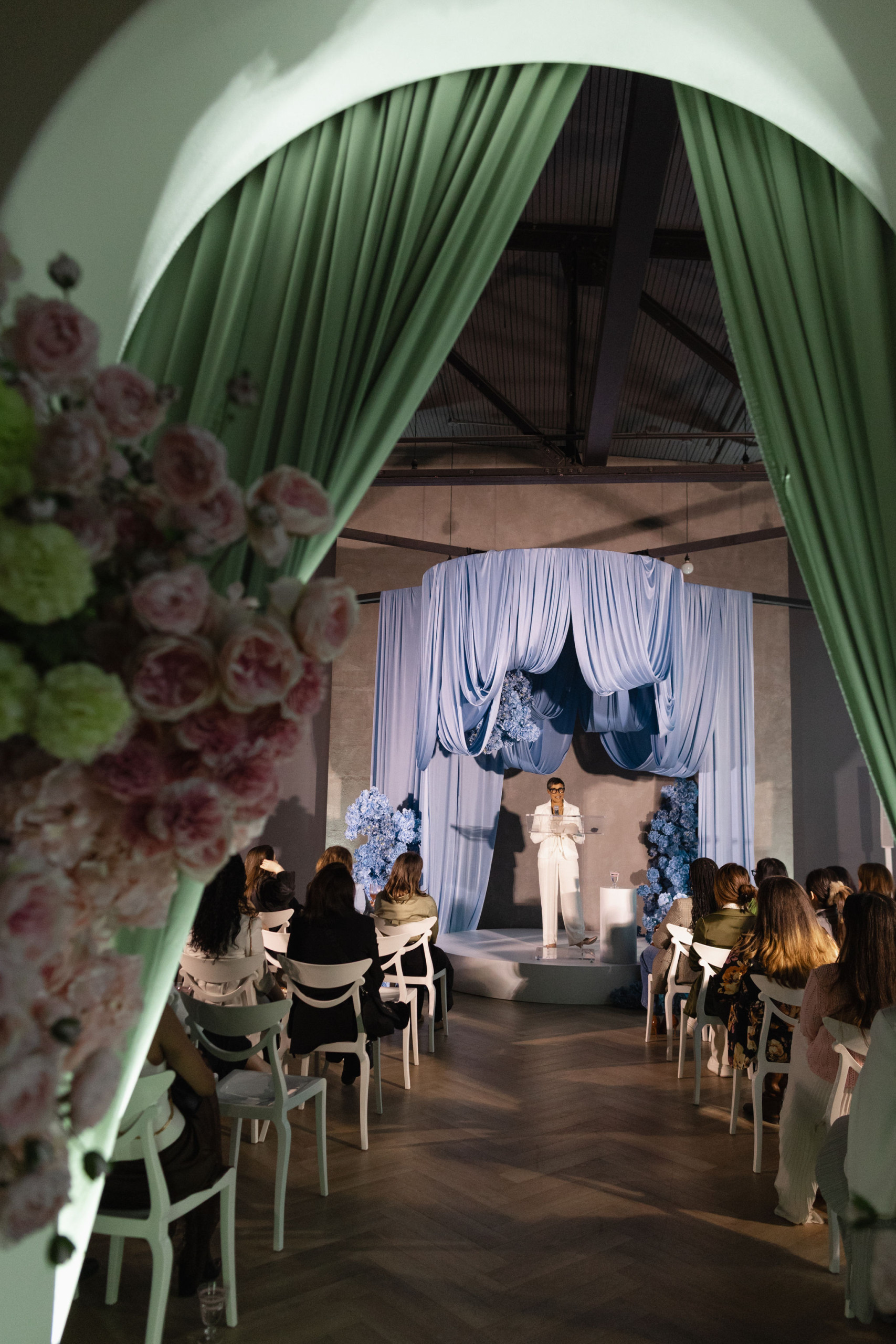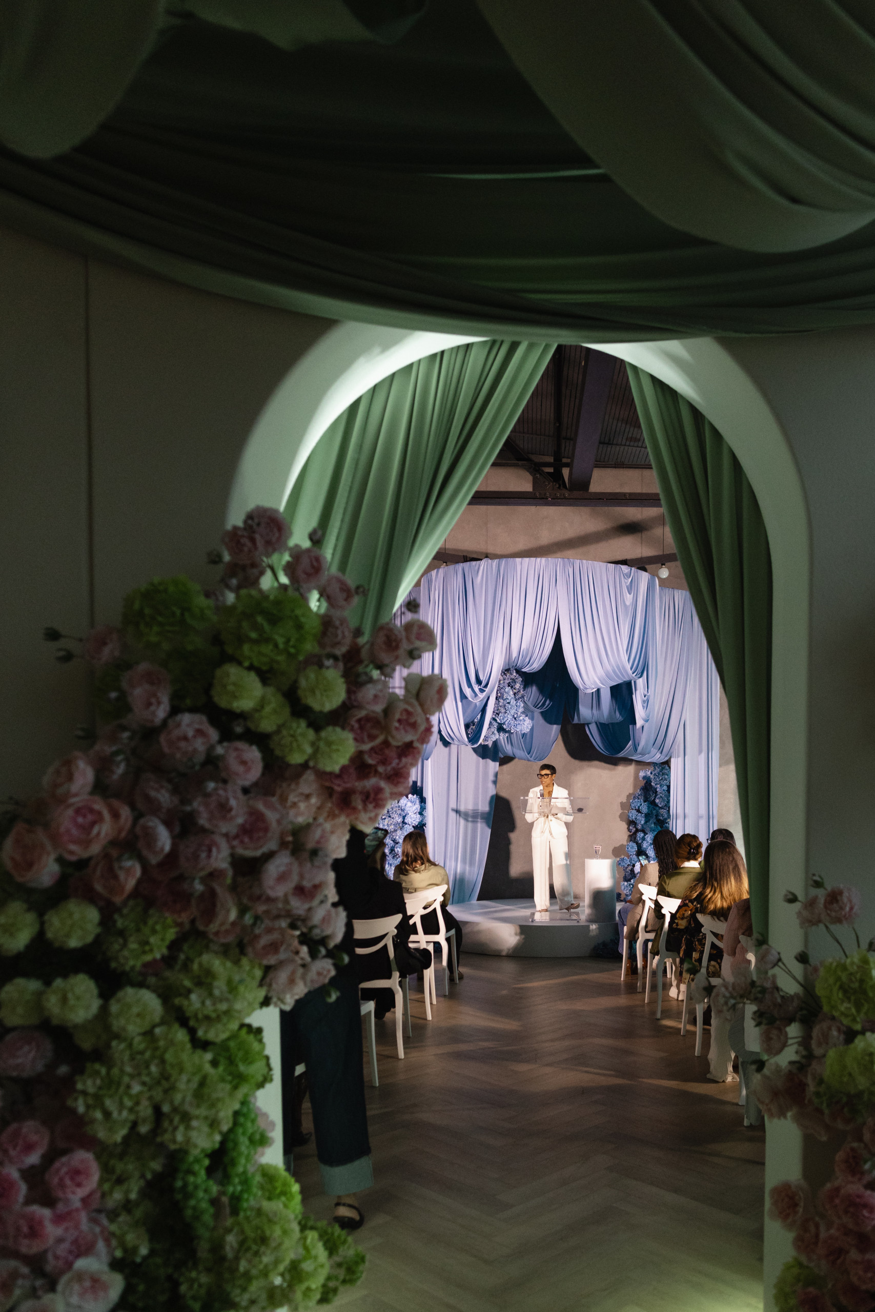 As the event progressed, guests were guided toward our Powdered Sky installation in the East Side Studio. To create a more intentional transition, we opened select wall panels directly behind the installation, offering a subtle reveal into the next space rather than fully opening the room, which created a beautiful “walk-through” experience.