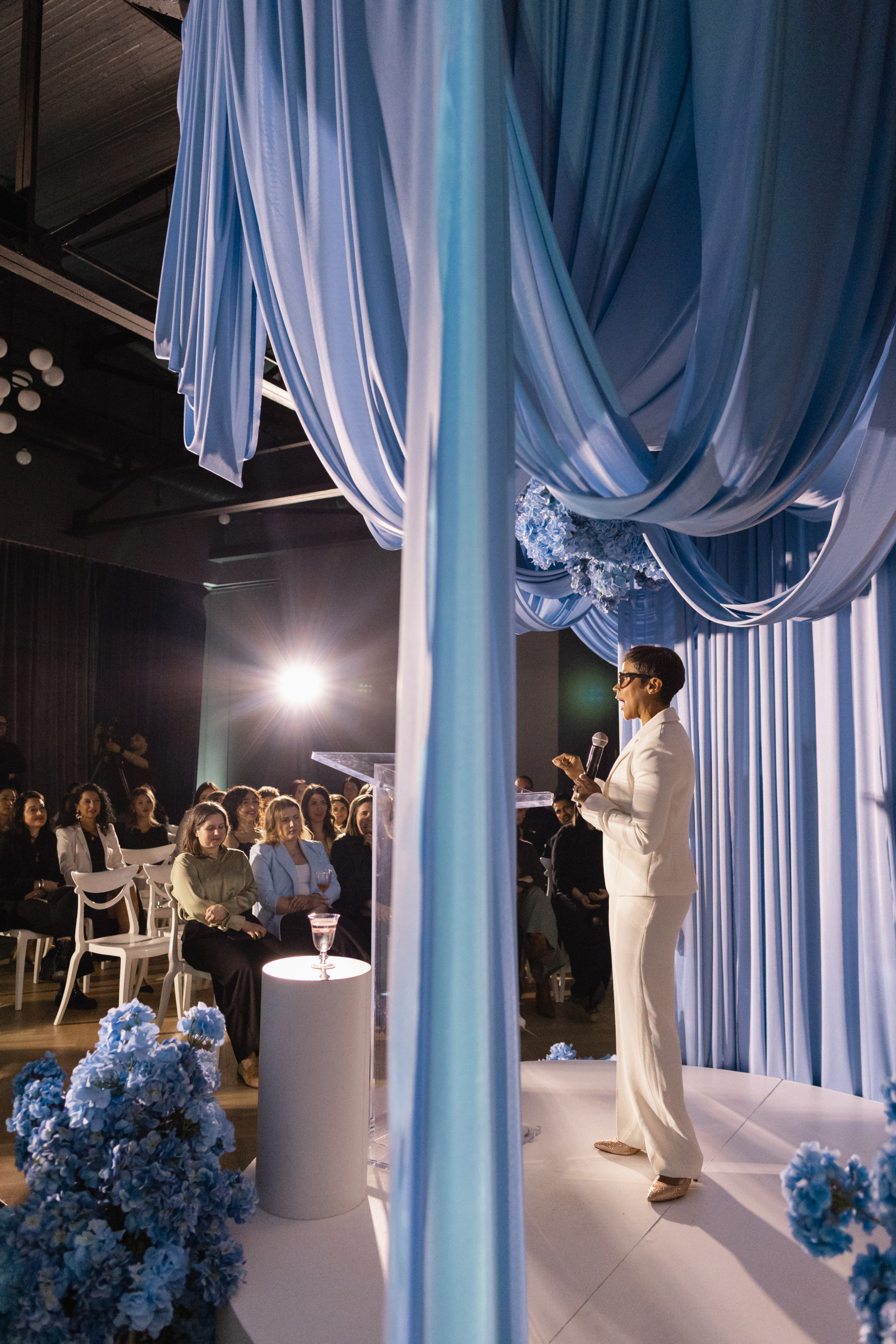 As guests moved through, they were framed perfectly in front of the Powdered Sky installation, which became the backdrop for the evening’s keynote speaker, Kathy Romero. A globally recognized event planner, Kathy shared thoughtful insights from her experience designing elevated celebrations around the world, followed by a Q&A.