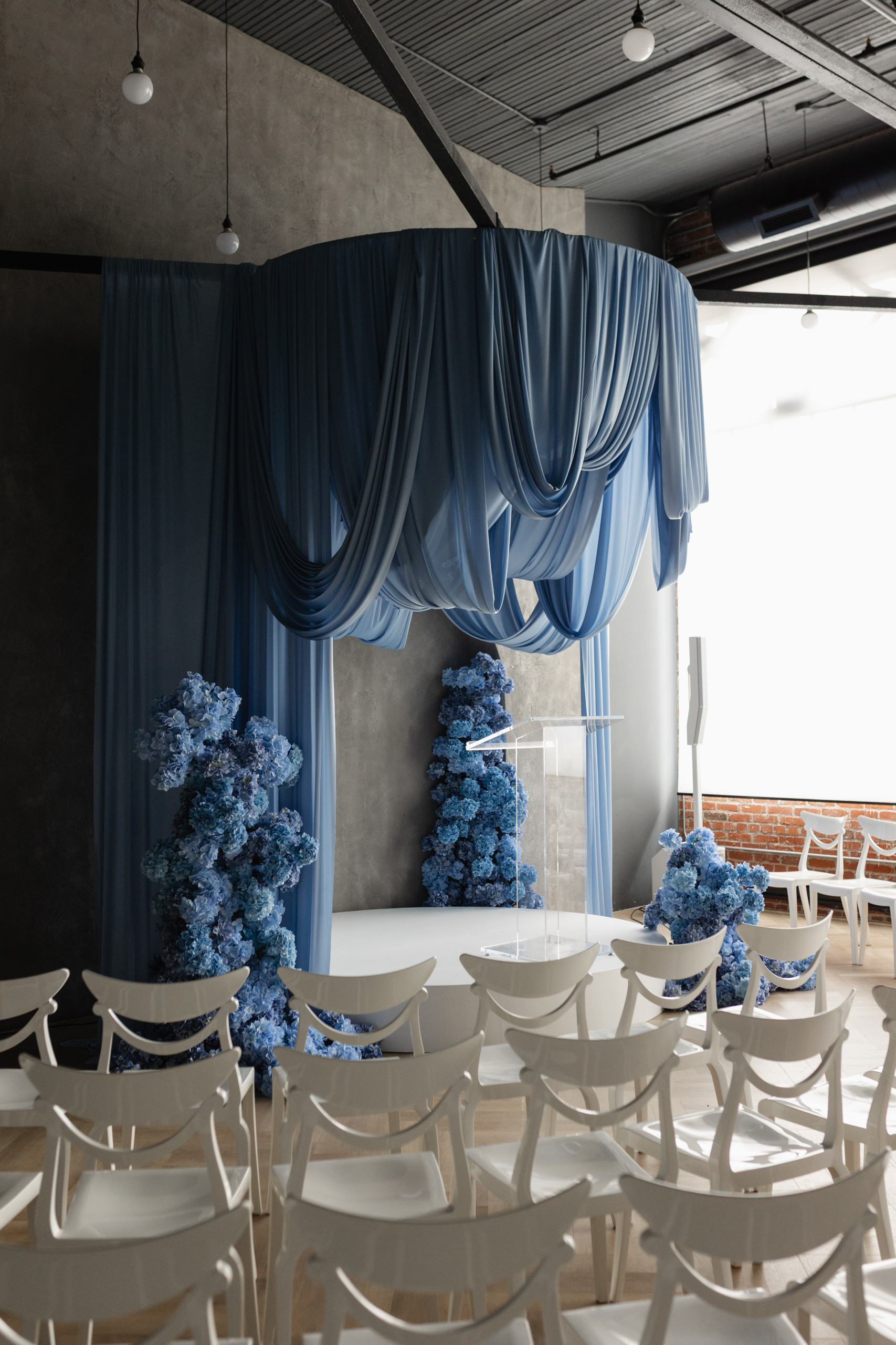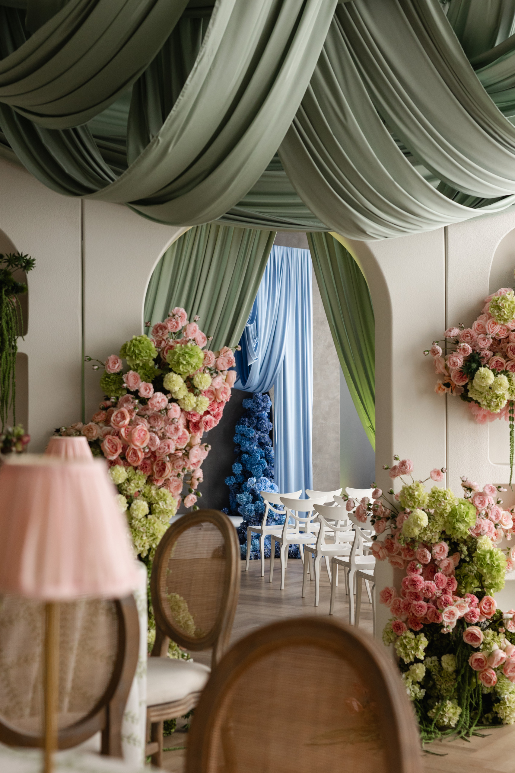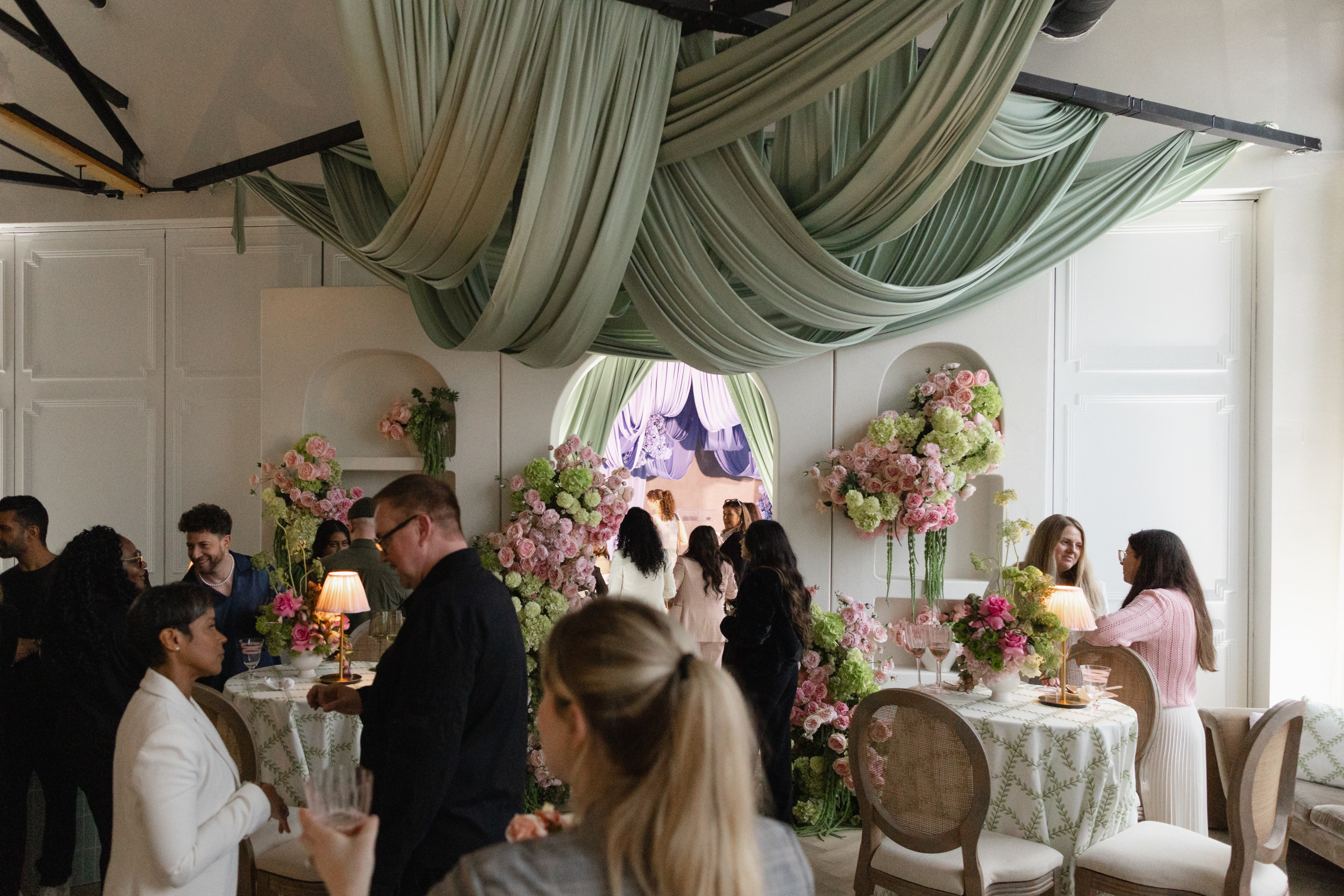 East Side Studio set up for an 80-person speaker panel, arranged around our existing “Powdered Sky” installation. The setup used the draoubg and florals as a natural backdrop, with lighting and a podium framing the speaker at the front of the room.