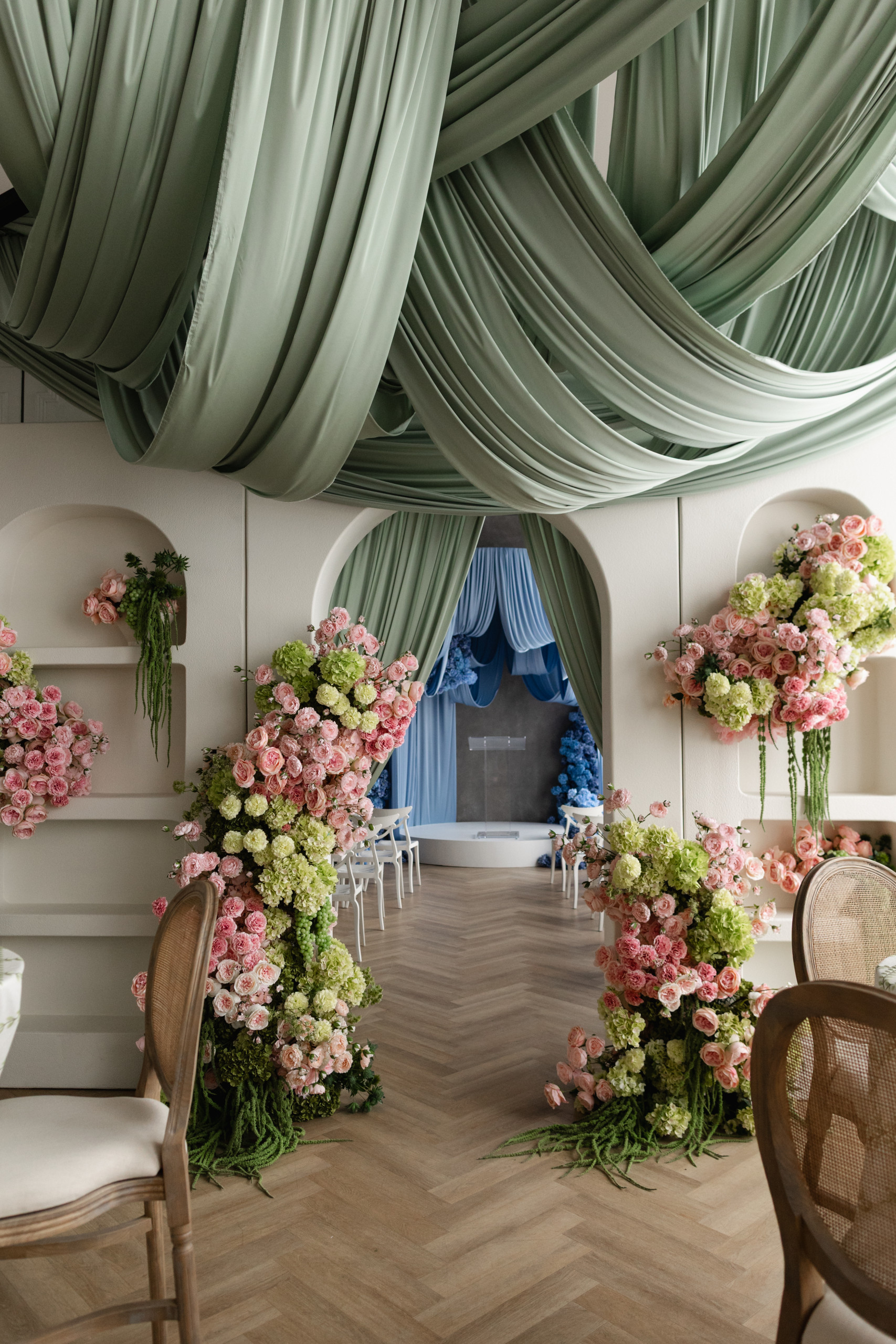 The event used the existing floral installations to enhance it’s aesthetic, saving on large production costs to build installations for a single event.
