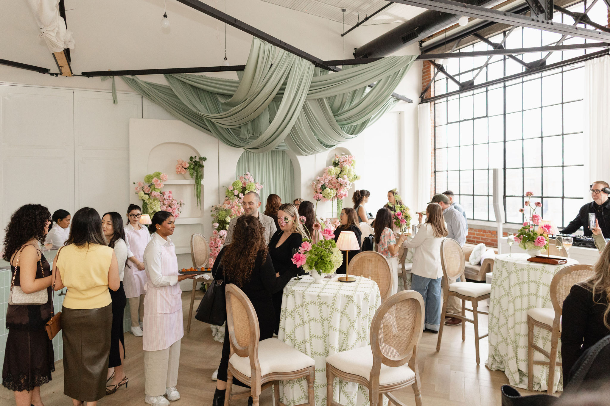 West Side Studio set up for a cocktail reception, featuring styled bar tables and stools, a 12-foot bar, and an oversized charcuterie station. The room was dressed around our Atelier Spring installation, with linens and accessories chosen to complement the florals throughout.