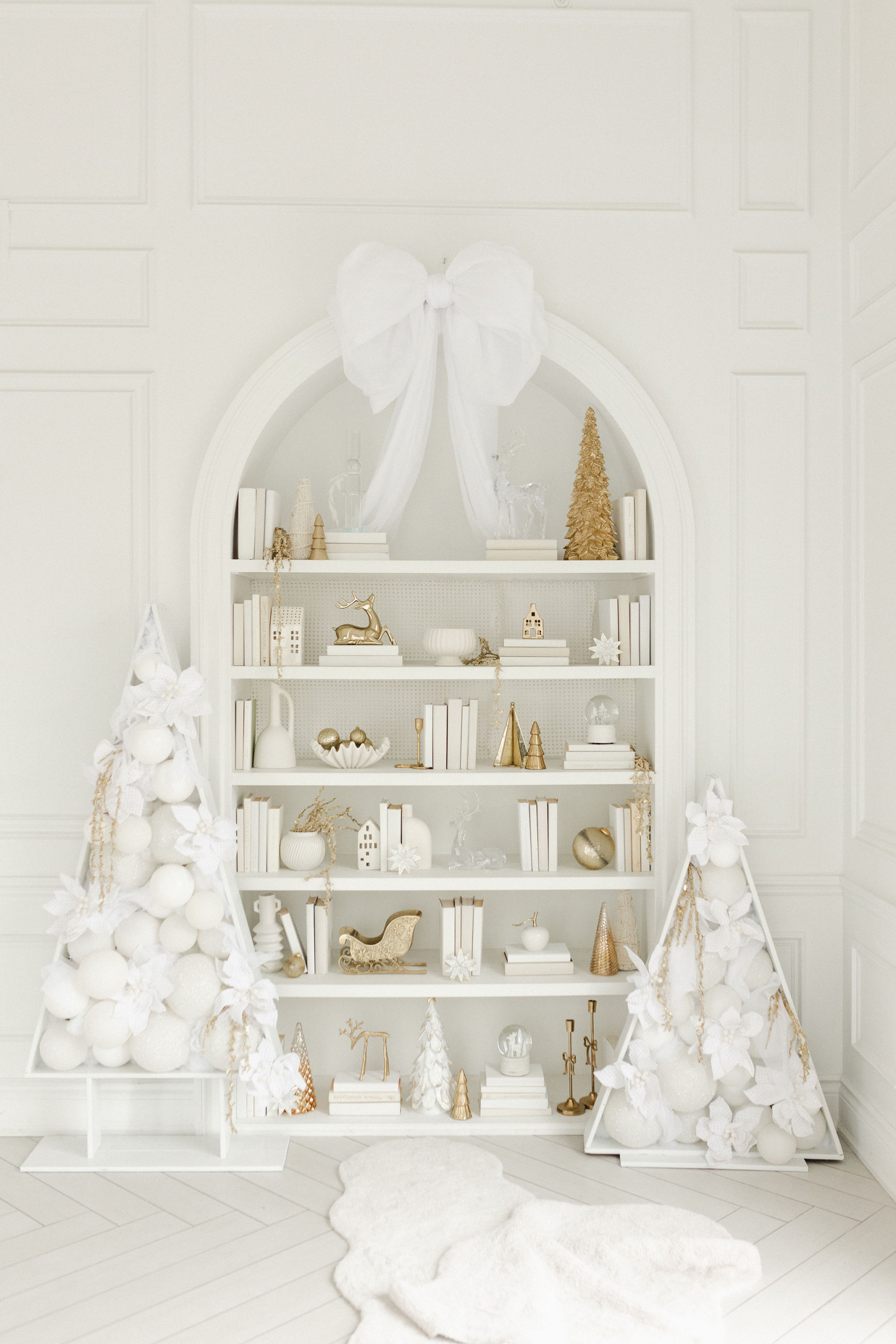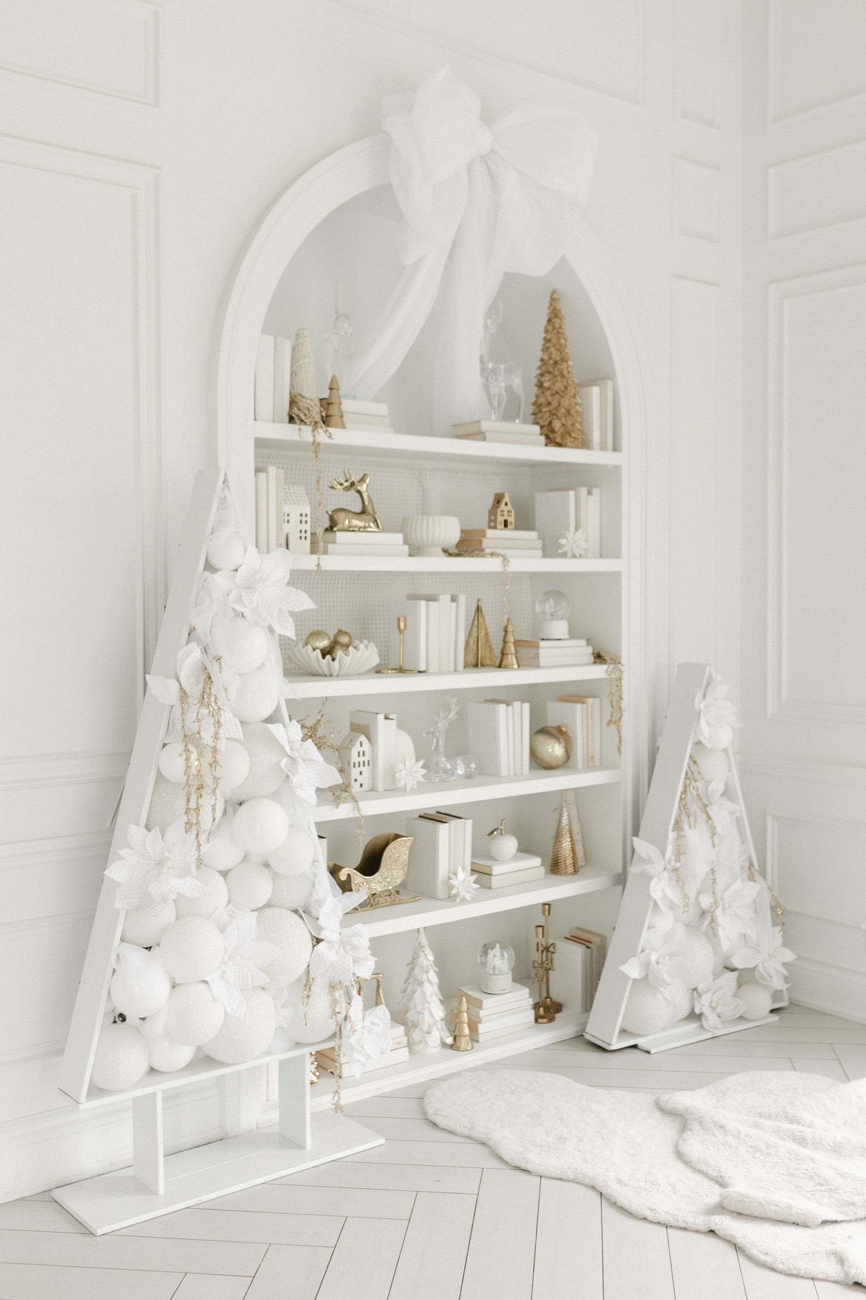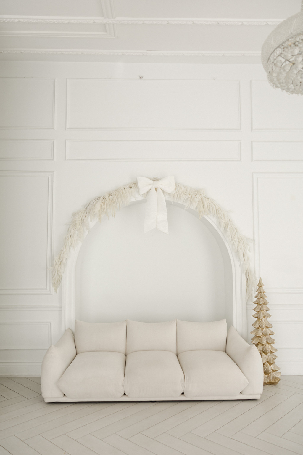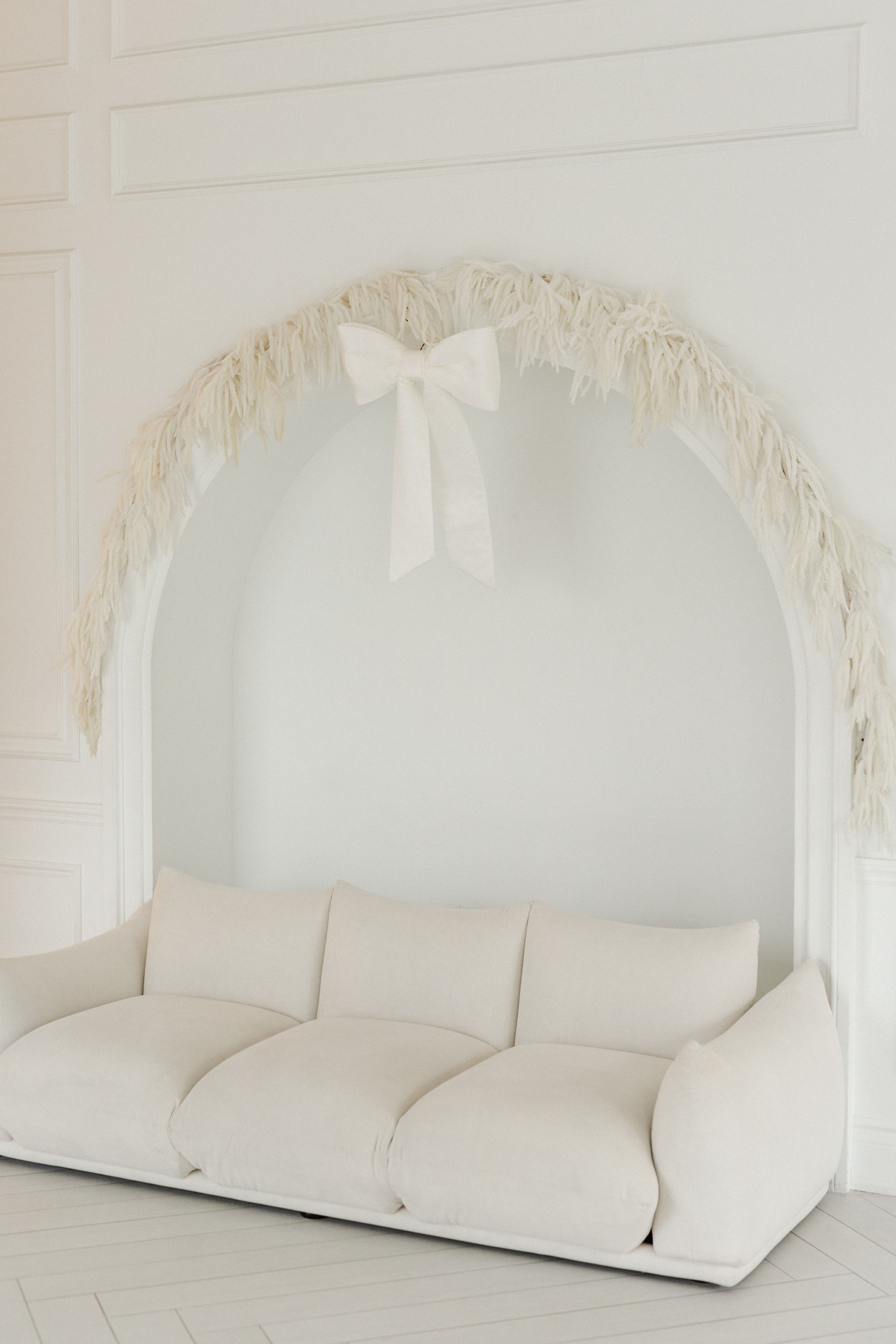The White Loft is a bright all-white elegant rectangular corner room with three large windows facing South and East. It features a tall slanted ceiling with delicate moldings and a chandelier, accented by round crystal medallion; off-white herringbone floors with a grand European feel, elegant and modern 7 foot arch, grand arched bookshelf, geometric oversized double doors and more. This space is perfect for branding sessions, editorial shoots and elegant family portraits.