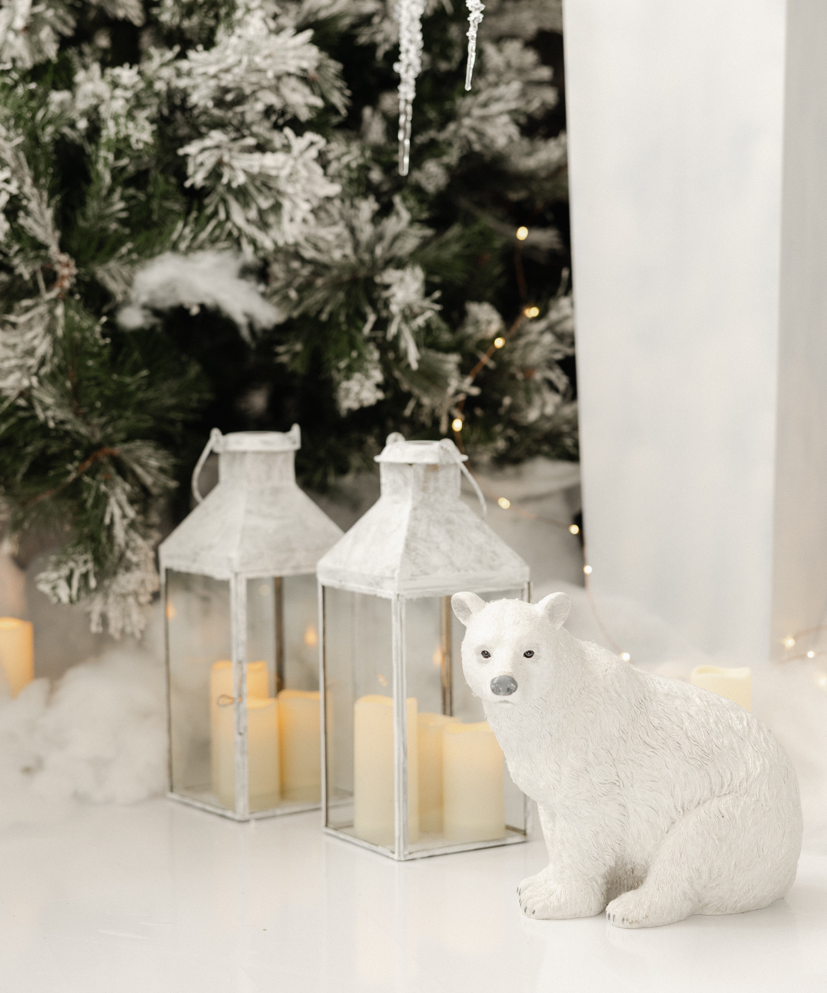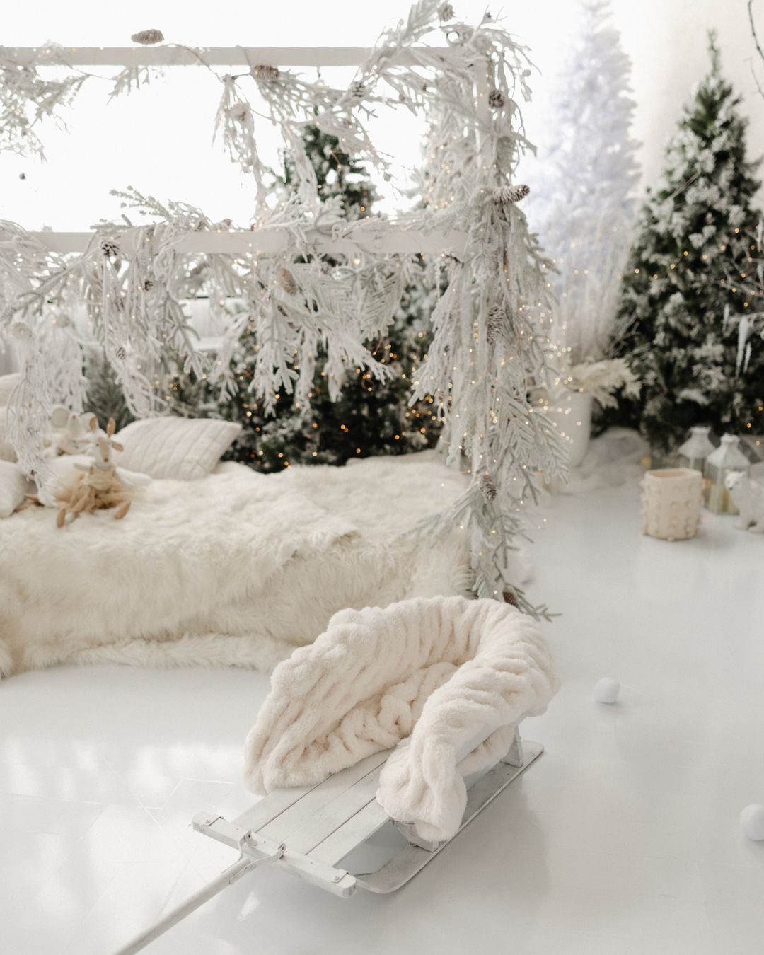 Playful touches—like a cozy, fairy-lit bed nook, a vintage wooden sled adorned with greenery, and glowing lanterns—add warmth and charm to the icy palette of white, silver, and muted earth tones. The space feels whimsical yet inviting, perfect for capturing childlike wonder while still keeping a refined, editorial aesthetic.
