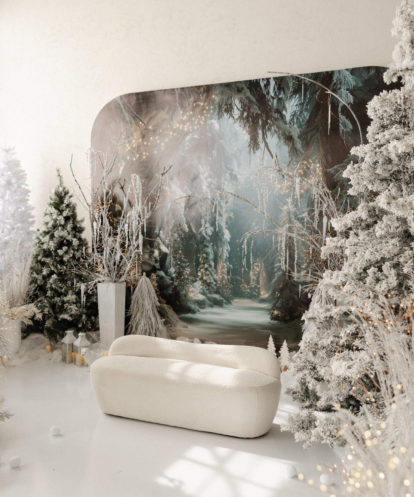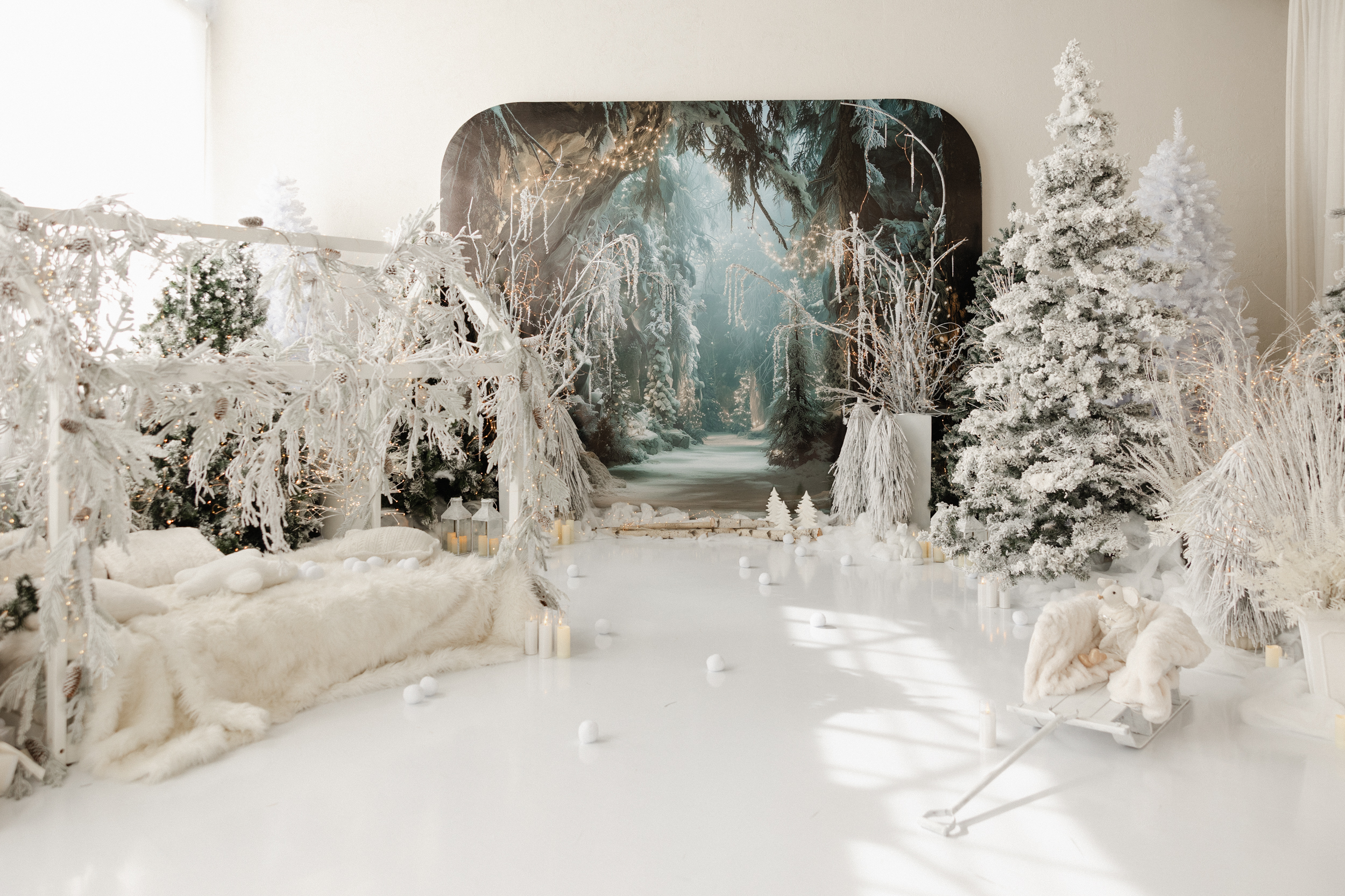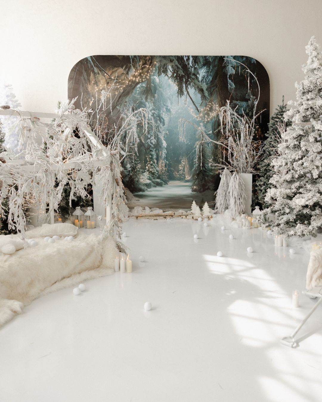 The design is anchored by a custom-printed winter forest backdrop, creating the illusion of stepping straight into a snow-dusted wonderland. Soft, frosted evergreens, shimmering icicles, and glistening garlands layer in a magical, almost ethereal glow.