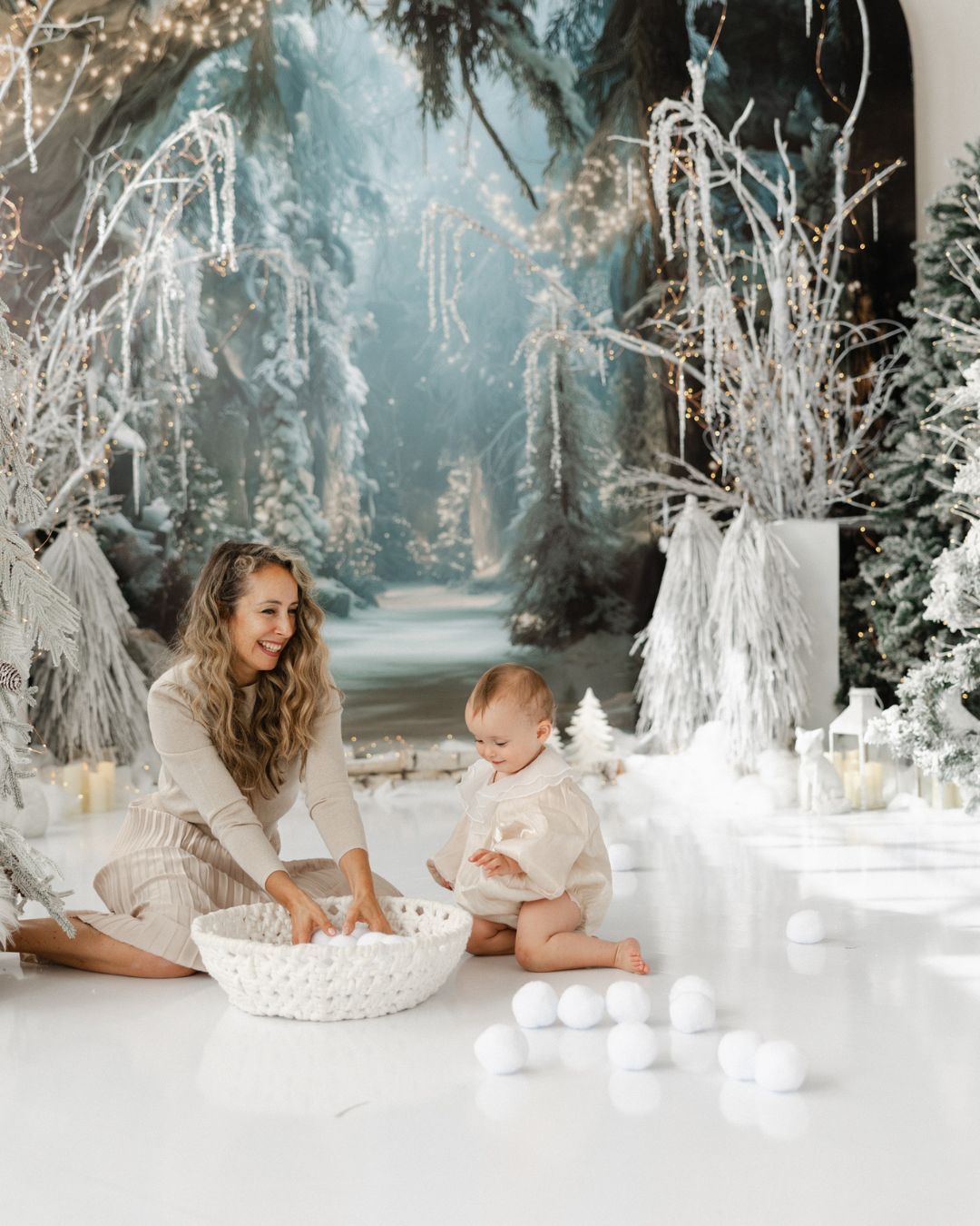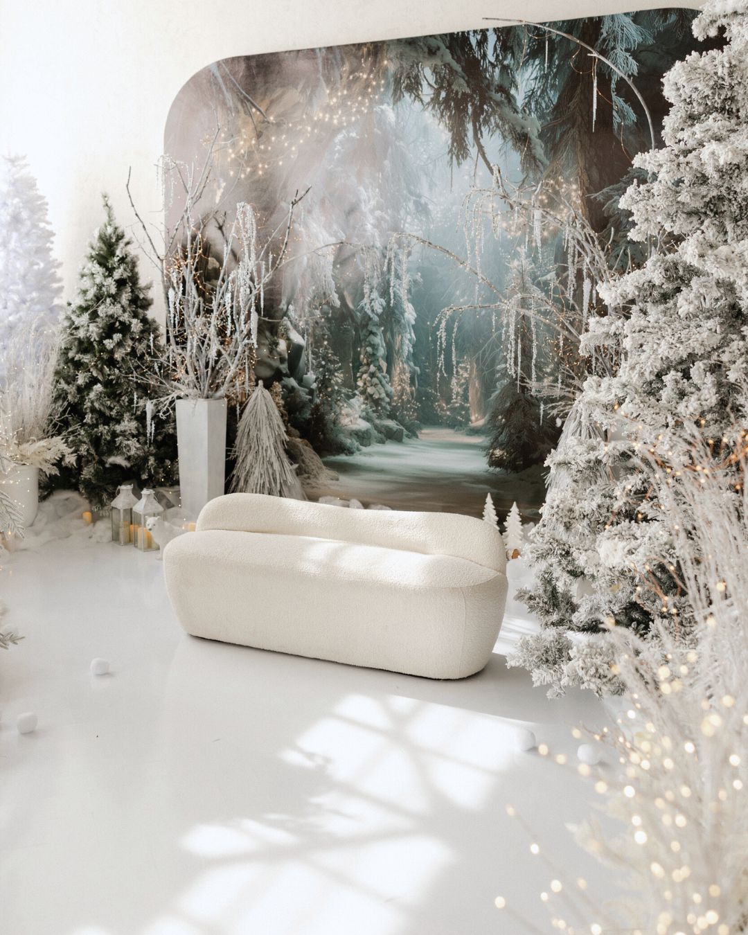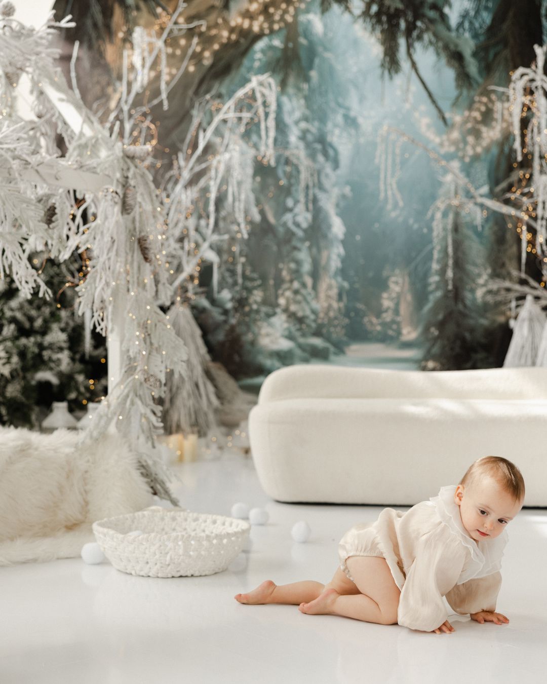 The design is anchored by a custom-printed winter forest backdrop, creating the illusion of stepping straight into a snow-dusted wonderland. Soft, frosted evergreens, shimmering icicles, and glistening garlands layer in a magical, almost ethereal glow.