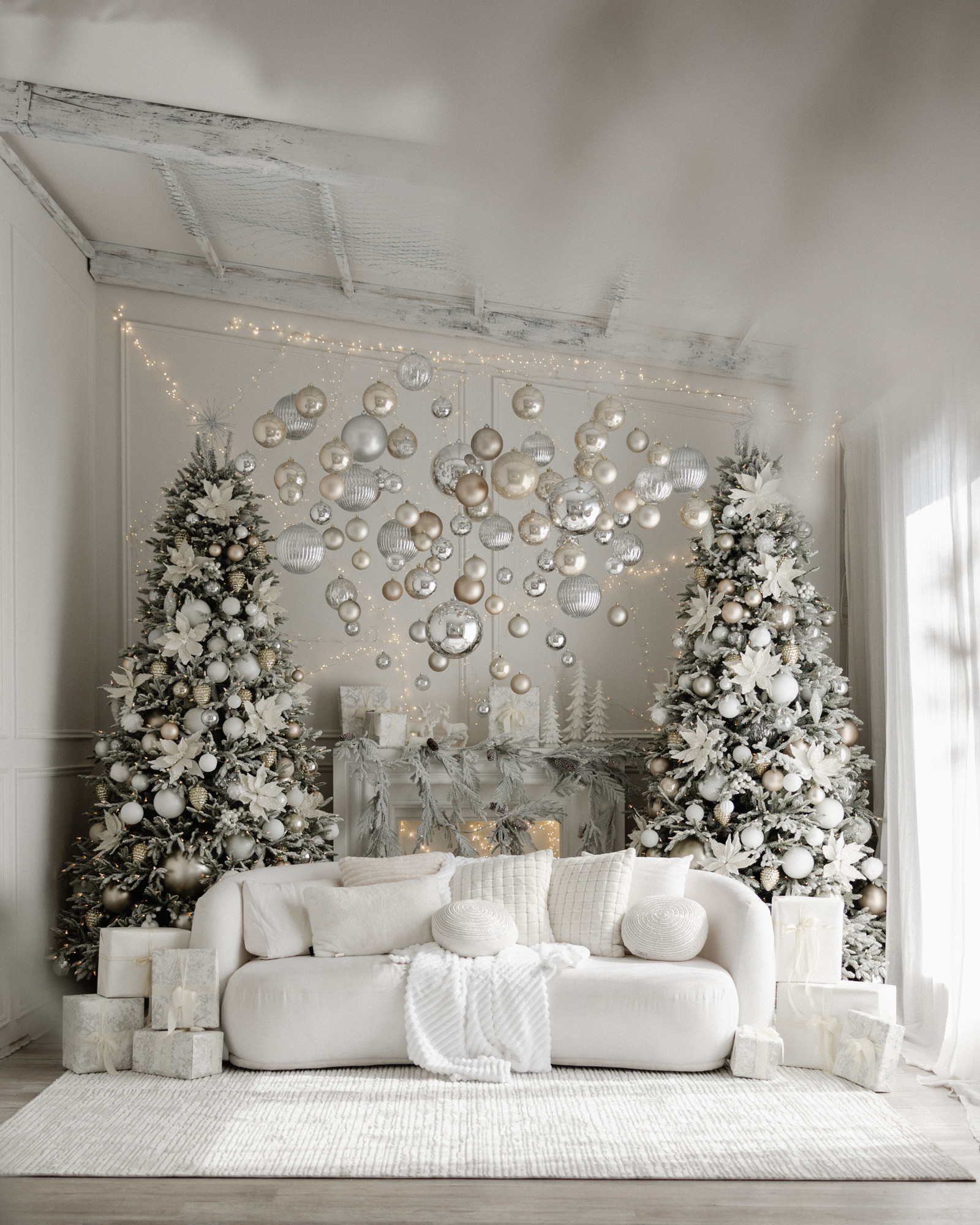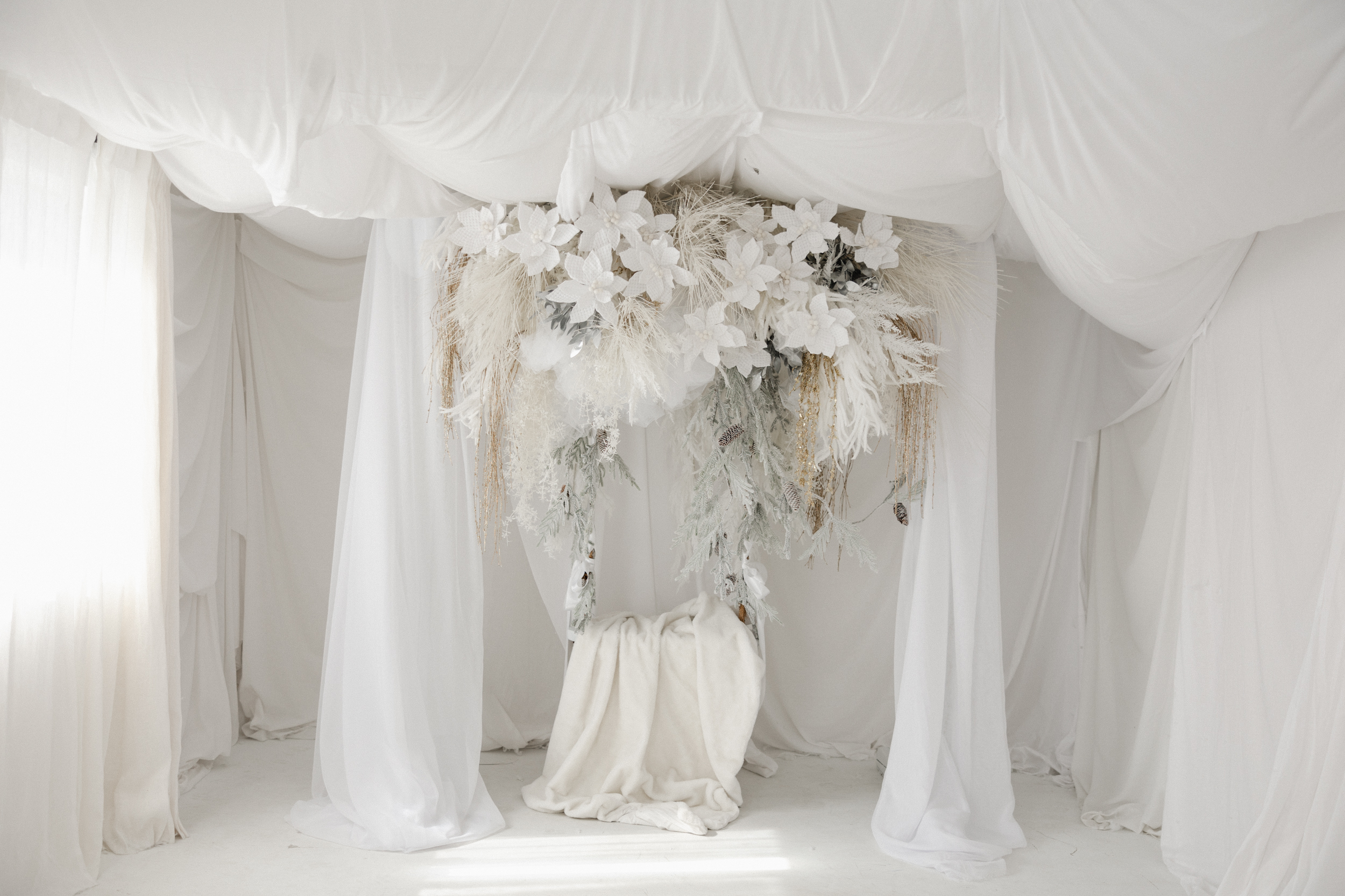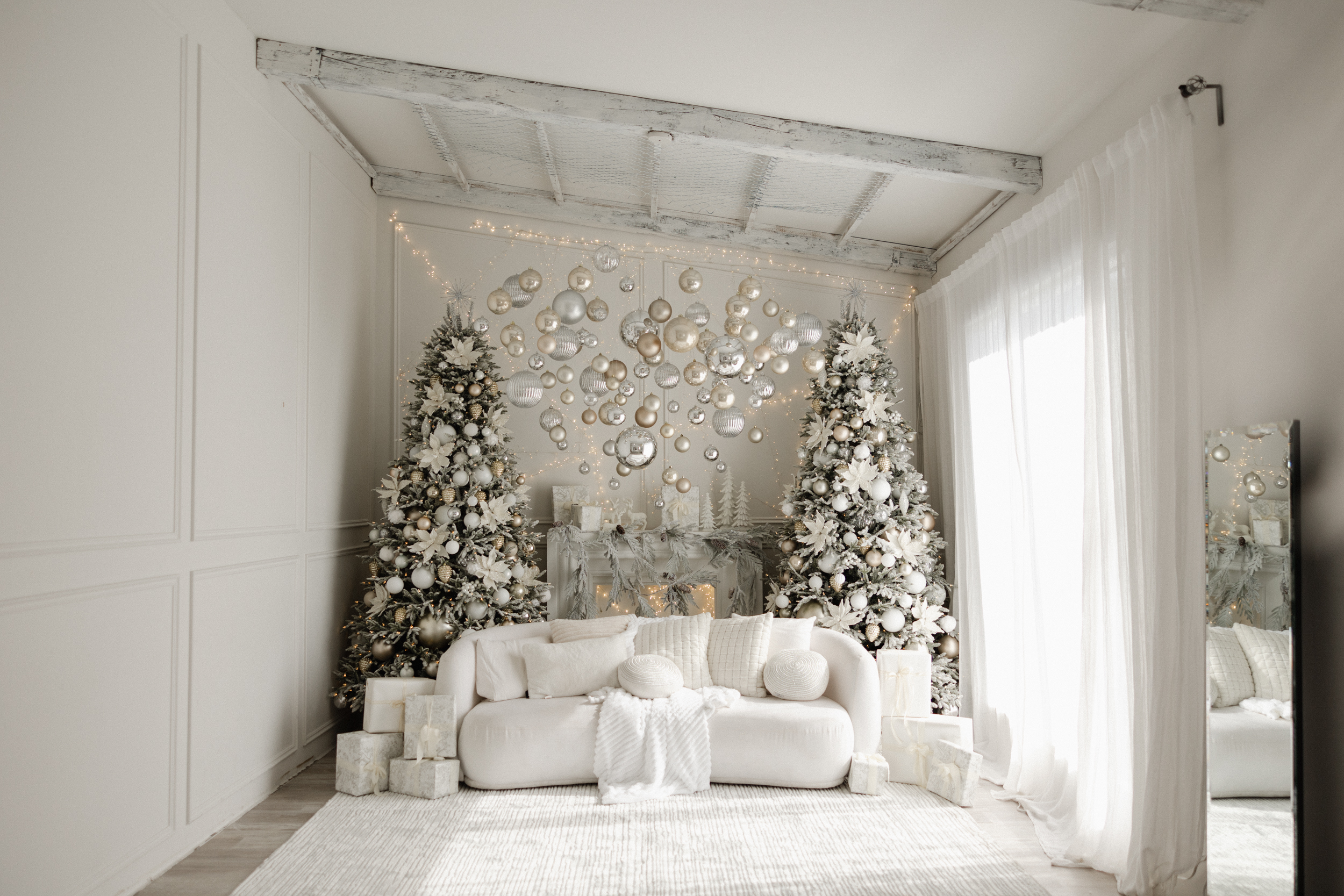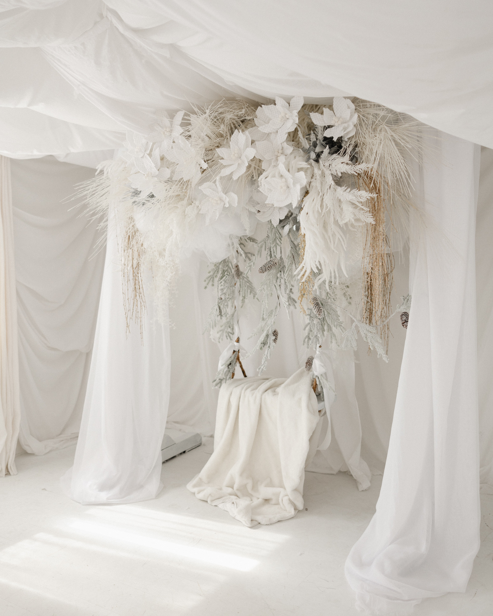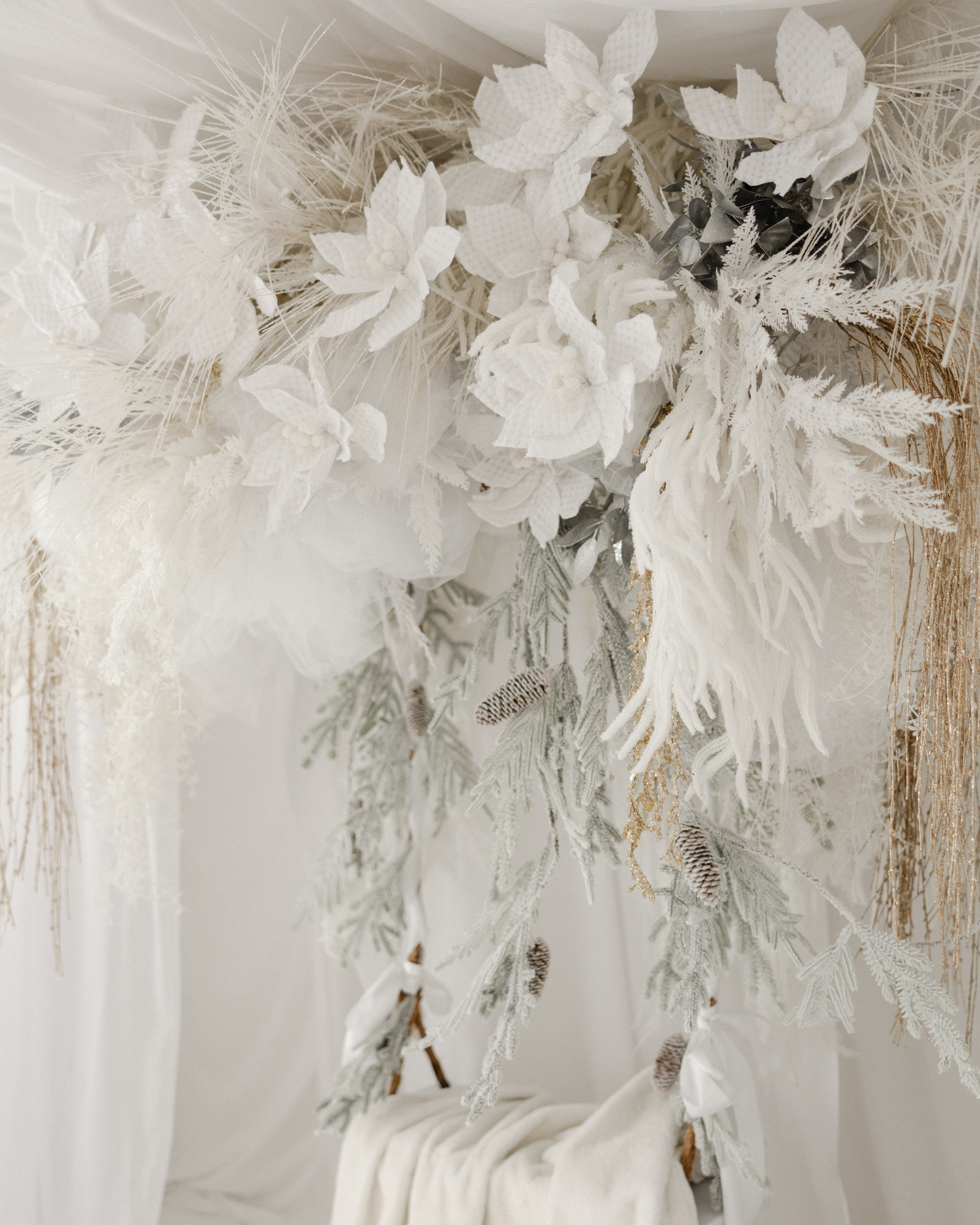At its center, a cozy white lounge is framed by two flocked Christmas trees, dressed with oversized baubles in ivory, champagne, and soft metallics. Beautifully wrapped gifts, delicate garlands, and festive textures layer in magic and sophistication – perfect for family portraits, children’s milestones, or holiday campaigns. A fully adorned white swing adds a whimsical touch, offering variety and playful charm.