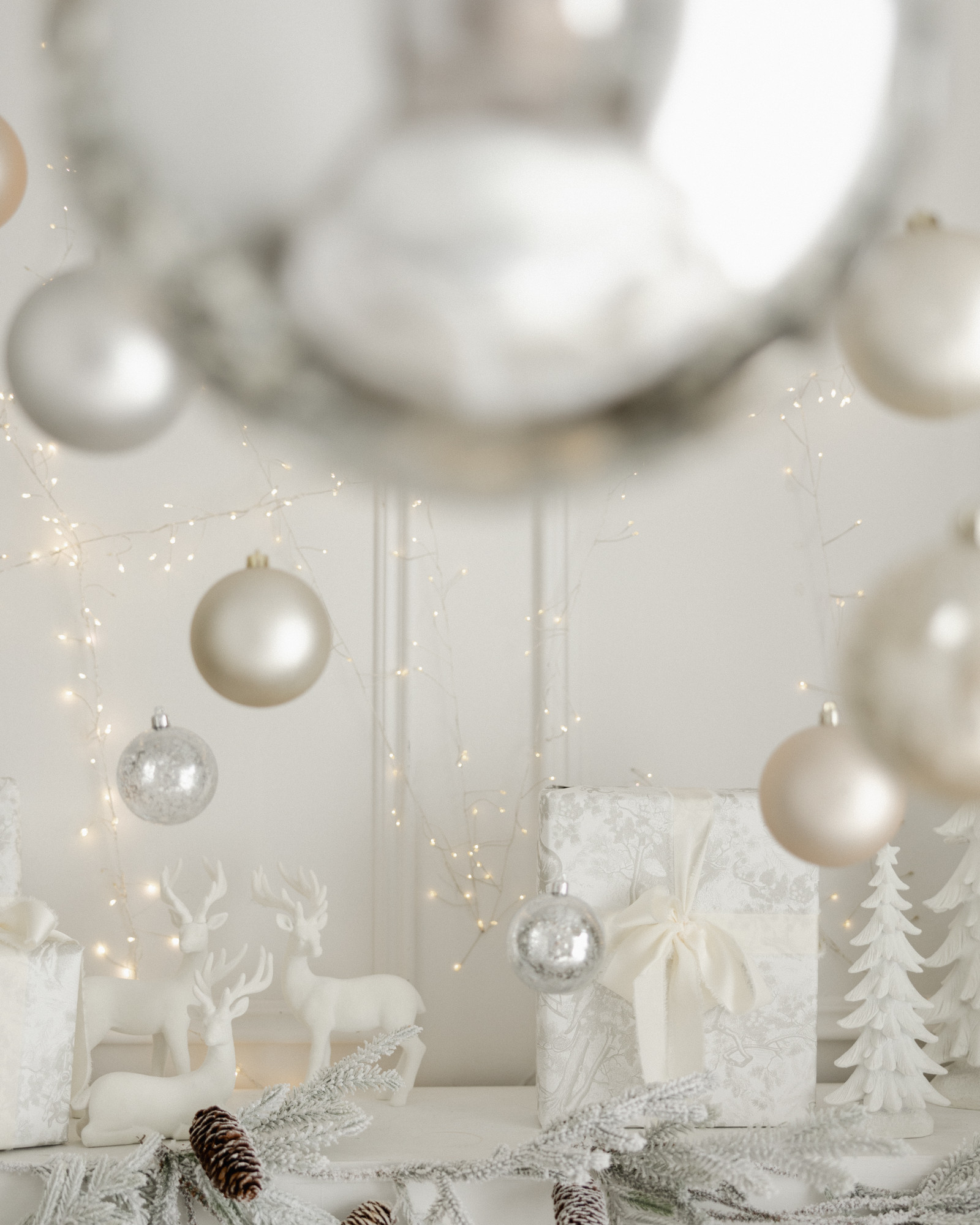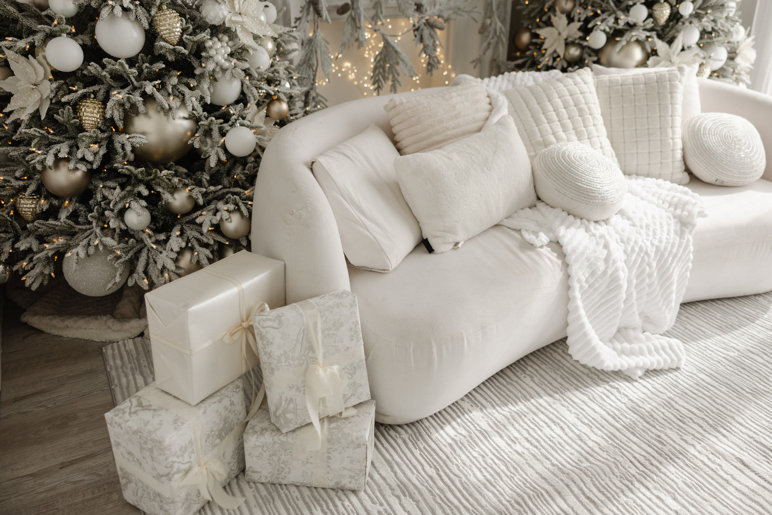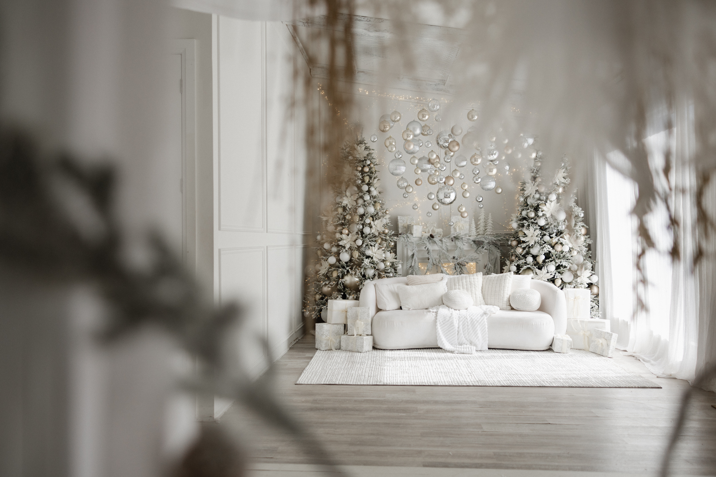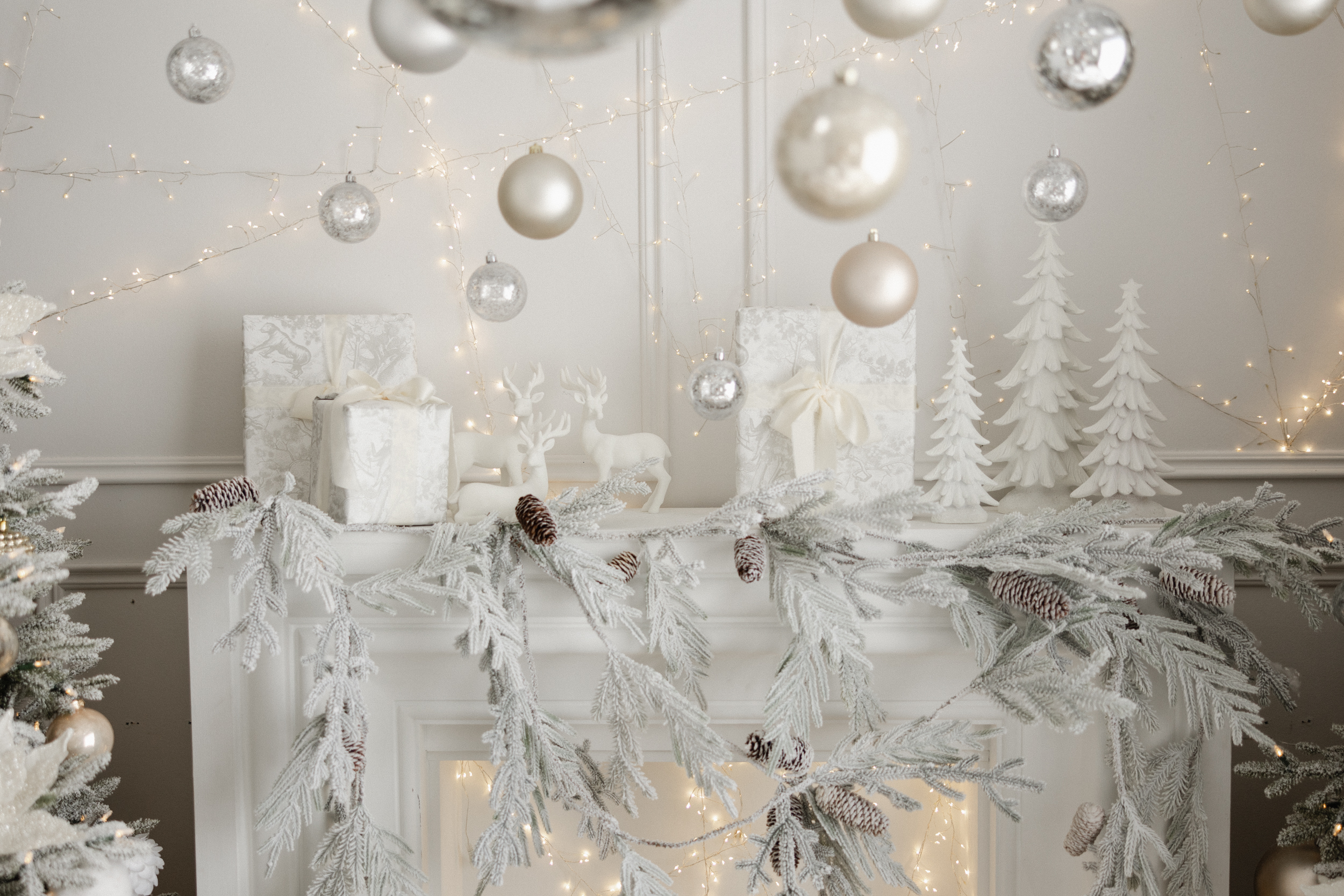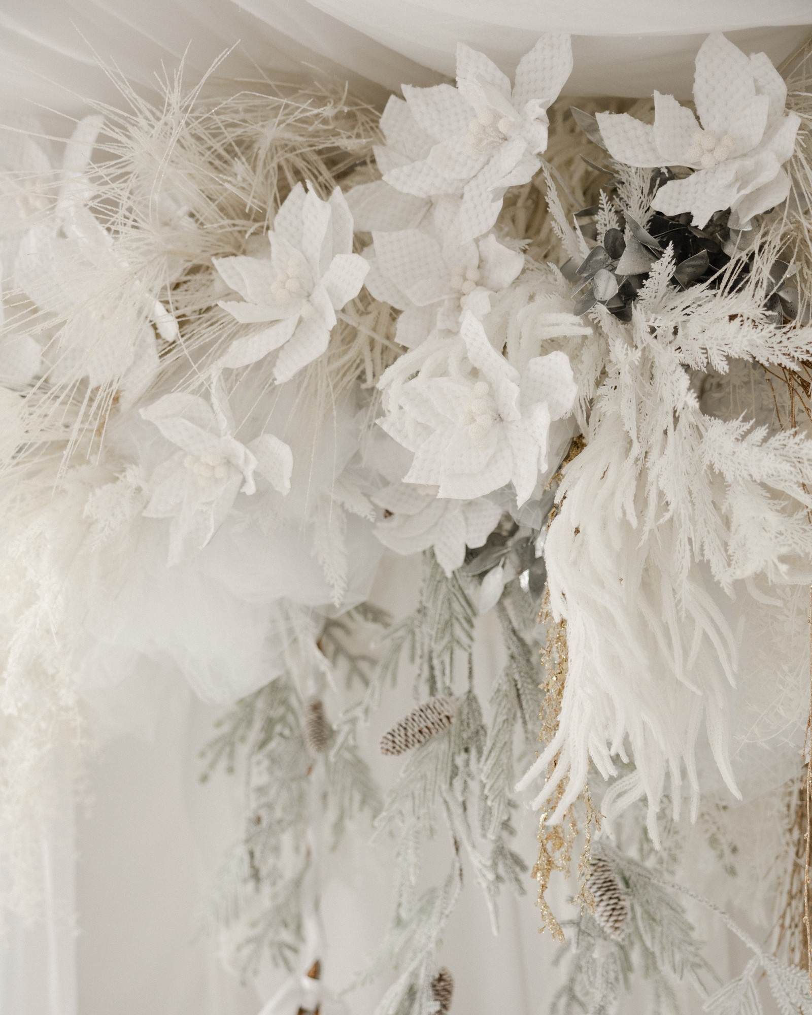 At its center, a cozy white lounge is framed by two flocked Christmas trees, dressed with oversized baubles in ivory, champagne, and soft metallics. Beautifully wrapped gifts, delicate garlands, and festive textures layer in magic and sophistication – perfect for family portraits, children’s milestones, or holiday campaigns. A fully adorned white swing adds a whimsical touch, offering variety and playful charm.