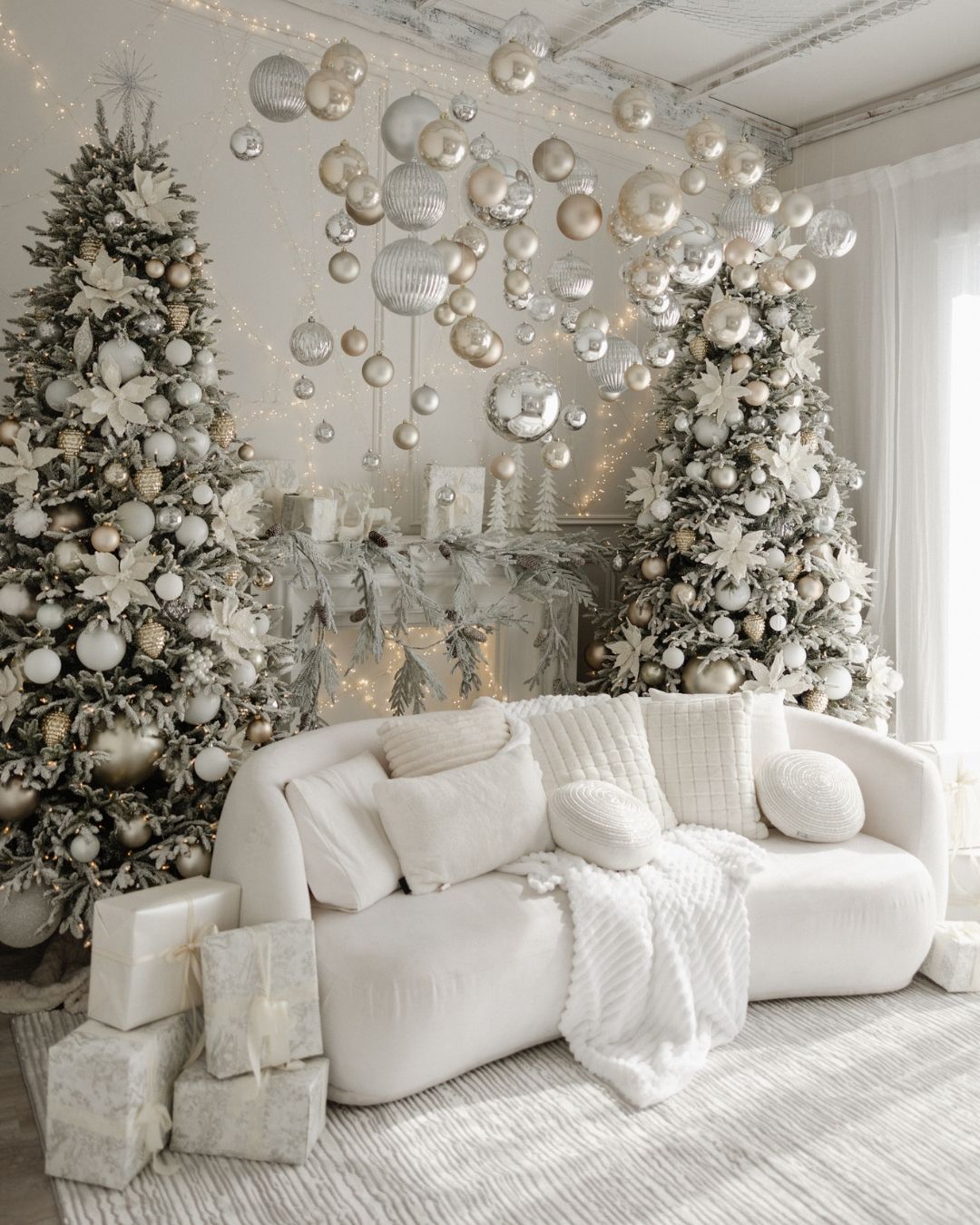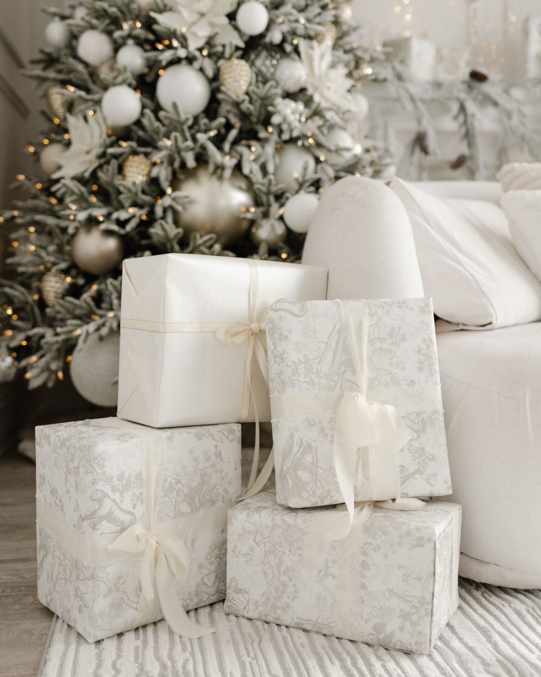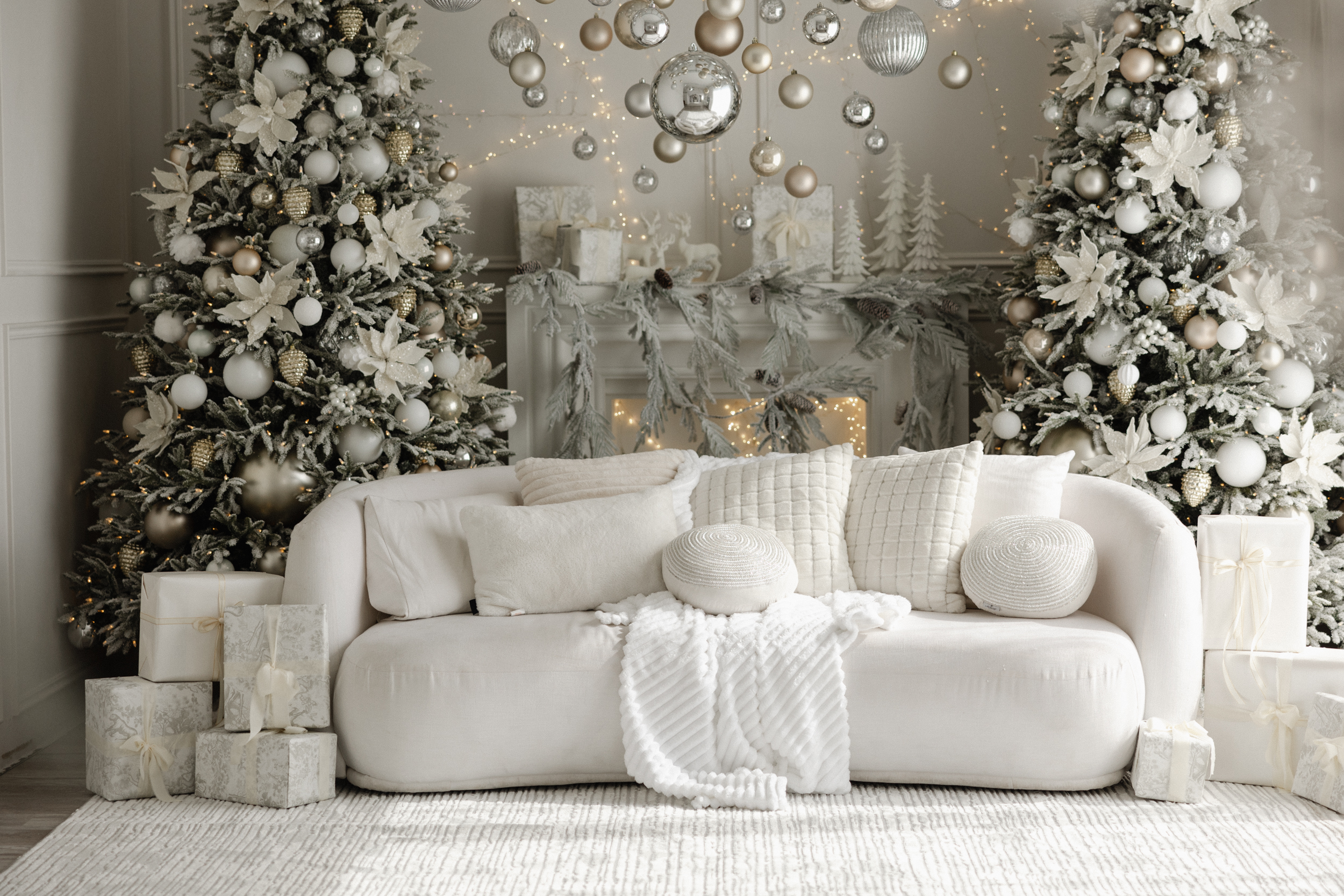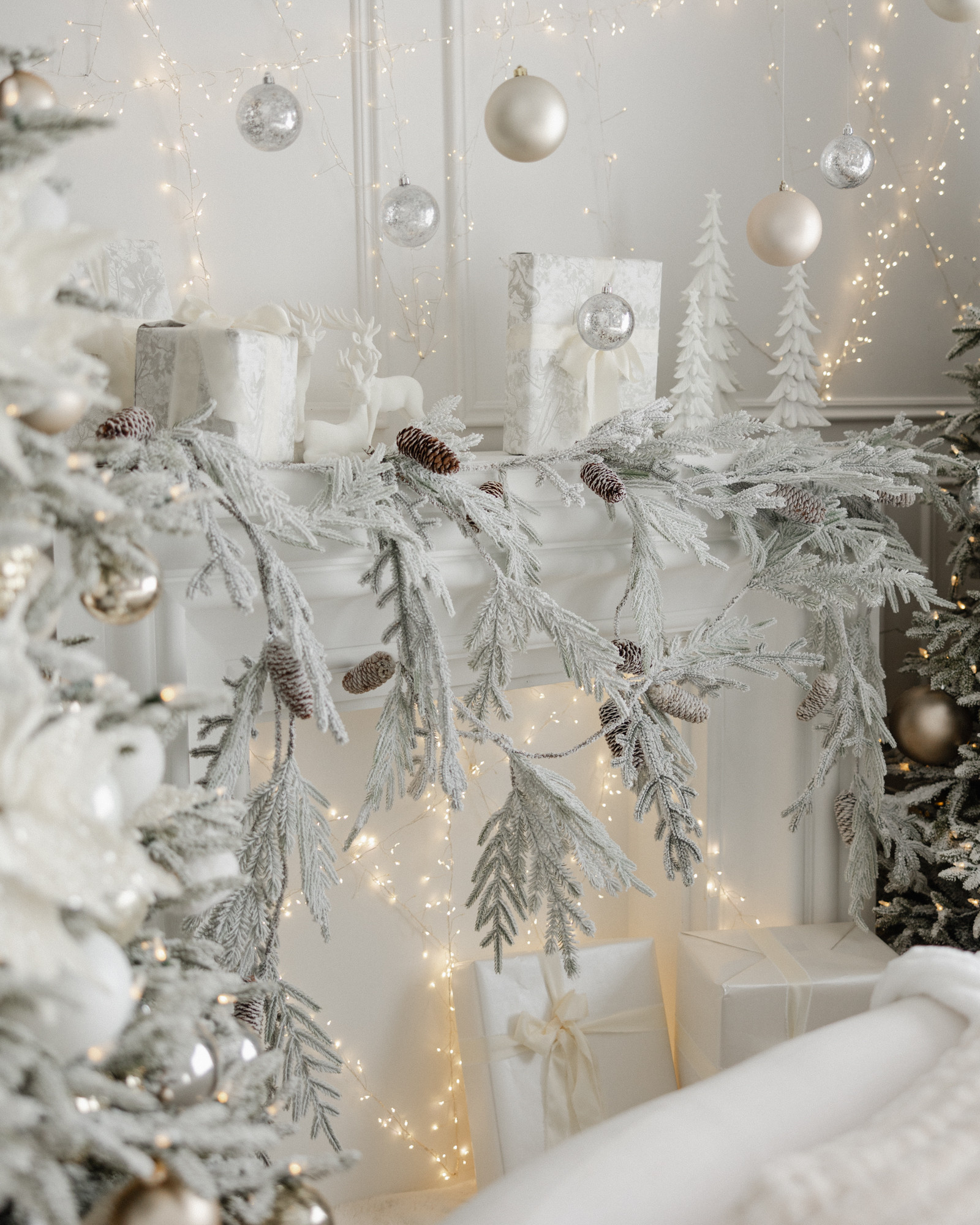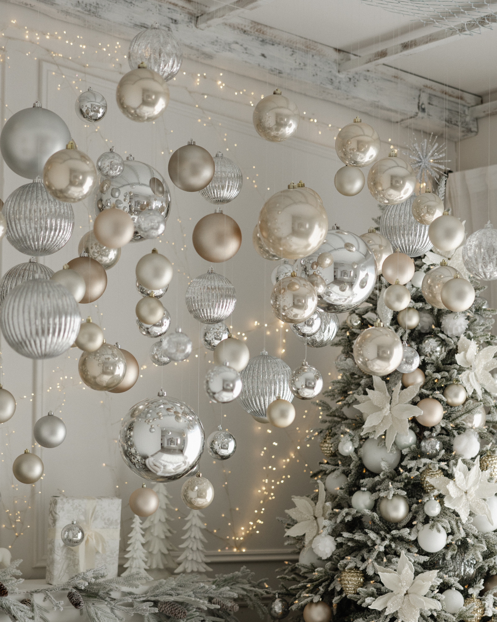 At its center, a cozy white lounge is framed by two flocked Christmas trees, dressed with oversized baubles in ivory, champagne, and soft metallics. Beautifully wrapped gifts, delicate garlands, and festive textures layer in magic and sophistication – perfect for family portraits, children’s milestones, or holiday campaigns. A fully adorned white swing adds a whimsical touch, offering variety and playful charm.