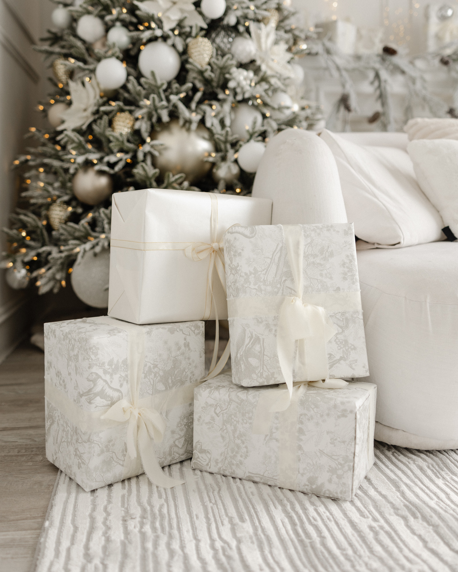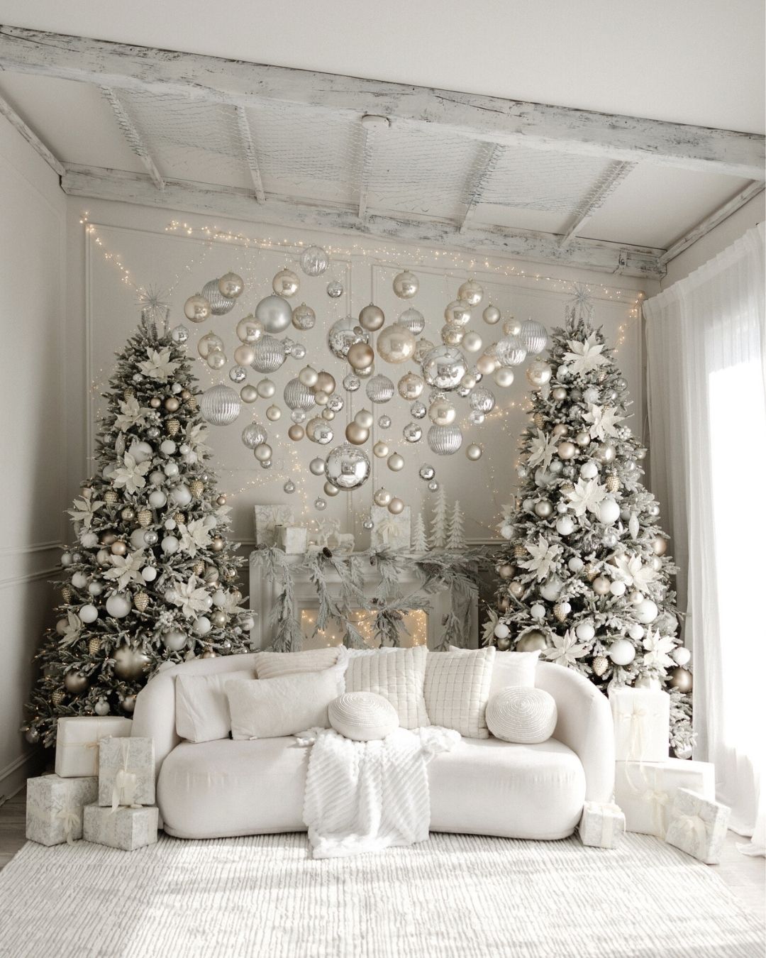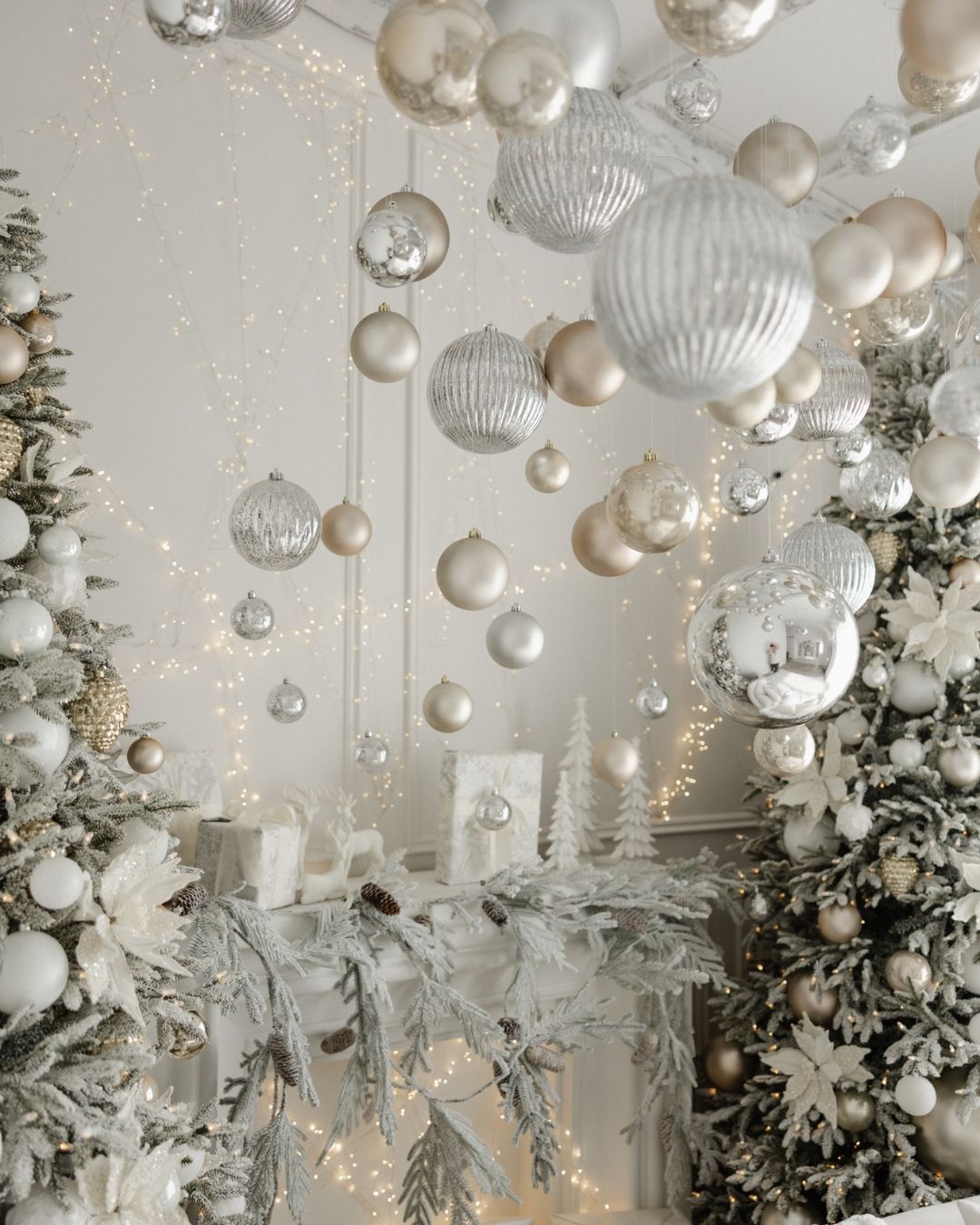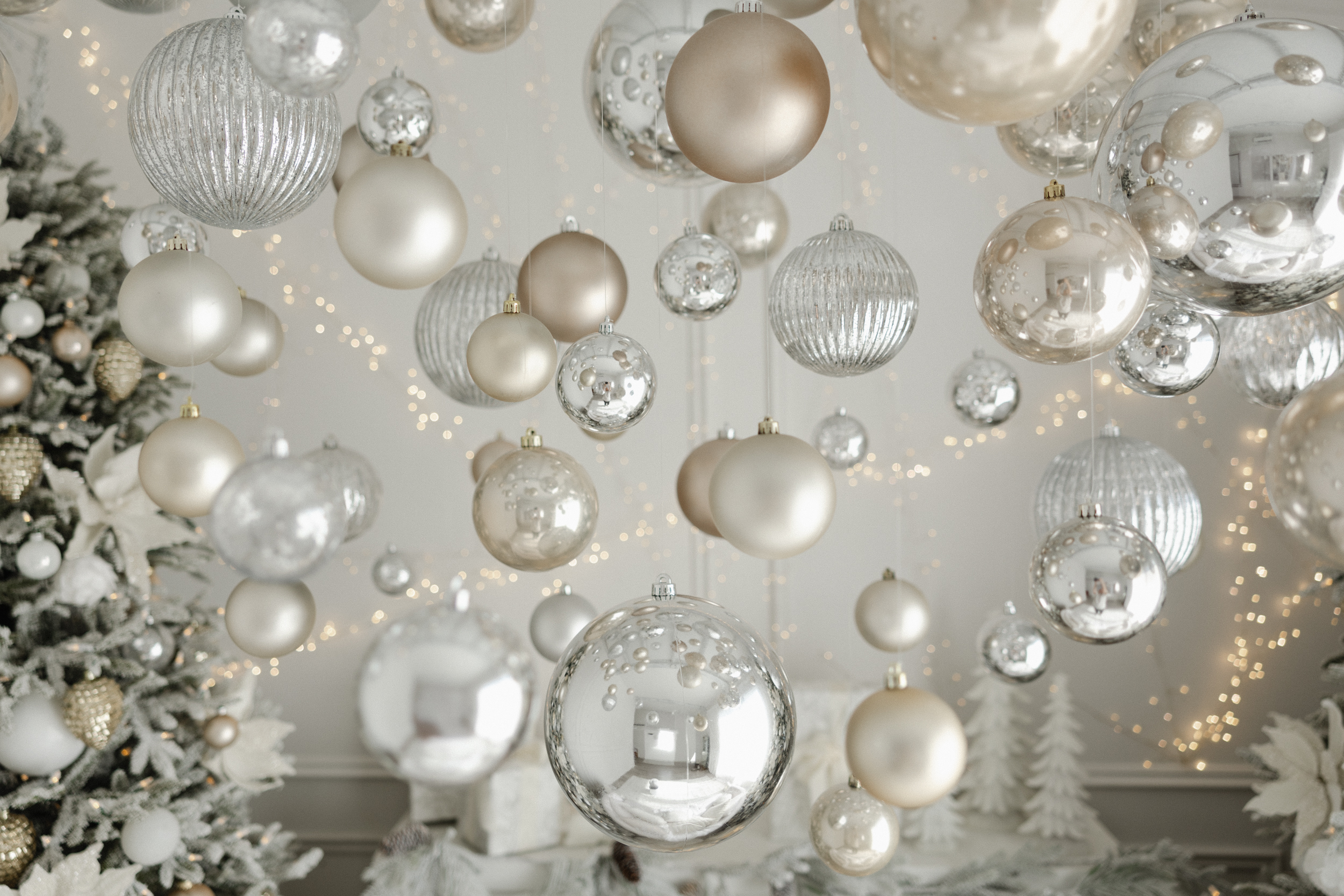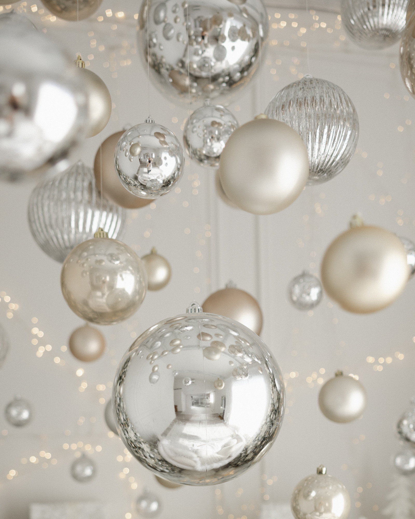At its center, a cozy white lounge is framed by two flocked Christmas trees, dressed with oversized baubles in ivory, champagne, and soft metallics. Beautifully wrapped gifts, delicate garlands, and festive textures layer in magic and sophistication – perfect for family portraits, children’s milestones, or holiday campaigns. A fully adorned white swing adds a whimsical touch, offering variety and playful charm.